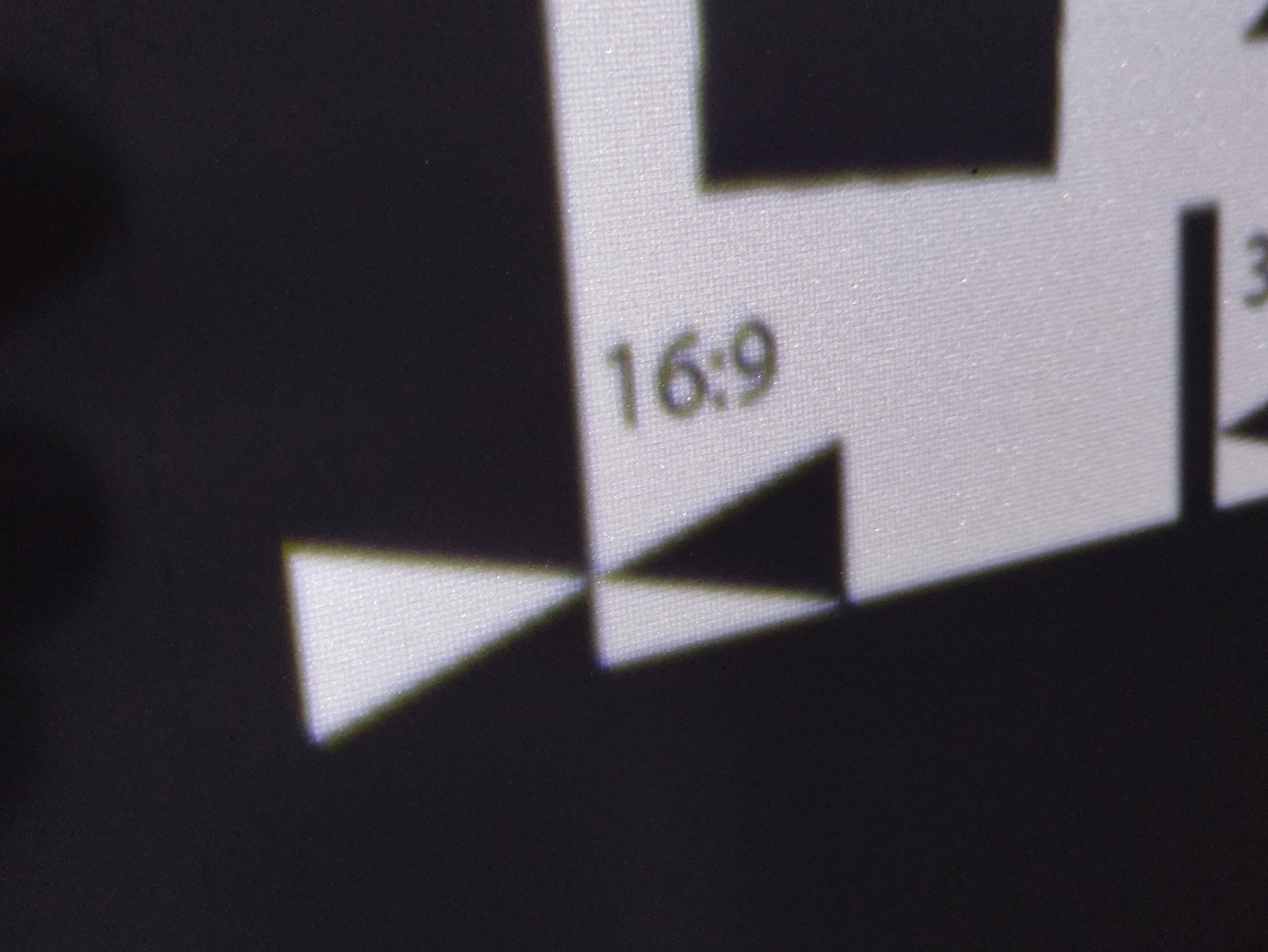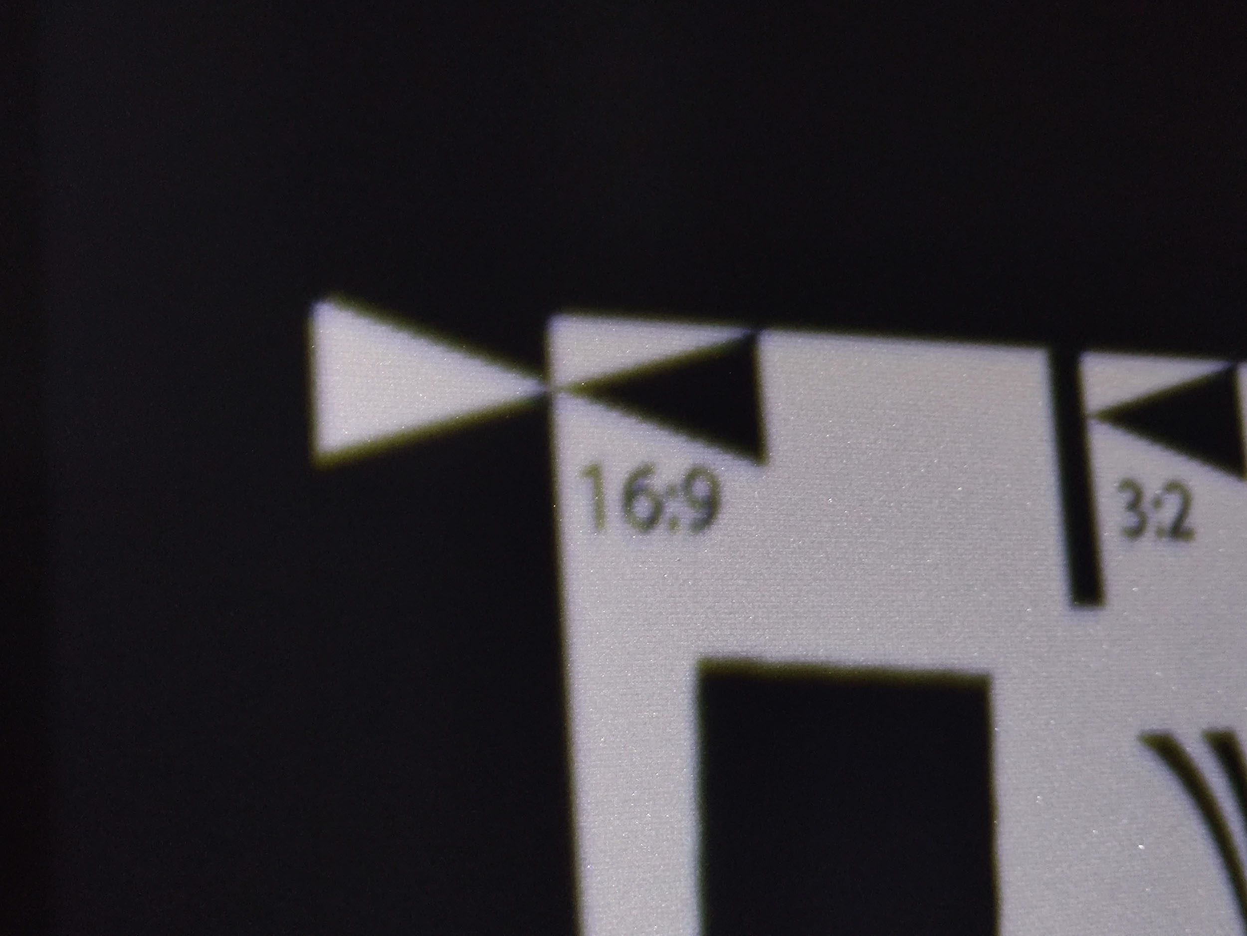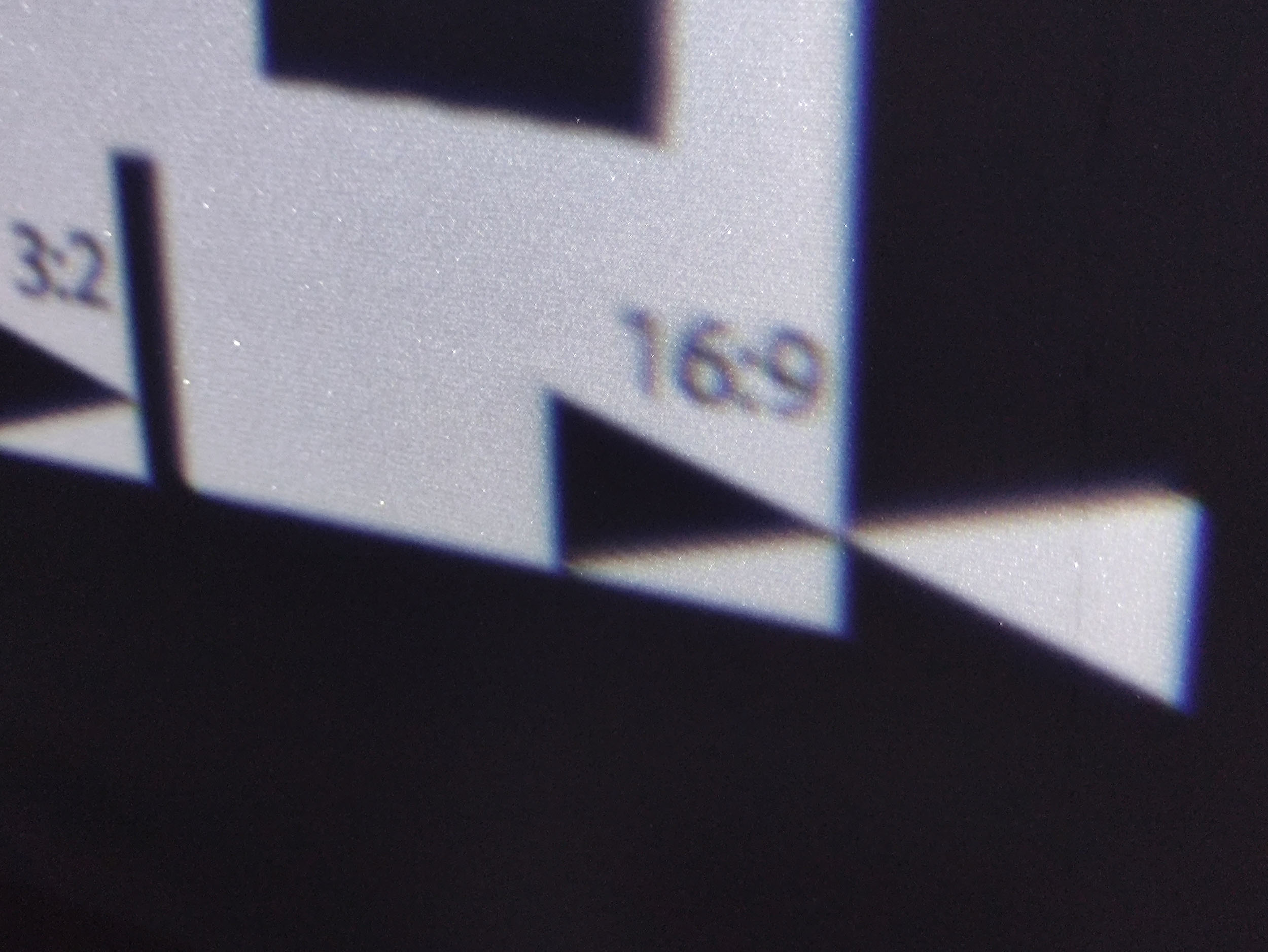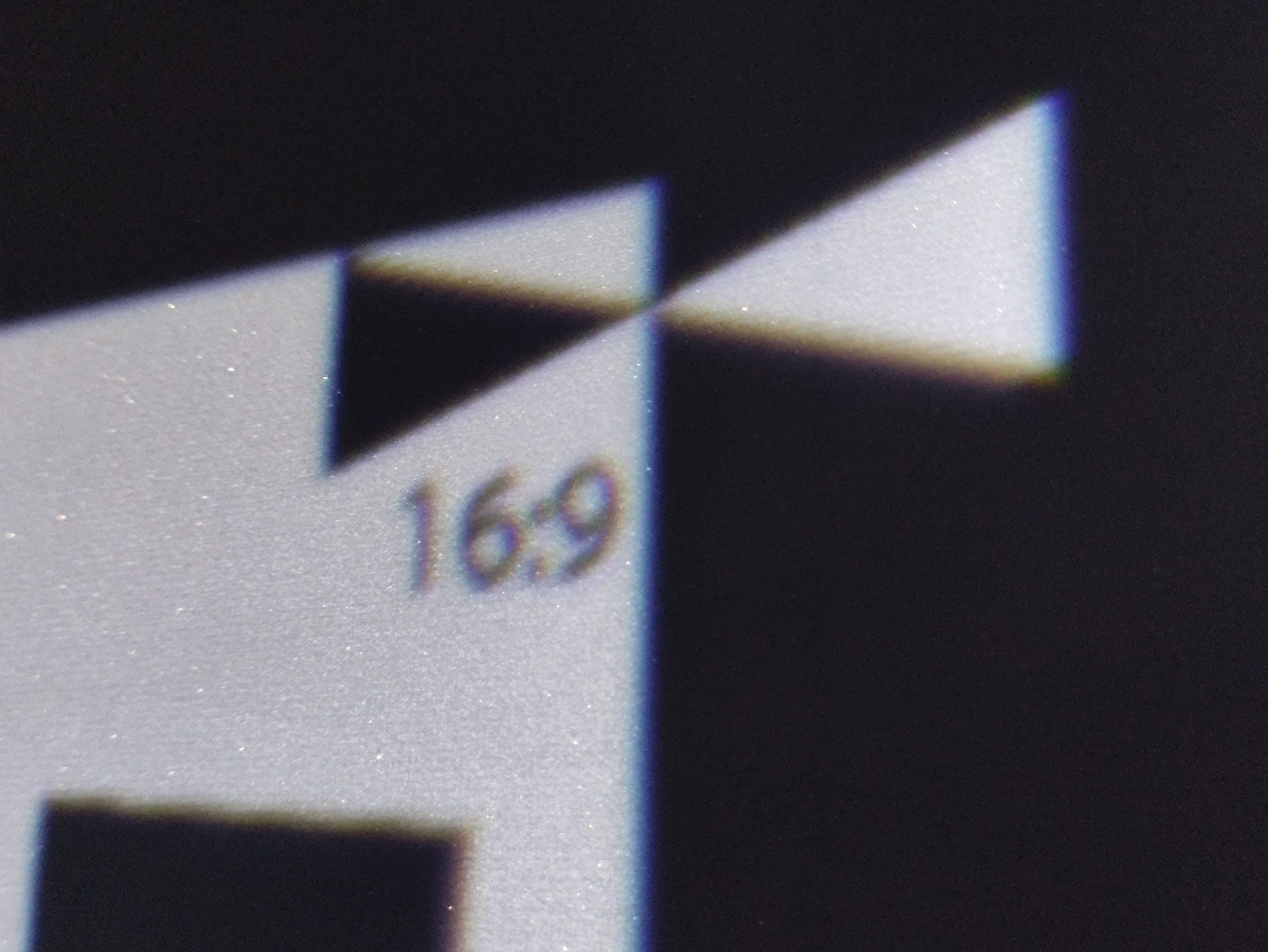 Je m'attendais à retrouver ce problème de netteté circulaire comme sur les autres projecteurs de ce type mais ce n'est pas le cas. La netteté ne se dégrade pas de façon circulaire, elle se dégrade sur un axe horizontal où je ne suis pas parvenu à obtenir une netteté équivalente des deux cotés de l'image. Si j'obtiens une image nette à droite, c'est la gauche qui perd en netteté et vice-versa. J'ai pourtant essayé de placer le projecteur dans un axe perpendiculaire par rapport à l'écran, j'ai désactivé les corrections en trapèze mais malgré tous mes essais, je ne suis pas parvenu à obtenir une image nette et uniforme de bout en bout. J'ai pris ci-dessous une photo des cadres coins et on voit que la netteté n'est pas uniforme.