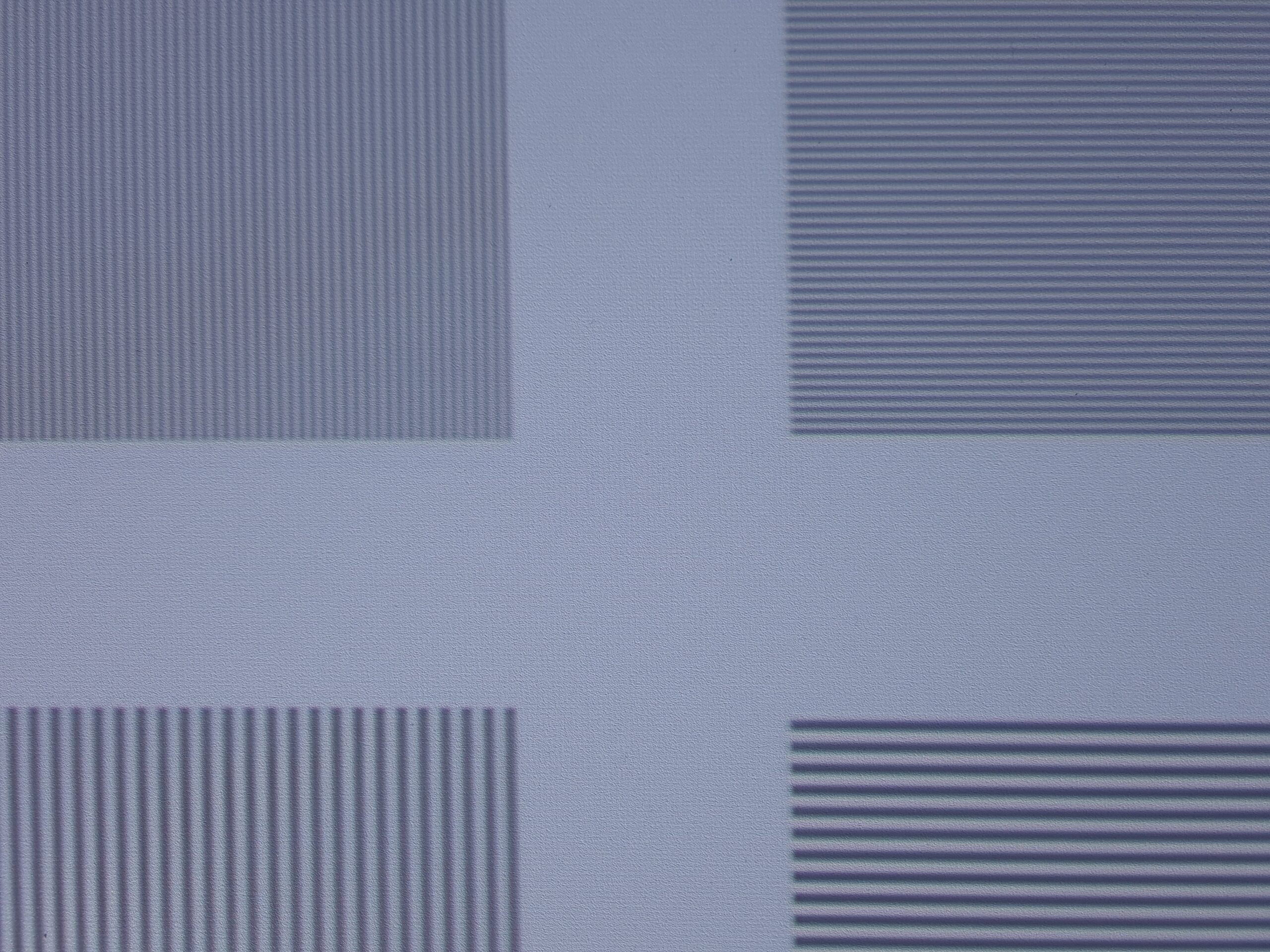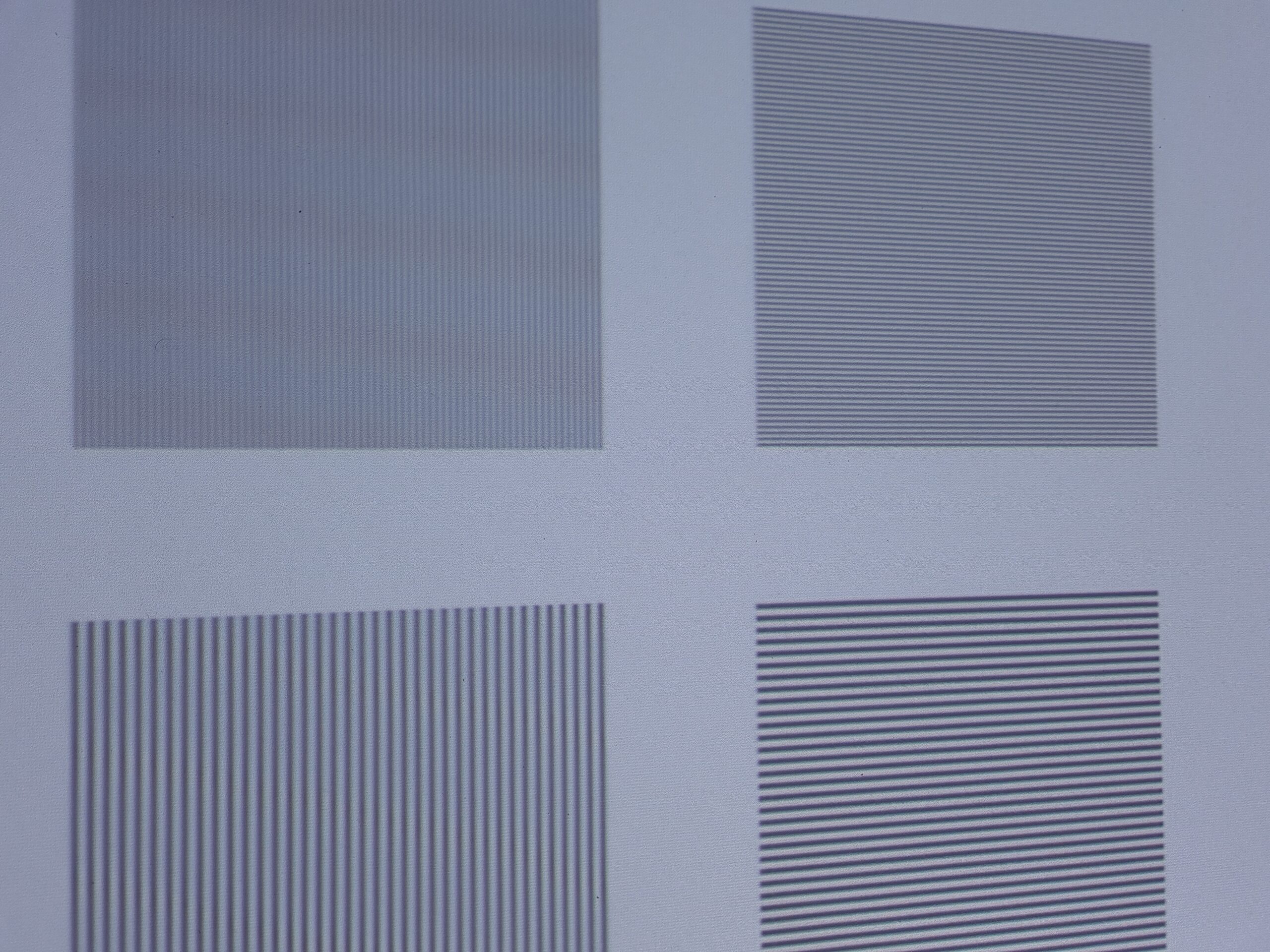 Pour obtenir une netteté parfaite et uniforme, j'ai du faire une mise au point manuelle. La procédure n'a rien de compliqué, quelques clics sur la télécommande suffise pour obtenir un bon résultat. J'ai photographié les lignes de netteté aux quatre coins de l'image et la distinction entre les lignes est toujours visible.