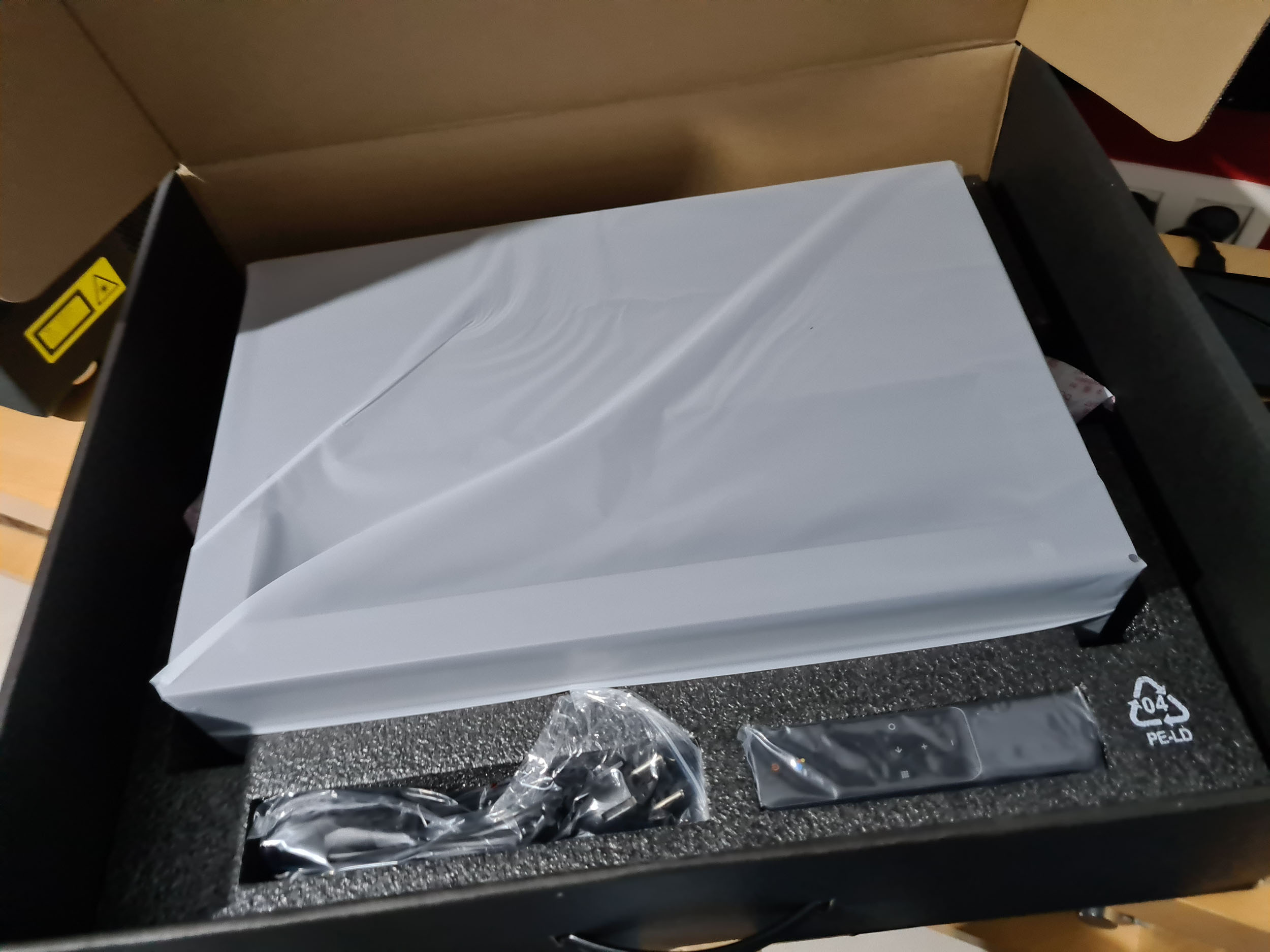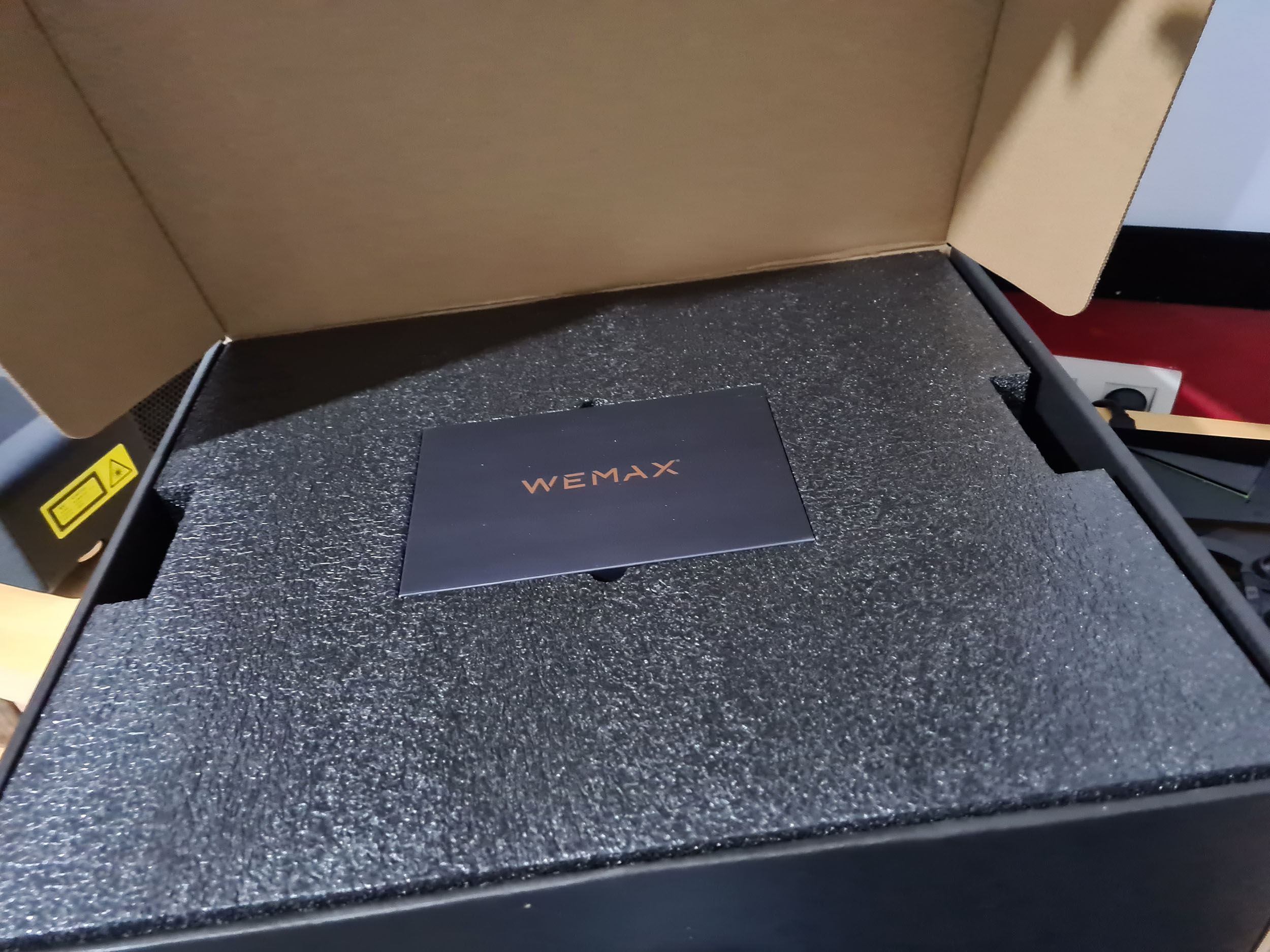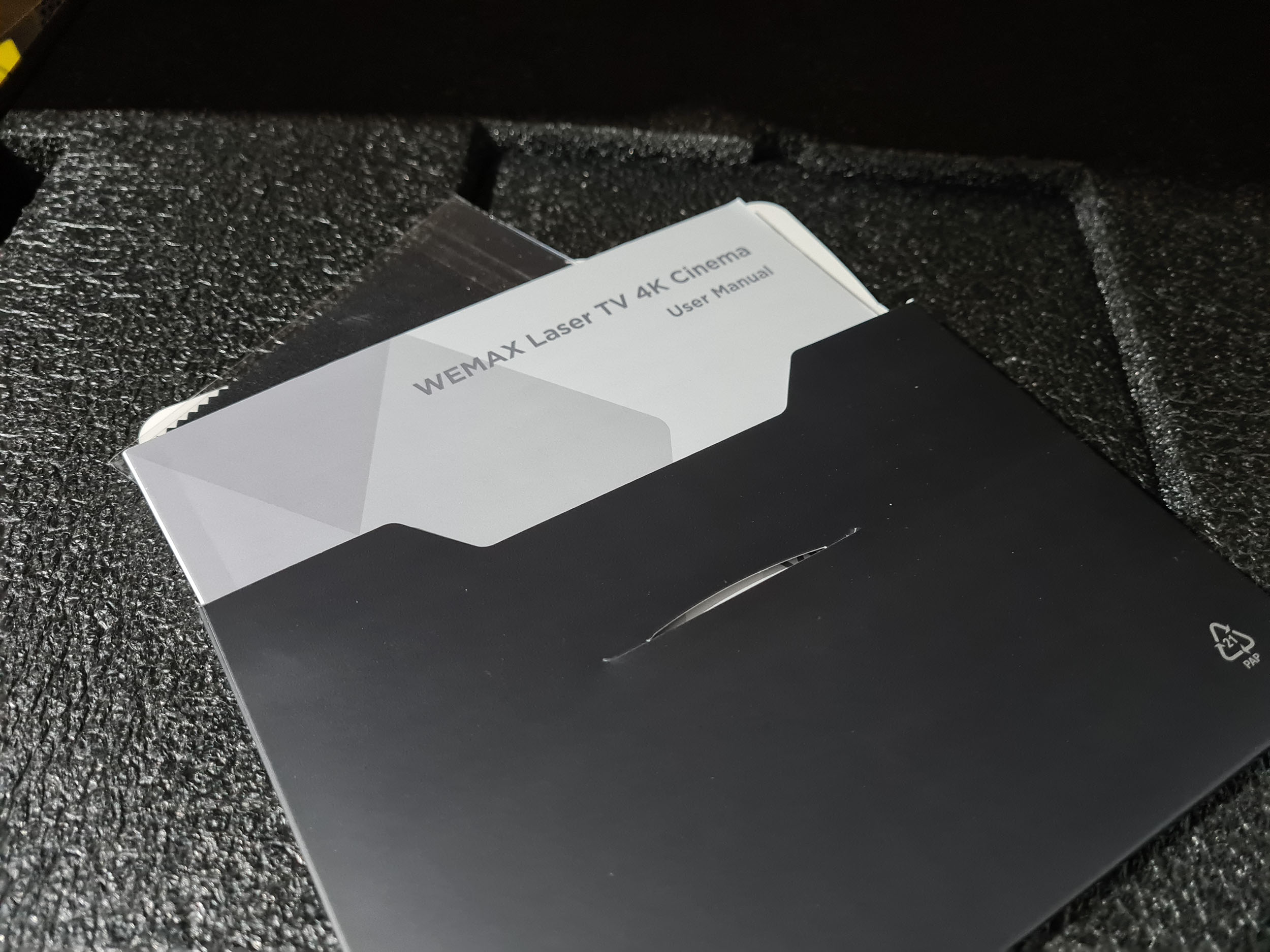Le Wemax Nova est emballé dans une boite en carton assez sobre, elle est assez plutôt imposante mais principalement parce que le projecteur est bien protégé par une épaisse couche de mousse noire. La boite contient le projecteur, une télécommande (sans piles), un adaptateur secteur, un manuel et un chiffon pour enlever la poussière du faisceau laser.