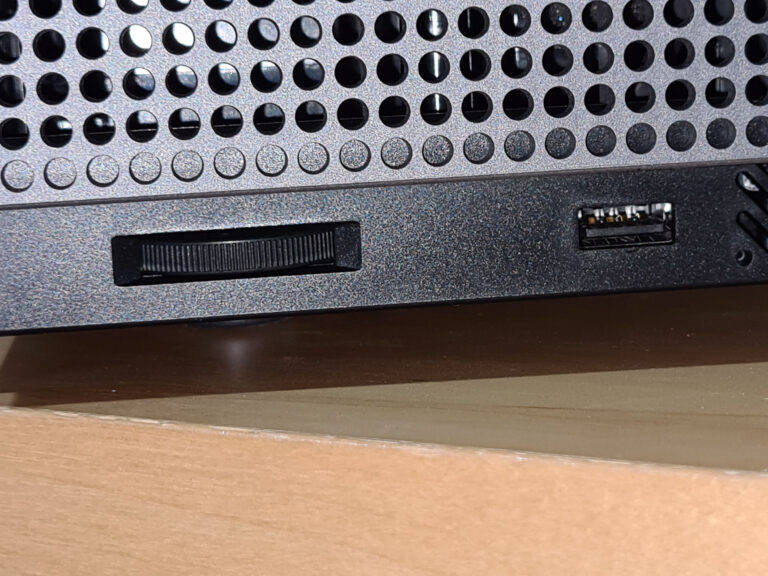 Sur les côtés on retrouve une petite roulette qui permet de régler la hauteur des pieds du projecteurs (il y en a 2 à l'avant), sur le côté droit il y a également un port USB mais vu que ce port USB est bien caché, je ne suis pas sûr qu'il soit utilisable, il s'agit probablement d'un port USB pour de la maintenance, je dois encore le tester.