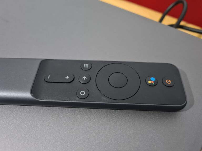 La télécommande est quasi-identique à celle du Xiaomi Laser Cinema 2, la position des boutons est identique, les boutons home/paramètres sont inversés. La télécommande a besoin de 2 piles AAA pour fonctionner et ces piles ne sont pas fournies dans l'emballage d'origine.