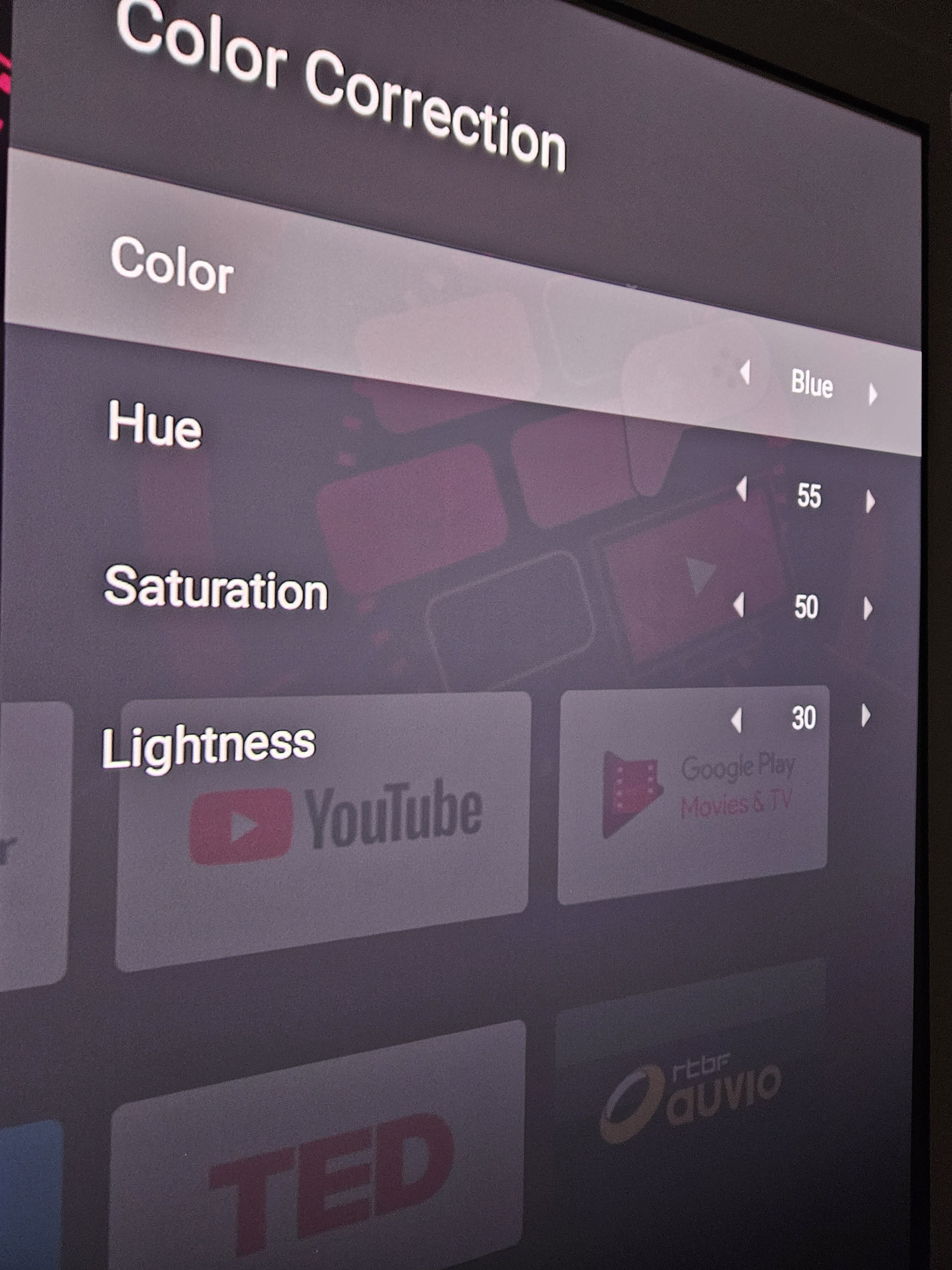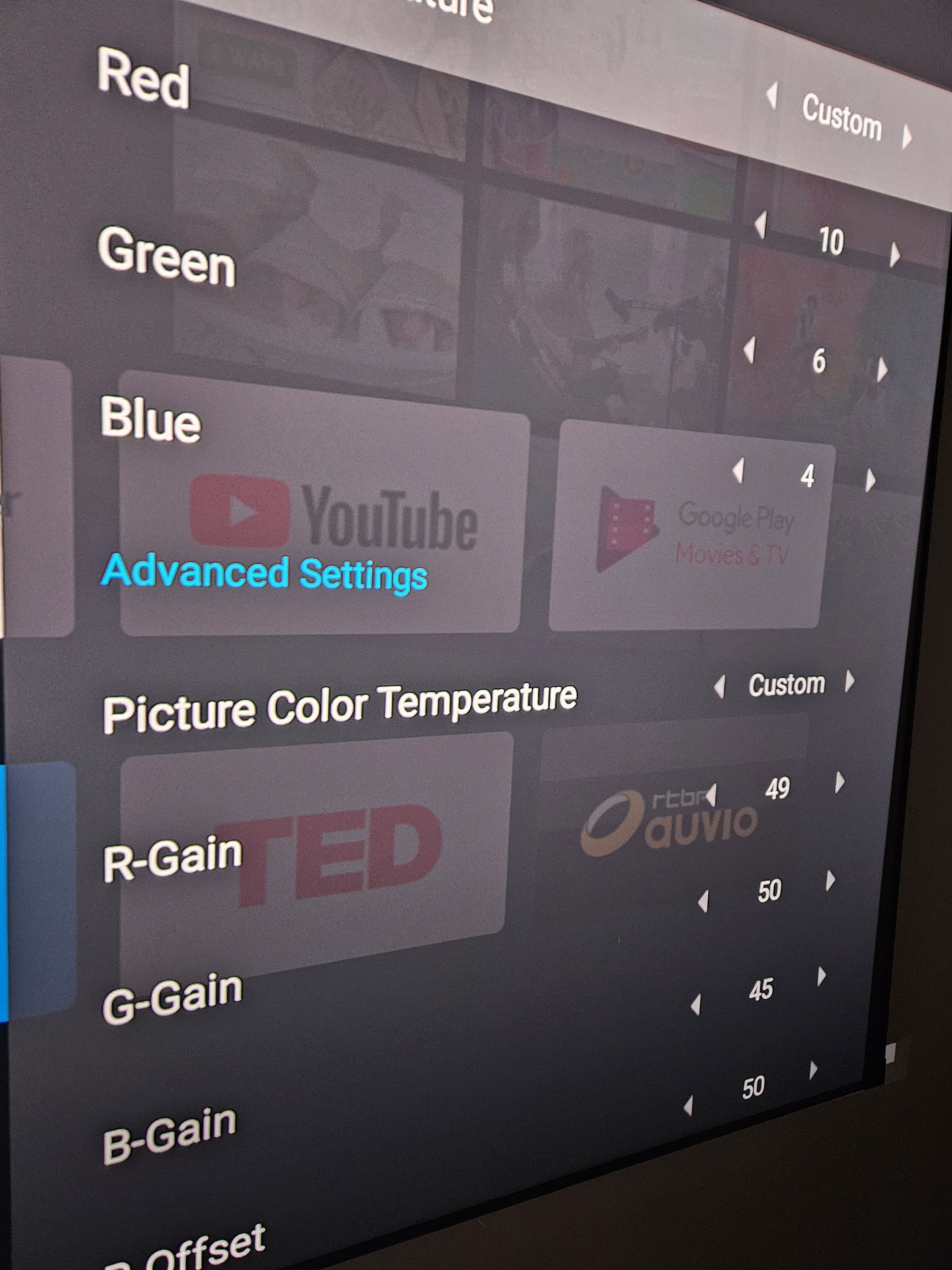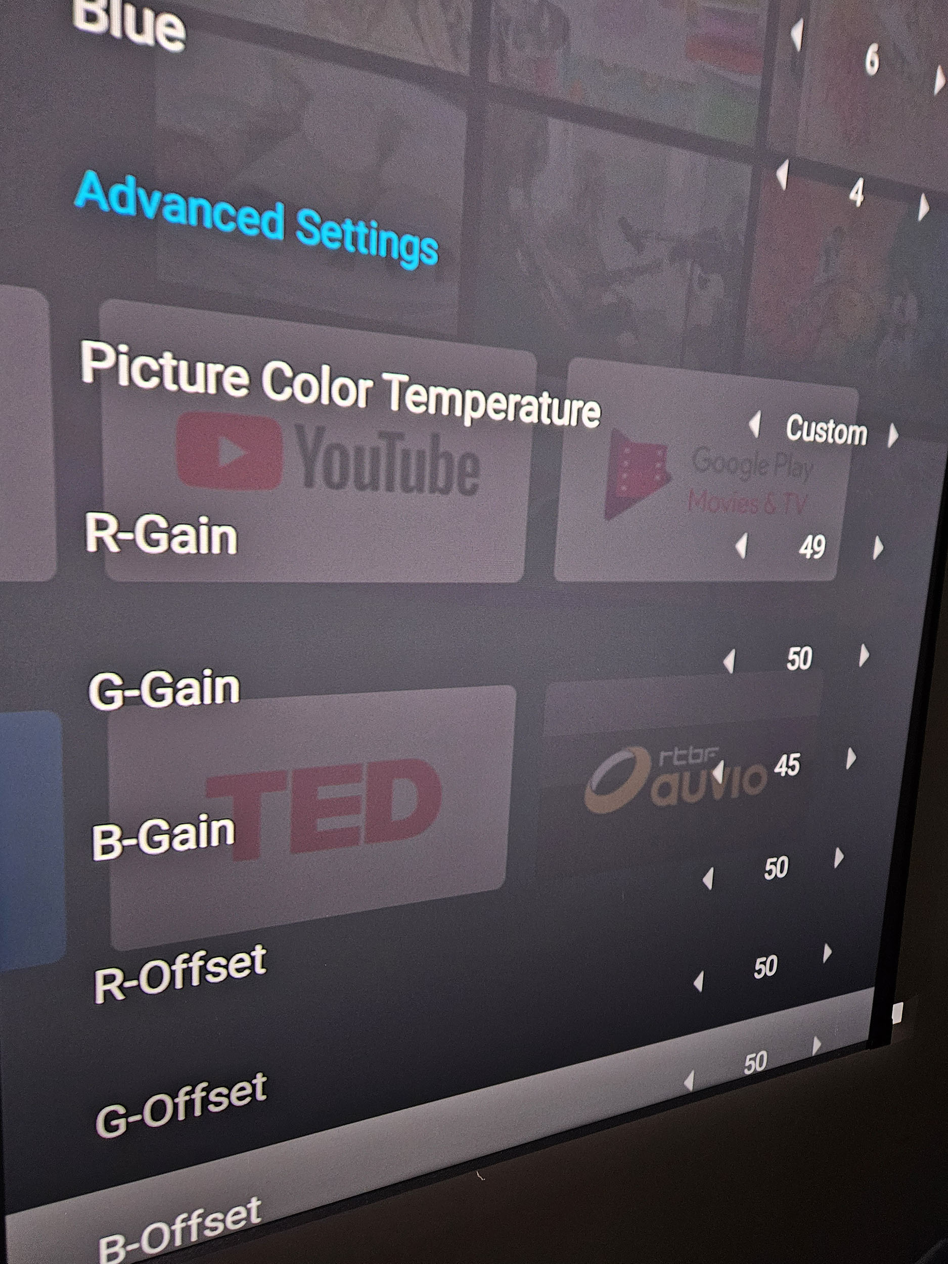 J'ai modifié les paramètres pour essayer d'obtenir un meilleur résultat que le mode cinéma et j'y suis parvenu avec les paramètres que je vais vous partager ci-dessous. Vous pouvez vous inspirer de ces paramètres si vous utilisez un écran gris. Si par contre, vous utilisez un écran blanc, vous allez devoir augmenter un peu les niveaux de bleu.