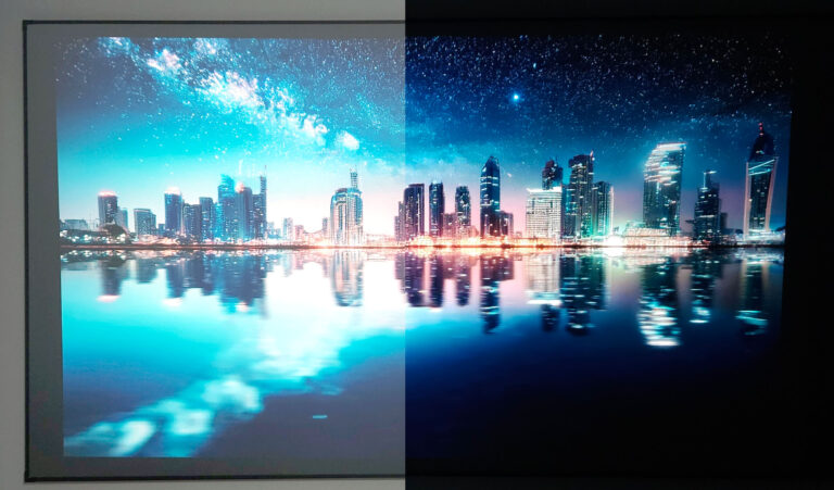 Vous voyez ici la différence entre une pièce sombre et une pièce éclairée. Oui l’image est visible mais il y a une perte de contraste. J’utilise pourtant un bon écran ALR. La perte de contraste serait encore plus visible sur un écran blanc.