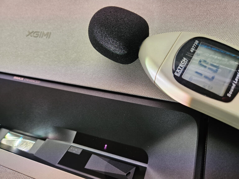 Le XGIMI Aura 2 émet un léger ronronnement tant qu'il est utilisé à un niveau de luminosité de 10 ou moins. Si je pose mon décibelmètre sur le projecteur avec le niveau de luminosité 10, l'appareil ne réagit même pas tellement le projecteur sait se montrer discret. Si vous utilisez le mode boost, le projecteur va devenir beaucoup plus bruyant avec plus de 60 dB.