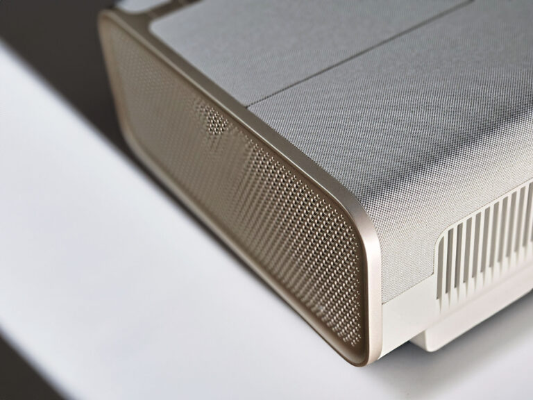 J'avais déjà remarqué l'introduction d'une teinte type "champagne" sur le Mogo 2 Pro mais c'est le XGIMI Horizon Ultra qui a apporté le plus gros changement. De l'aspect métallique et froid, XGIMI est passé à une utilisation de tons chauds avec des tissus pour recouvrir les surfaces les plus visibles. La façade supérieure de l'Aura 2 est intégralement recouverte de tissu et les bords sont ceinturés par une couche à effet métallique couleur champagne. La finition est excellente et elle ne laisse aucun doute sur le positionnement haut de gamme de ce projecteur.