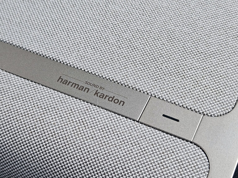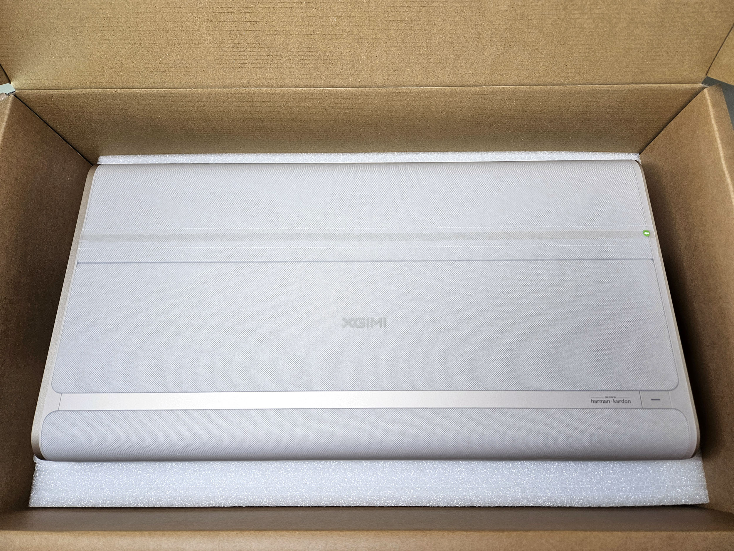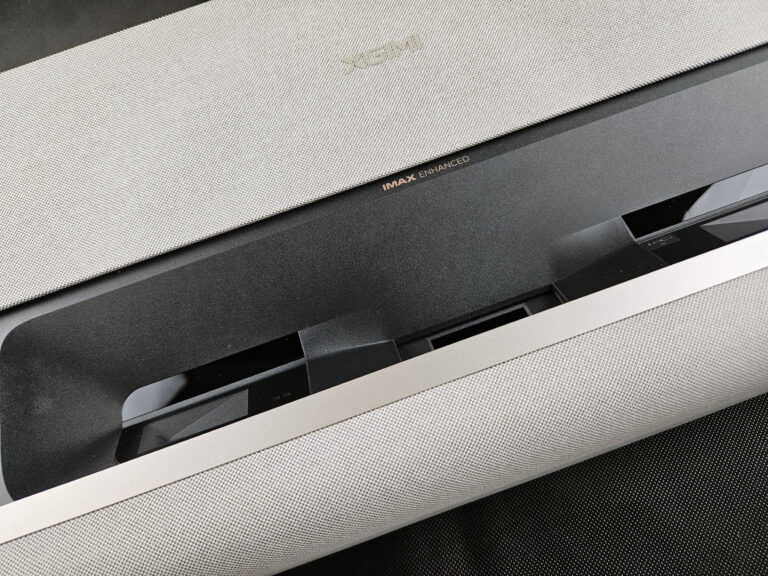 Comme d'habitude, XGIMI a fait appel à Harman-Kardon pour le rendu sonore et la mention de la marque s'intègre très bien dans le format du projecteur. Je trouve d'ailleurs que la marque XGIMI est moins bien mise en avant sur le projecteur car elle se noie dans la zone de tissu sur la partie supérieure du projecteur.