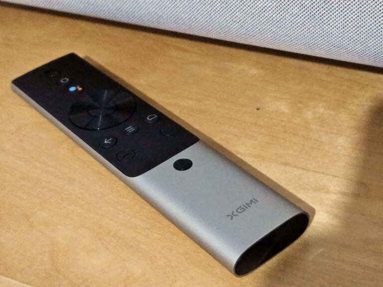 La télécommande reprend dans les grandes lignes les caractéristiques des autres télécommandes XGIMI. Cette version utilise un coffrage métallique comme pour la plupart des projecteurs haut de gamme XGIMI. La boite contient 2 piles AAA et elles s'insèrent par le bas. Attention, le tiroir à pile est monté sur des ressorts. Dès que vous appuyez sur le bouton pour l'ouvrir, il va littéralement s'éjecter de la télécommande.