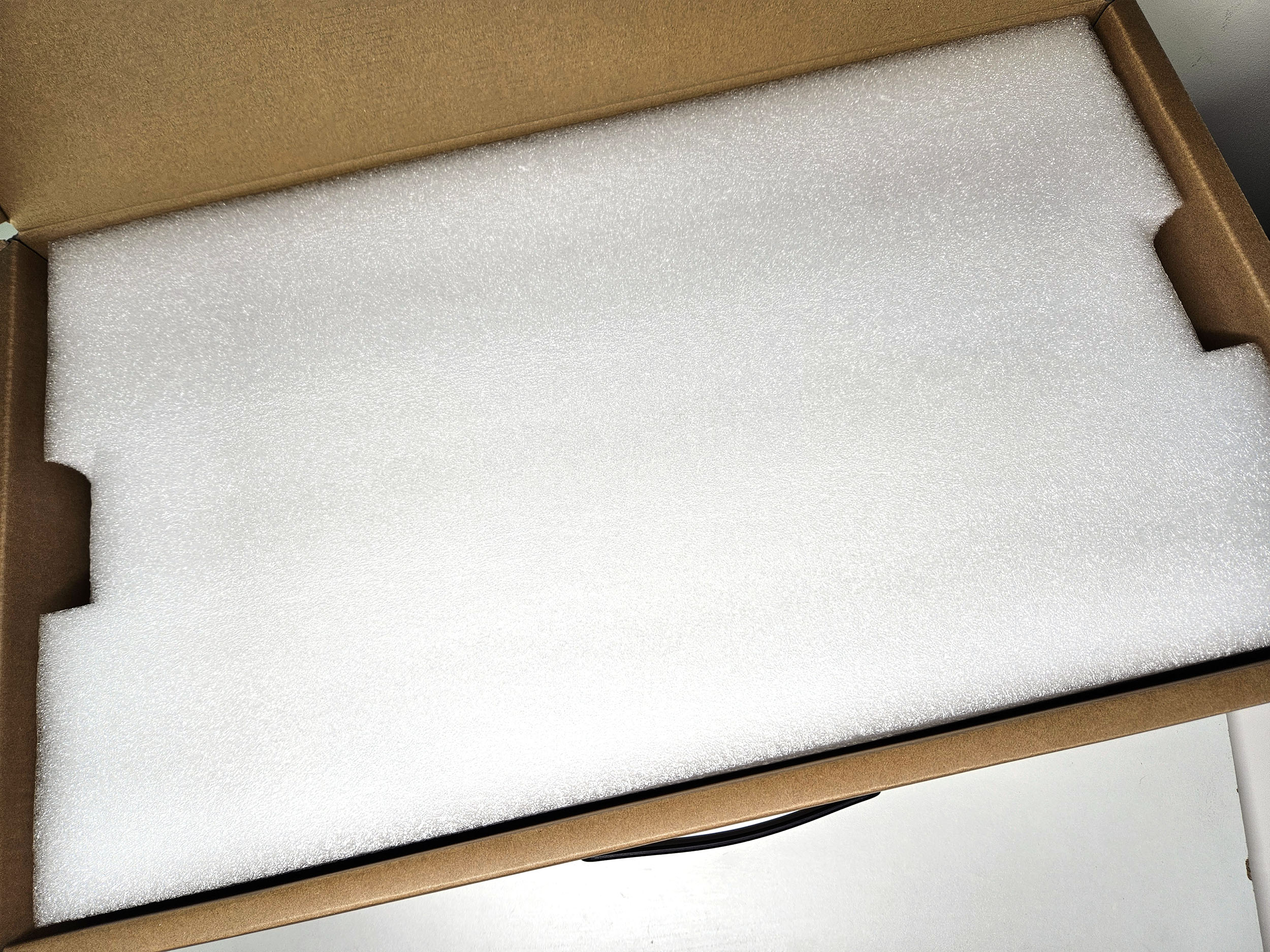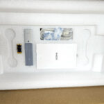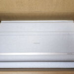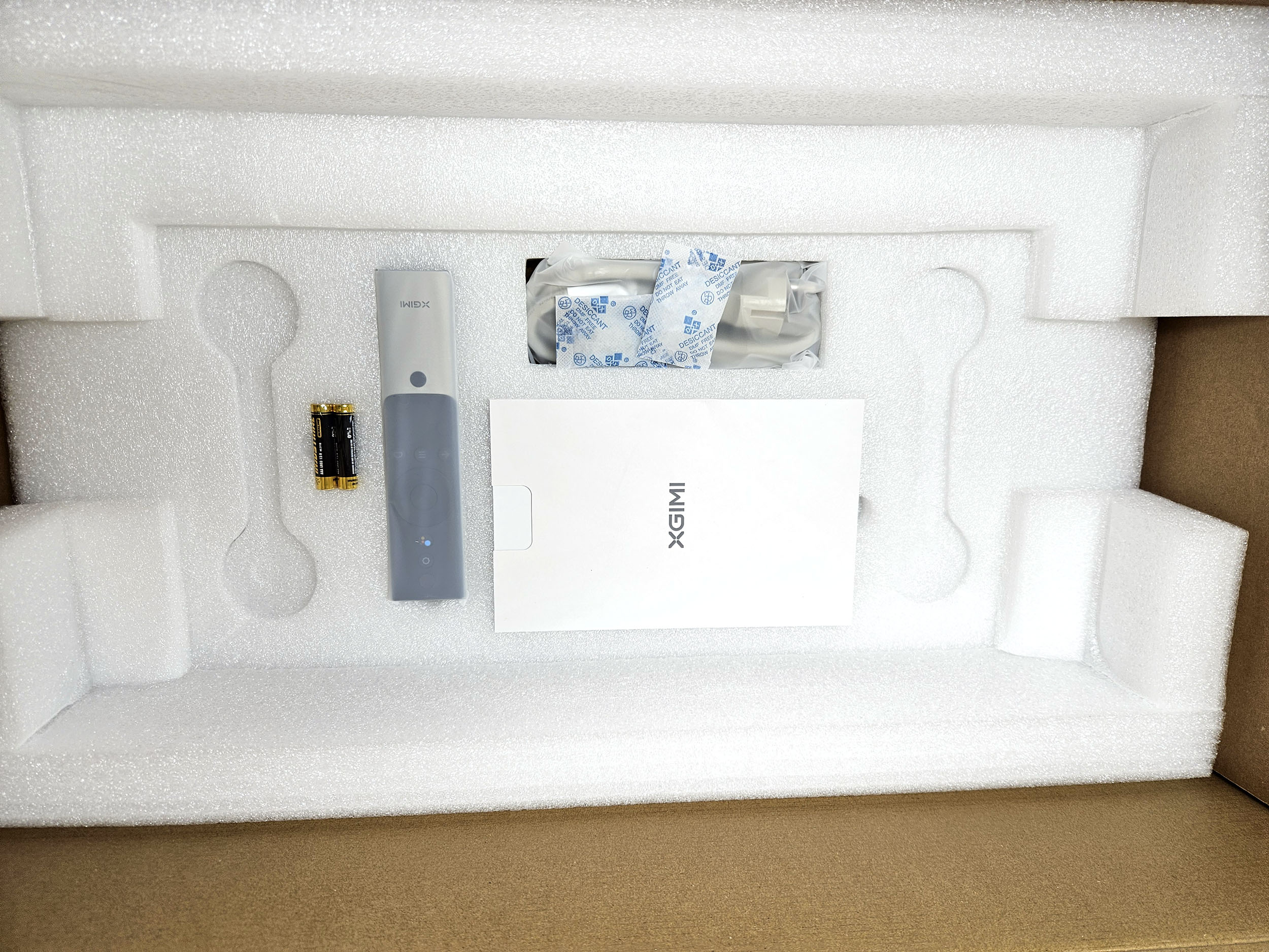 Le XGIMI Aura 2 est plus petit et plus léger que son prédécesseur mais la boite est malgré tout assez imposante. Le projecteur est protégé par une épaisse couche de mousse. La boite contient le projecteur, la télécommande, 2 piles AAA, un manuel et un cable d'alimentation.