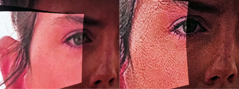 Le mode triple laser fait ici un peu mieux que le mode dual light. La luminosité du noir joue un grand rôle dans la perception de la profondeur. J’ai mesuré un noir à 0,08 cd/m² avec mon écran gris et 0,6 cd/m² sur mon écran blanc. Ces valeurs montrent à quel point un écran peut influencer le noir. Vous pourriez même avoir un meilleur contraste sur un écran blanc, mais au prix d’un éclairage global trop important.