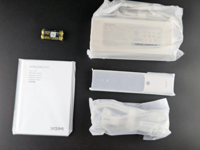 La boite du XGIMI Horizon S Pro est assez imposante par rapport à la taille du projecteur. C'est principalement la couche de protection qui ajoute du volume. Le projecteur est livré avec une télécommande, deux piles AAA, un manuel en plusieurs langues, un énorme bloc d'alimentation et un cable d'alimentation.
