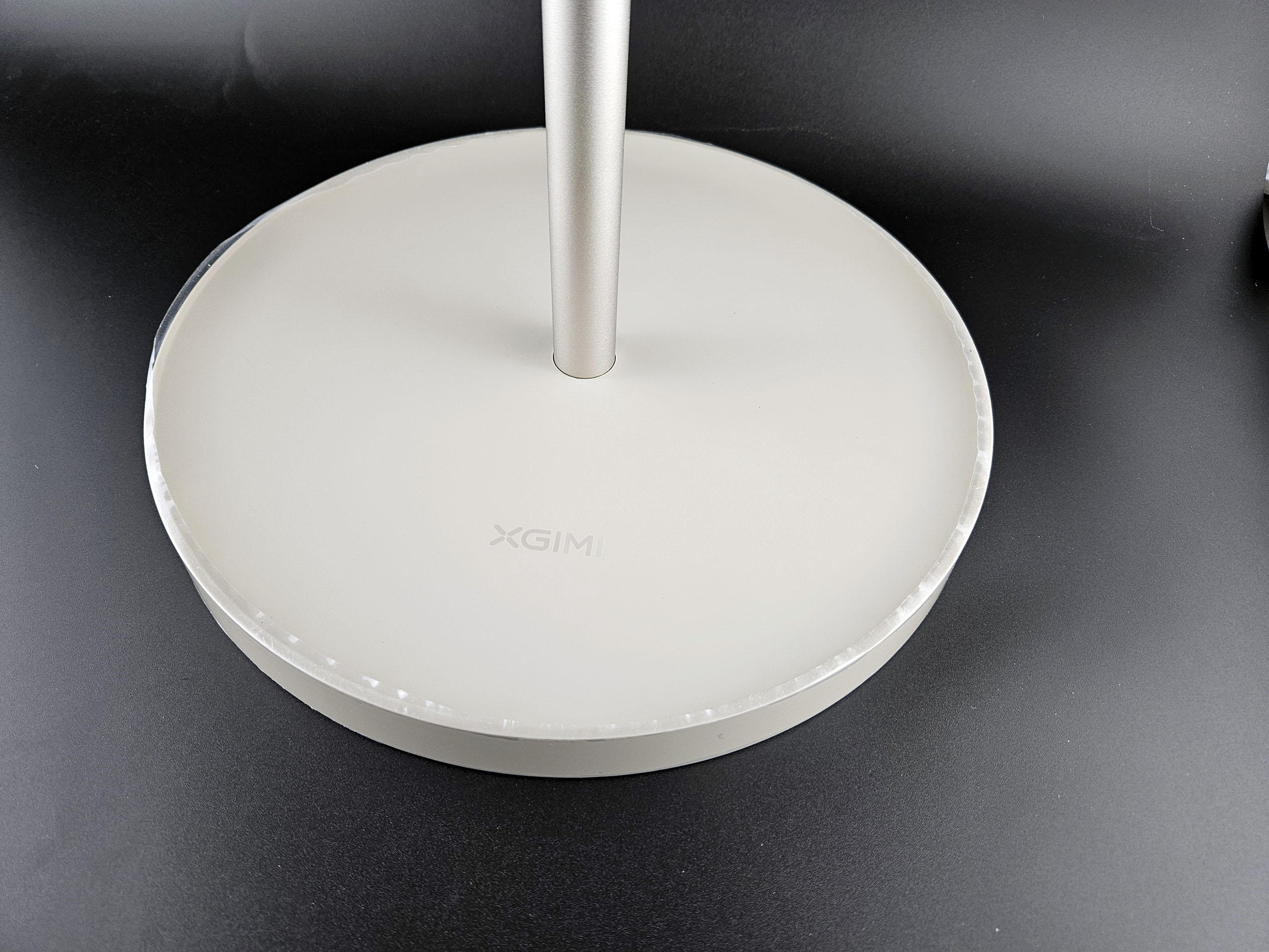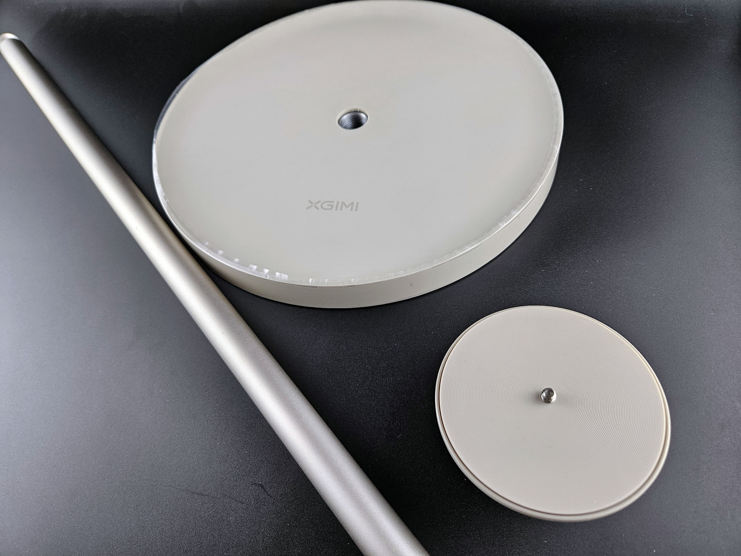 J'ai également reçu un trépied XGIMI spécialement conçu pour la gamme Horizon. Ce trépied est composé d'une base circulaire assez lourde pour assurer une stabilité au projecteur. Il y a ensuite une tige métallique d'environ 70 cm qu'il faut visser dans la base. Le projecteur se fixe sur un support spécialement adapté qu'il faut attacher à la partie supérieure de la tige. J'ai testé ce trépied et il fonctionne très bien, il est assez stable pour garder le projecteur en place. Il faut juste être conscient qu'il faut le soulever par sa base sinon vous allez détacher le projecteur.