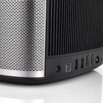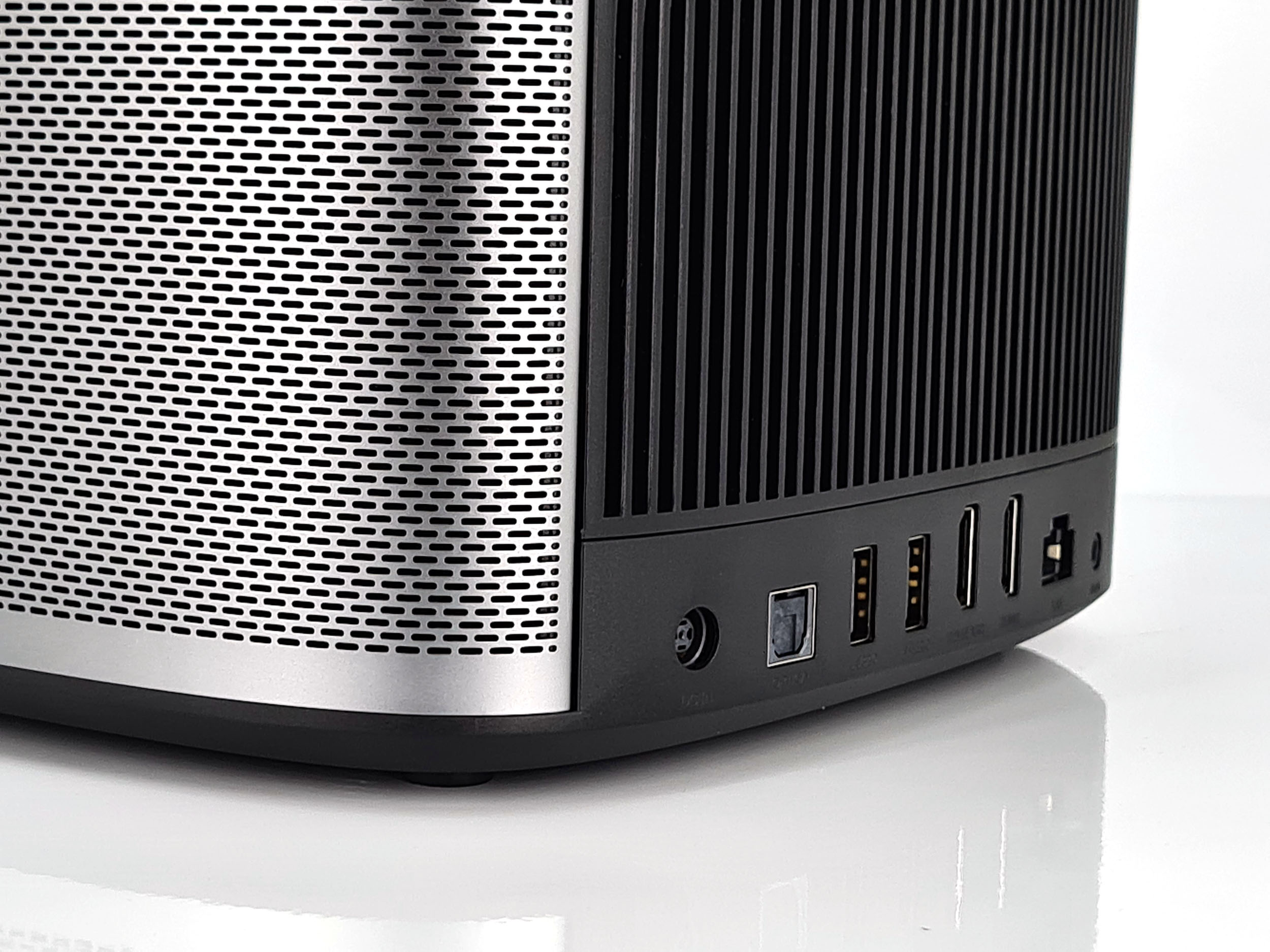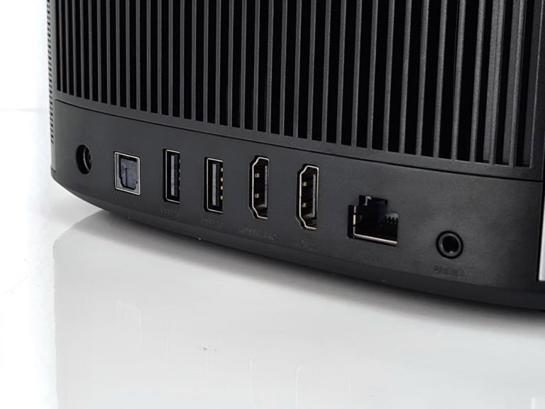 A l'arrière on retrouve une connectique assez riche avec une sortie audio numérique (SPDIF), deux port USB 2.0, deux HDMIs (HDMI/HDMI/ARC), un port éthernet, une sortie audio jack et un connecteur pour l'alimentation. Ces éléments sont placés en bas lorsque le projecteur est en position normale.