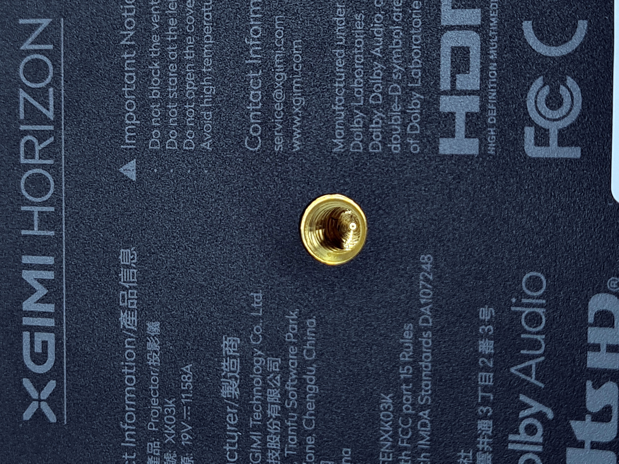 En dessous du projecteur, on retrouve 4 pattes en caoutchouc pour amortir les vibrations ainsi qu'un système d'attache pour trépied. Je n'ai pas l'impression que les pattes puissent être enlevée pour y attacher un support plafond. Sur mon précédent Xgimi, le support plafond pouvait être attaché aux quatres coins du projecteur.