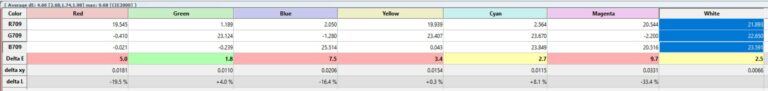 La mesure de la fidélité des couleurs (colorimétrie) n'est pas une question subjective, c'est quelque chose de complètement mesurable. Cette mesure s'effectue avec un appareil (colorimètre, spectromètre,...) qui mesure la différence entre la couleur réelle et la couleur affichée. Cette différence s'exprime en delta E (abréviation: dE). Un dE supérieur à 3 indique une déviation perceptible à l'oeil humain.