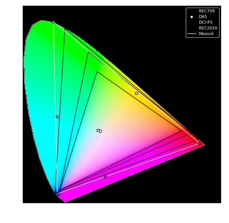 Si je me penche maintenant sur le nombre de couleurs affichable, je constate une couverture totale de l'espace REC2020 ce qui veut dire que ce projecteur dispose d'une palette de couleurs énorme pour répondre aux besoins du HDR.