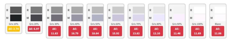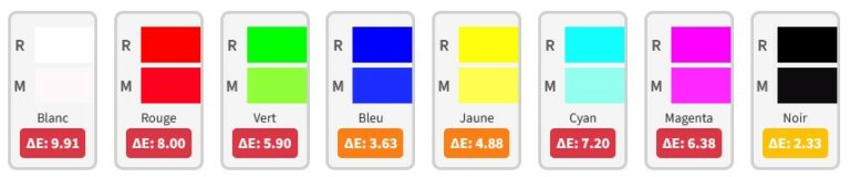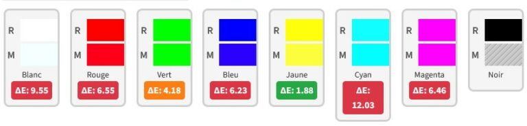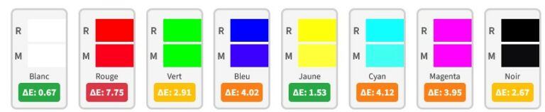 Il faut obtenir un delta E inférieur à 3 pour considérer que le rendu de la couleur est fidèle. Avec cette comparaison vous pouvez déterminer votre seuil de tolérance par rapport à la dérive mais certaines dérives sont très évidentes comme celle sur le cyan par exemple. Le blanc est trop froid et est légèrement bleuté.