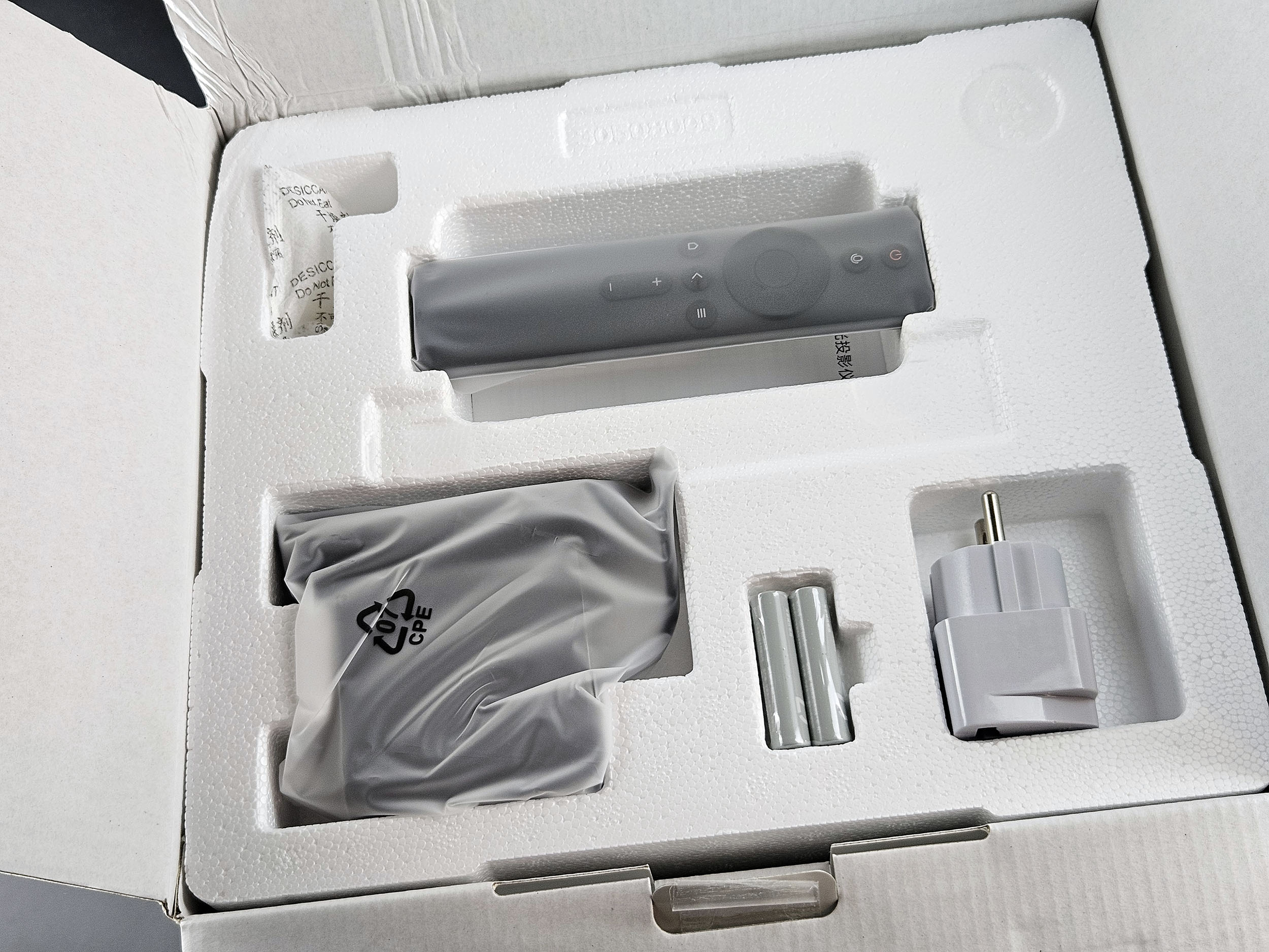 La boite a un peu souffert sur le trajet, elle a sans doute du faire une partie du voyage écrasée sous une boite plus lourde. Heureusement le projecteur est très bien emballé et je n'ai constaté aucun dégat sur le projecteur. La boite contient le projecteur, un chargeur USB avec un adaptateur européen, une télécommande, deux piles AAA et un manuel...en chinois.