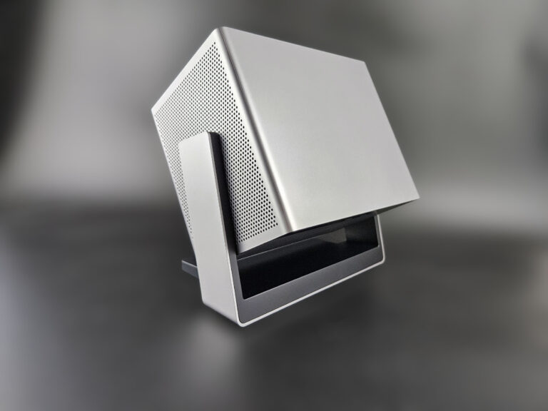 Ce Xiaomi Laser Projector 3 marque une rupture complète avec les générations précédentes, Xiaomi s'est complètement écarté de ce qu'ils avaient fait dans le passé pour prendre un format à la mode en ce moment, un format à bascule. Le projecteur a une couleur métallique qui lui donne une impression de solidité mais tout est en plastique. Il est d'ailleurs très léger, il pèse moins de 3 kilos.