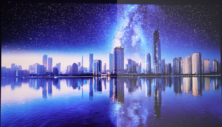J'ai mesuré un taux de contraste entre 1640:1 (mode Vivid) et 1890:1 (mode standard) et même un peu au-dessus de 1900:1 en mode custom. C'est clairement une force de ce projecteur parce que dans cette gamme de prix, il n'y a pas beaucoup de triple laser et si je le compare au XGIMI Mogo 4 Laser, ce Xiaomi fait beaucoup mieux!