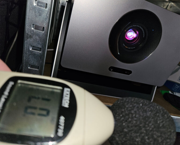 Ce Xiaomi Laser Projector 3 est d'une discrétion exemplaire. Même si je colle mon décibel mètre à proximité du projecteur, je ne capte pas le léger bourdonnement qu'il émet (moins de 40 dB). Si vous utilisez le mode "custom" qui est un peu plus lumineux, le projecteur fera un peu plus de bruit mais pas au point de devenir un problème.