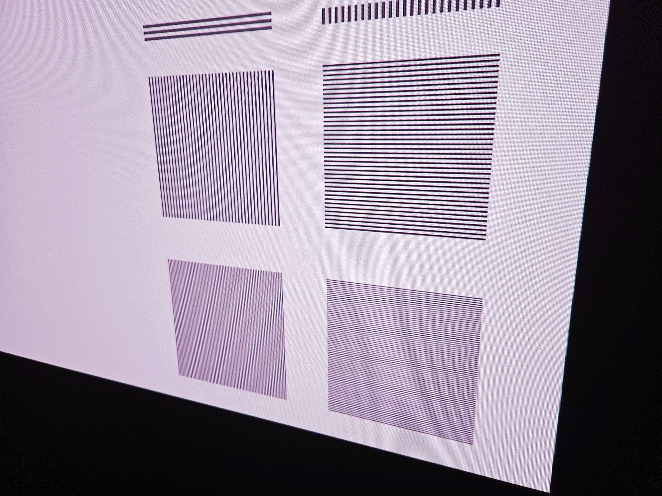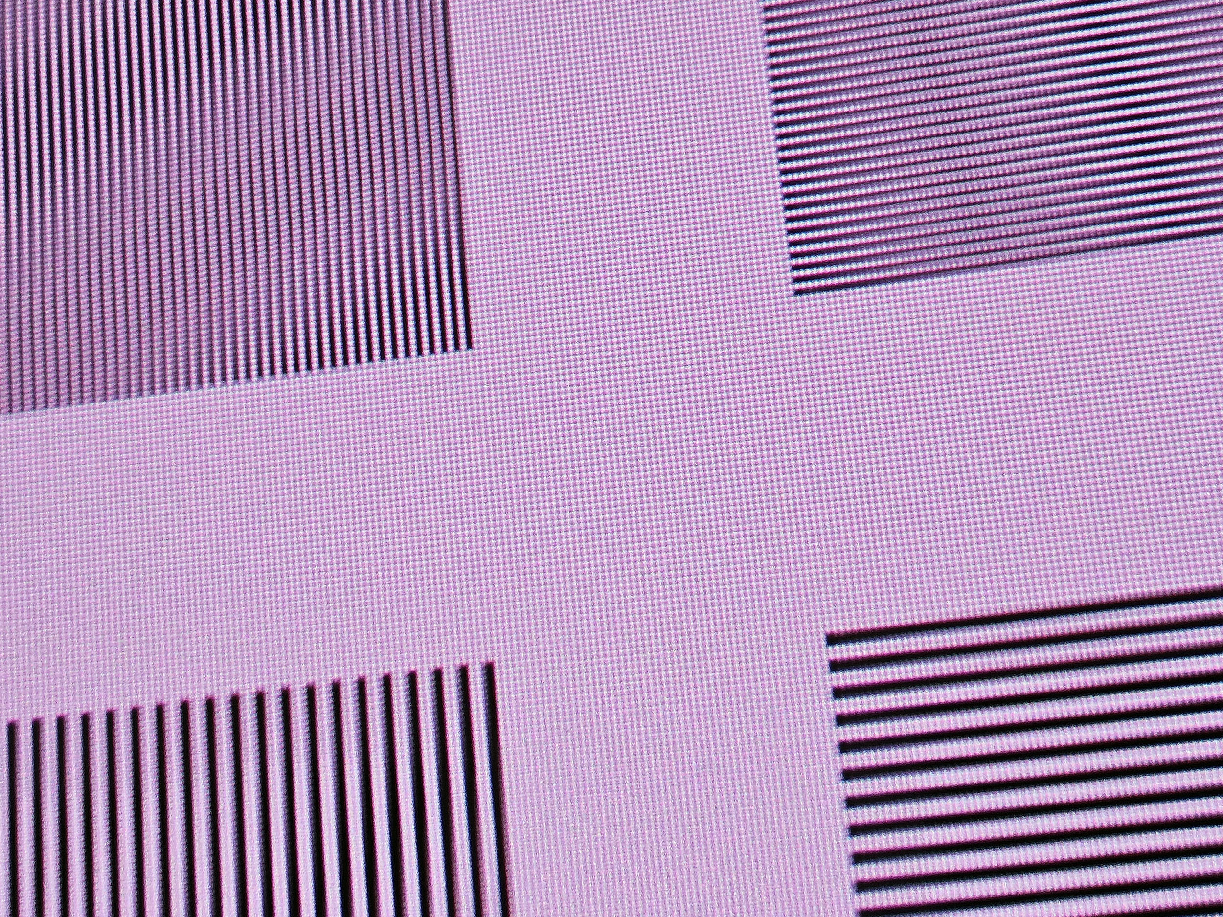 Si je m'attarde uniquement sur la netteté, elle est suffisamment bonne pour distinguer les lignes écartées de 1 pixel. La coloration pourpre que vous voyez sur les photos provient de l'incapacité de mon téléphone à prendre un photo d'un projecteur triple laser.