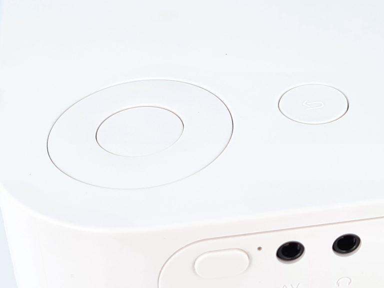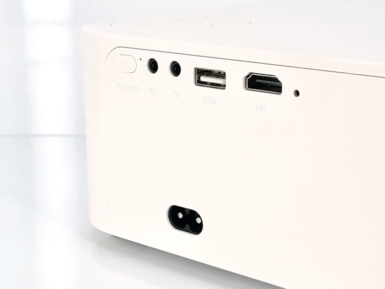 A l'arrière on retrouve une connectivité minimale qui est très bien intégrée dans le projecteur. Il y a une entrée audio/video pour brancher par exemple un lecteur DVD, un sortie type jack pour une sortie son en stéréo, une entrée USB pour par exemple utiliser une clé USB et un port HDMI