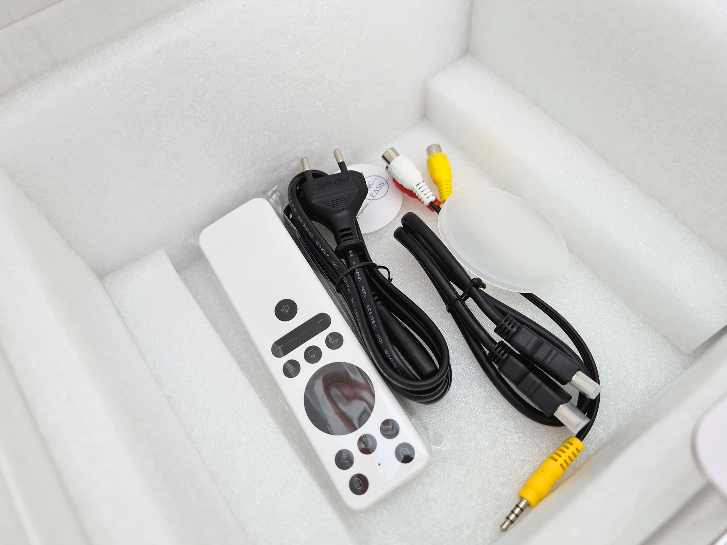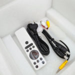 Dans la boite on retrouve le projecteur, une télécommande (sans piles), un cable video type cinch, un cable video hdmi, un cable d'alimentation, un manuel et un couvercle de protection pour la lentille. L'ensemble est emballé avec soin.