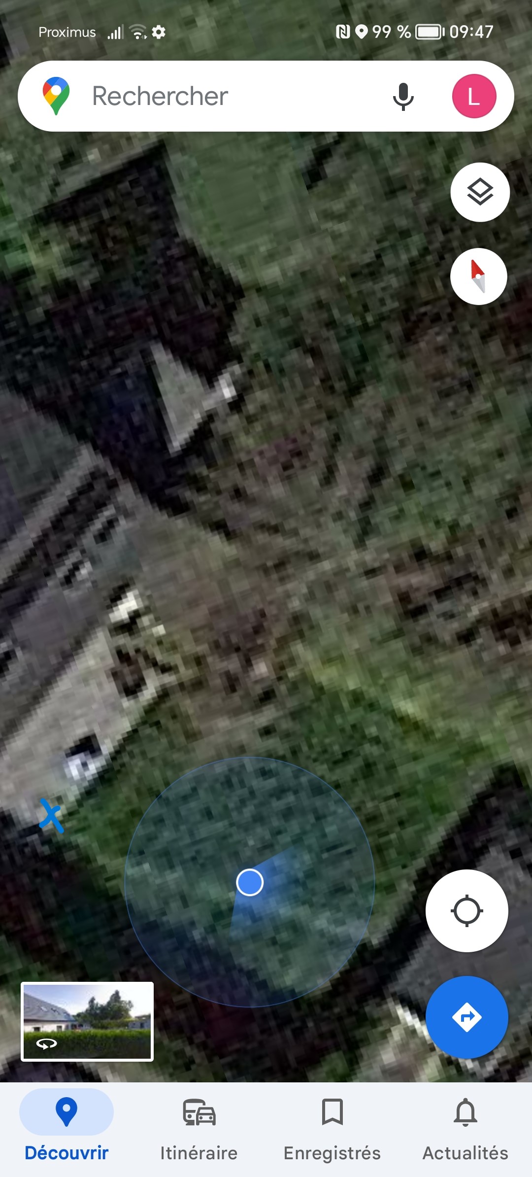 Ce téléphone utilise une puce GPS Mediatek et comme je l'écris souvent, ce type de puce aboutit la plupart du temps à un niveau de précision assez élevé. J'ai effectivement obtenu un niveau de précision à 1 mètre assez rapidement, le téléphone capte une trentaine de satellites pour aboutir à un signal de bonne qualité. J'ai ensuite testé la précision dans des conditions réelles, j'étais positionné au niveau de la croix bleue sur la capture d'écran et on voit que le GPS me localisait 2 à 3 mètres plus loin. Ca reste un niveau de précision acceptable qui peut être corrigé par votre application de guidage mais le niveau de précision affiché par l'application de test est sans doute un peu trop optimiste.