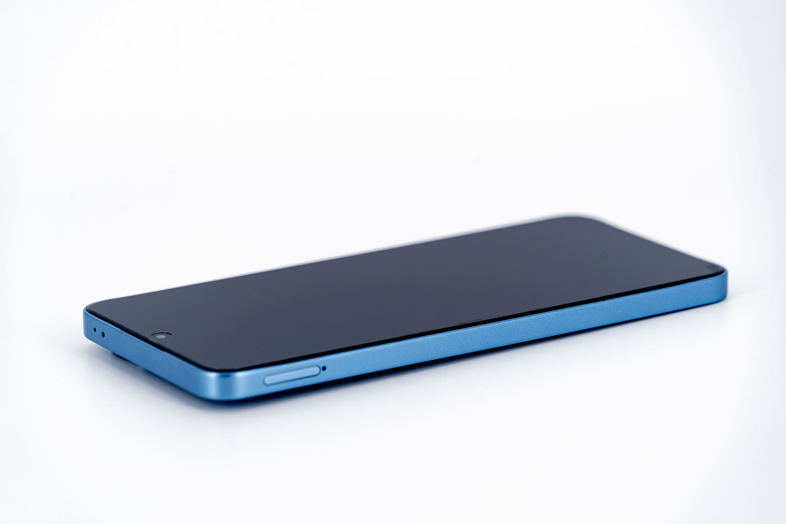 La face avant est dominée par l'écran qui occupe presque 90% de la surface disponible, les bordures sont un peu plus fines que d'habitude et l'écran est uniquement interrompu par l'appareil photo à selfie en haut et au milieu de l'écran. L'écran est protégé par un film plastique pour le protéger des griffes.