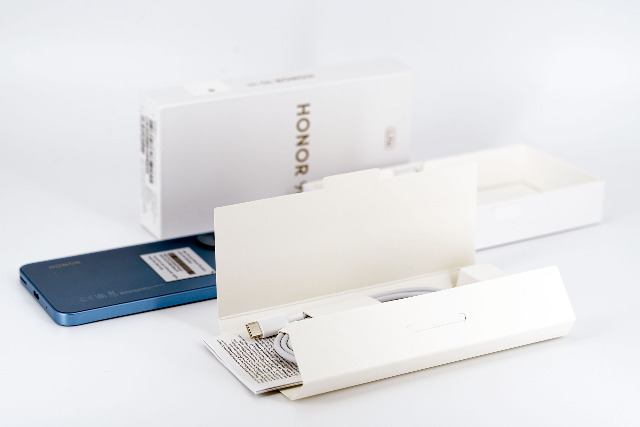 La marque Honor a adopté le nouveau format de boites comme ce que l'on retrouve chez Samsung. Les boites sont plus petites et ne contiennent plus de chargeur. A priori cela ne devrait pas trop poser de problème car une grande majorité d'utilisateurs de smartphone dispose probablement déjà d'un chargeur USB type C.