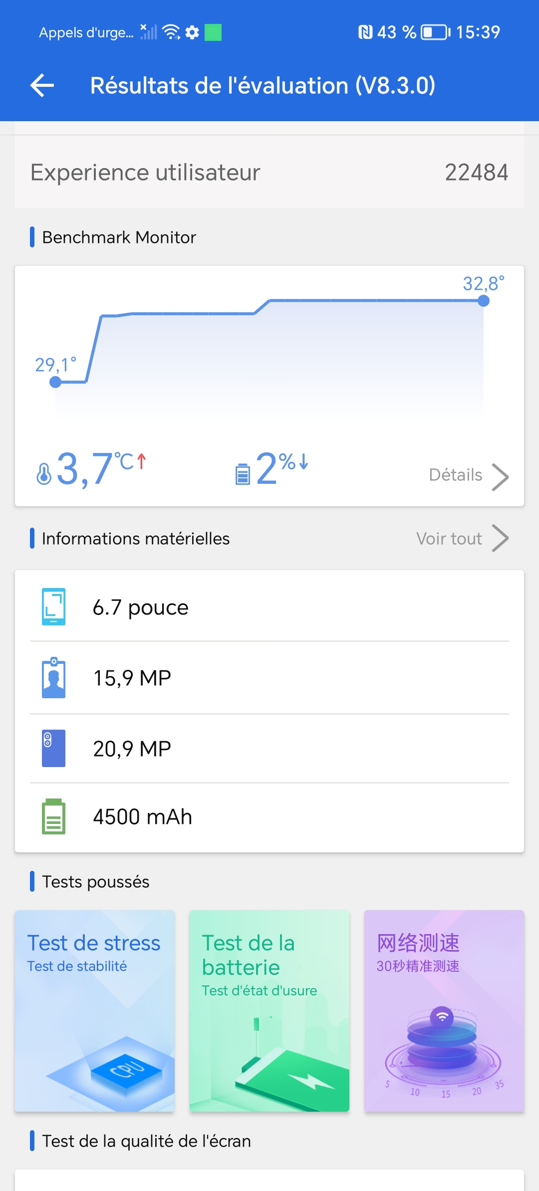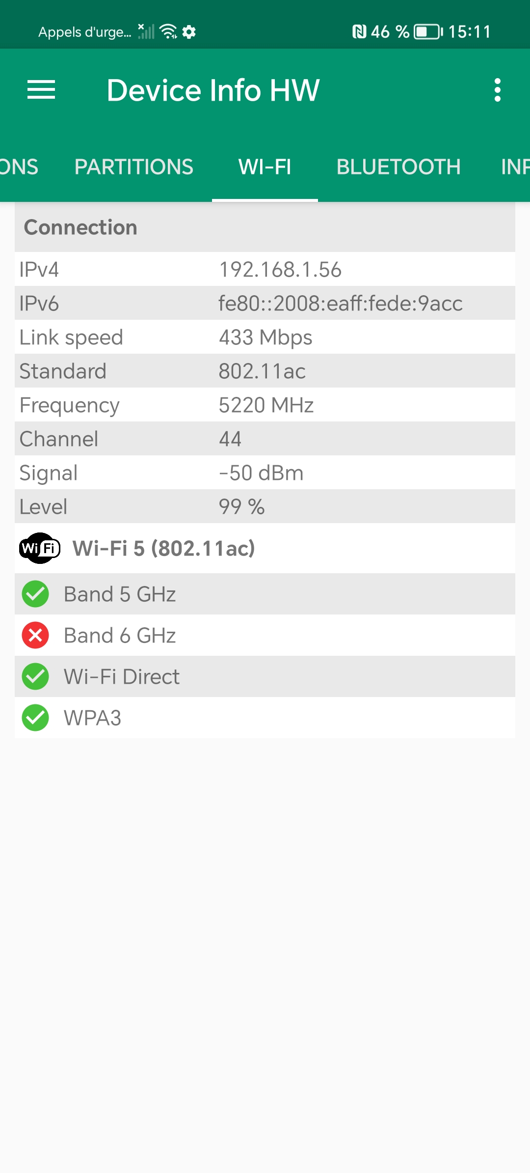 J'ai obtenu un signal moyen de -18 dbm à proximité du routeur et -64 dbm à distance. Ce sont des valeurs un peu supérieure à la moyenne indiquant que ce téléphone a une bonne sensibilité au wifi.