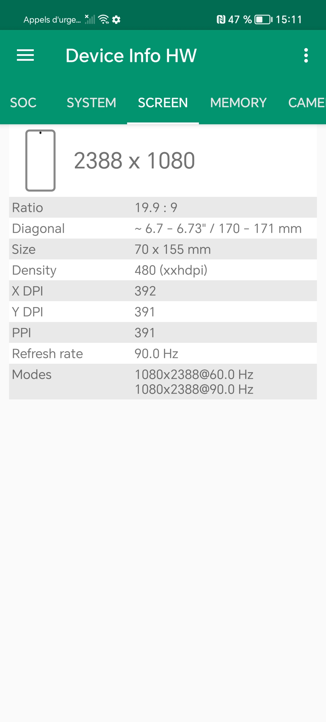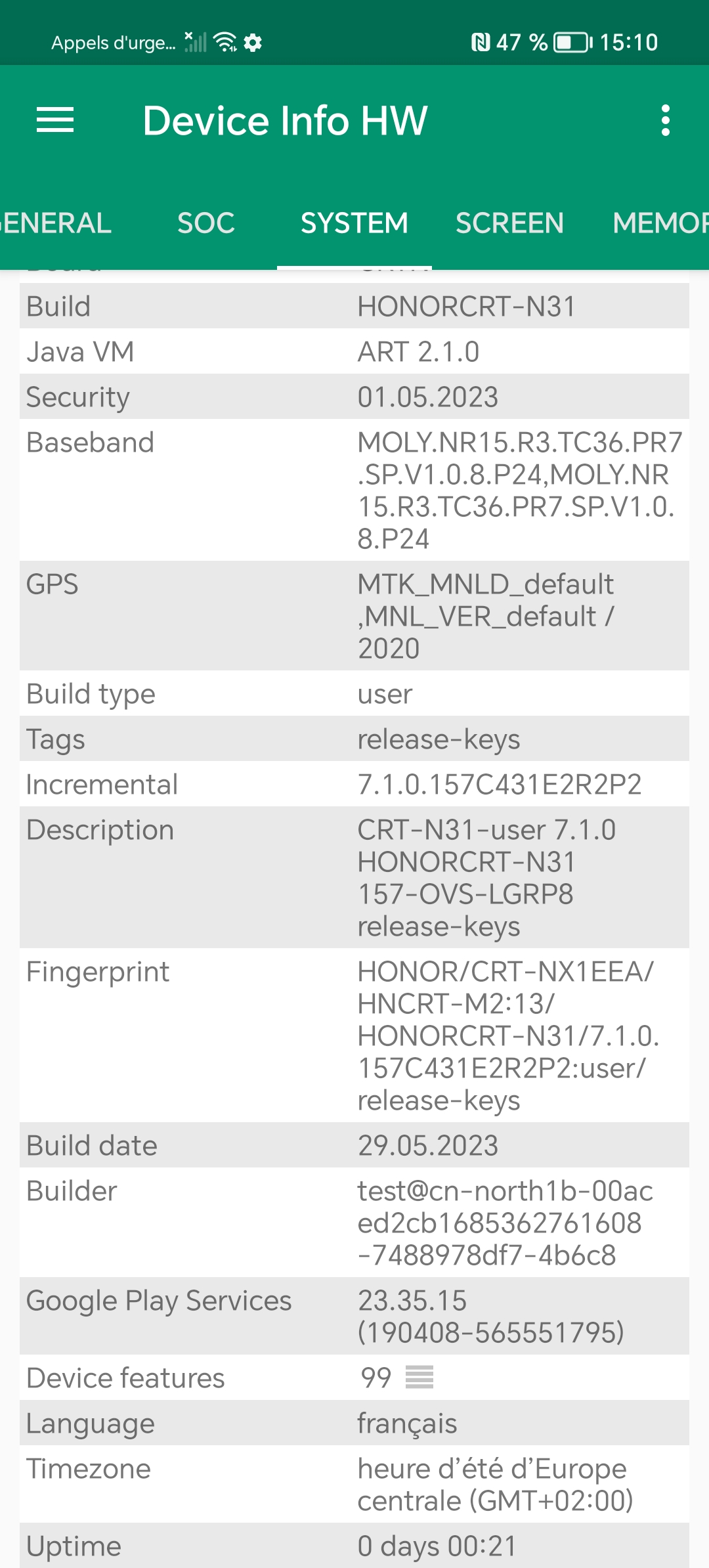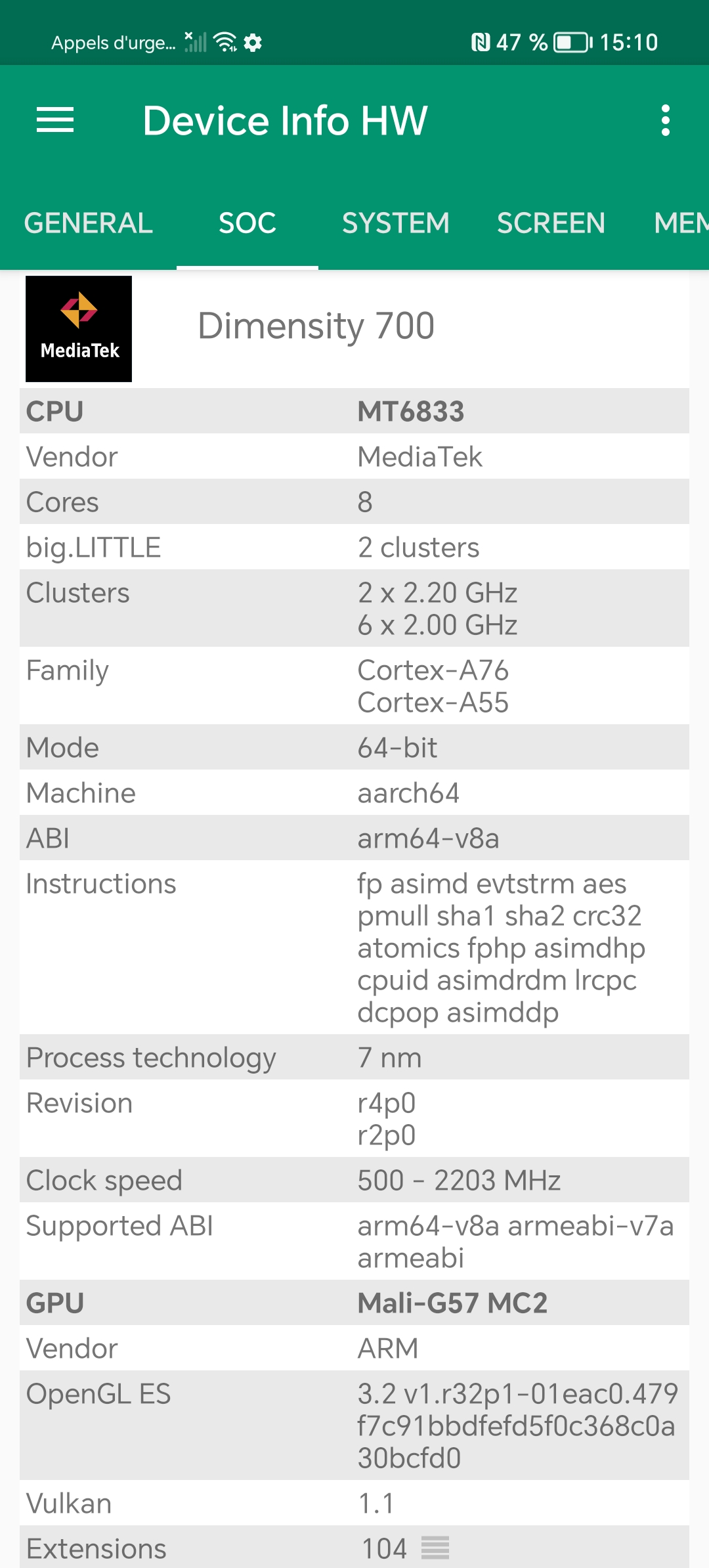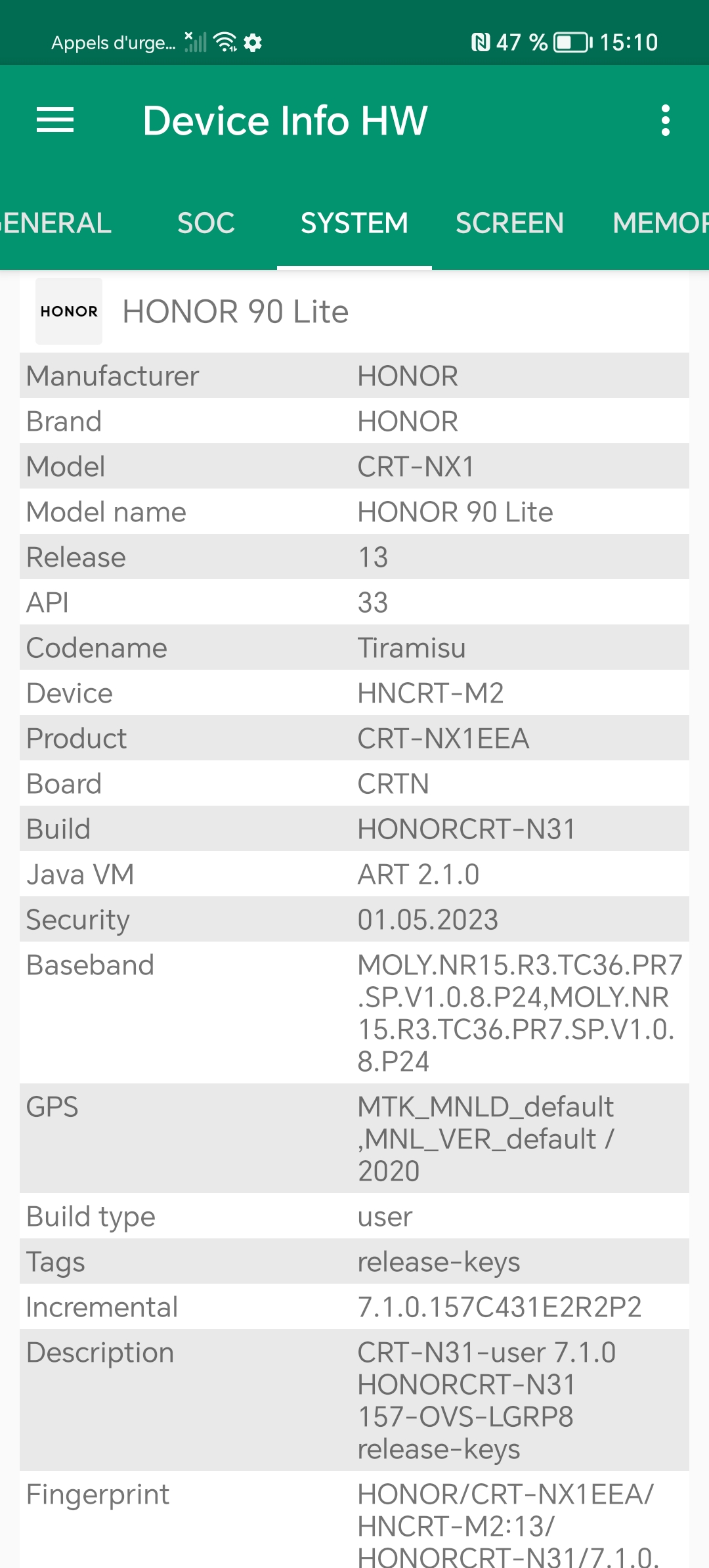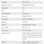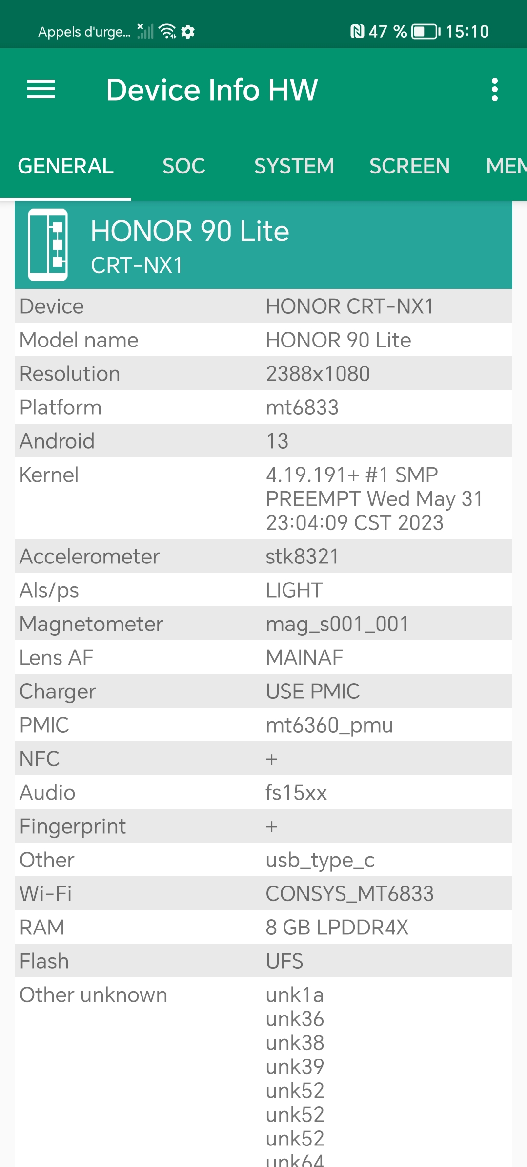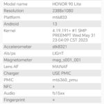 Les informations ci-dessous proviennent de l'application Device Info HW. L'application fournit des informations techniques détaillées sur le téléphone testé.Le Honor 90 Lite tourne sous une architecture Mediatek un processeur que je n'ai pas encore eu l'occasion de tester. Il s'agit ici d'une architecture de milieu de gamme, je n'ai pas remarqué quelque chose qui sorte de l'ordinaire au niveau des caractéristiques techniques, vous retrouverez toutes les captures d'écrans avec les informations techniques ci-dessous.