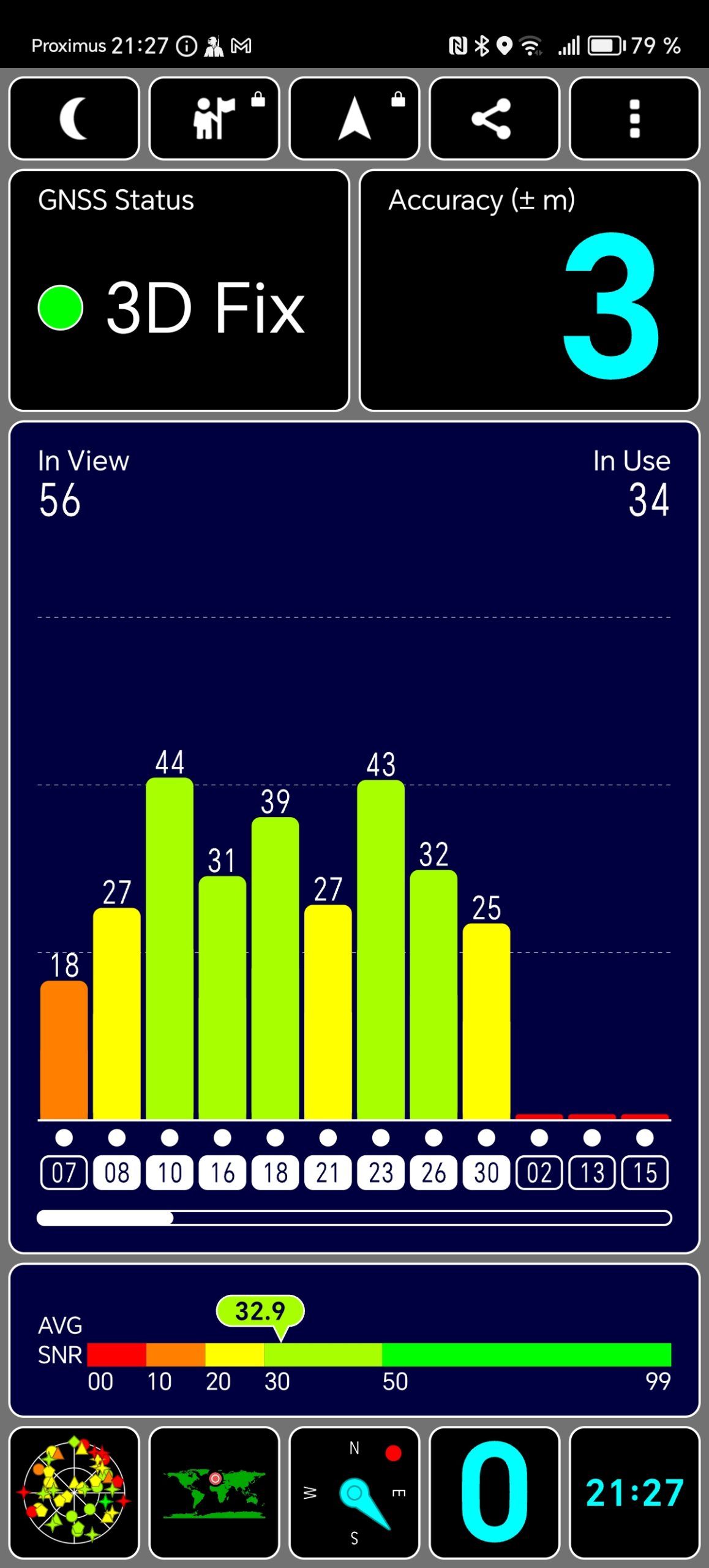 Pour tester la précision du signal GPS, j'utilise deux applications de positionnement pour évaluer la différence entre la position réelle et la position indiquée par le téléphone. Ce test est fait en extérieur sans rien pour obstruer le signal. Un niveau de précision jusqu'à 3 mètres peut facilement être corrigé par une application (ex: Google Maps).