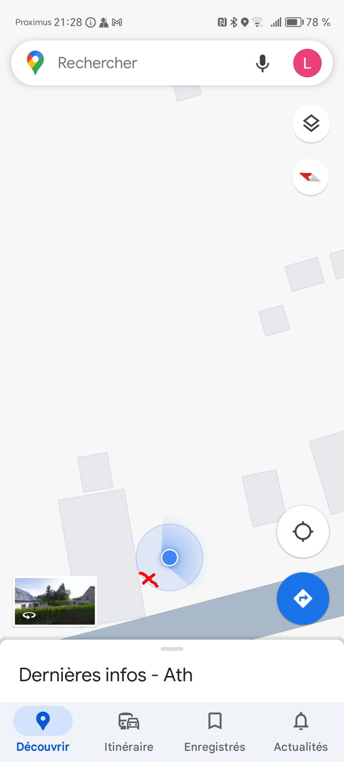 J'ai obtenu un niveau de précision à 3 mètres avec l'application GPS test, c'est un niveau de précision assez courant qu'il faut ensuite tester en condition réelle. Sur la capture d'écran avec la carte, ma position correspond à la croix rouge et comme vous pouvez le constater la position réelle se trouve à moins de trois mètres de la position détectée, la précision est donc bonne. Les éventuelles imprécisions seront de toute façon corrigée par votre application GPS car l'écart est trop faible pour poser un quelconque problème.