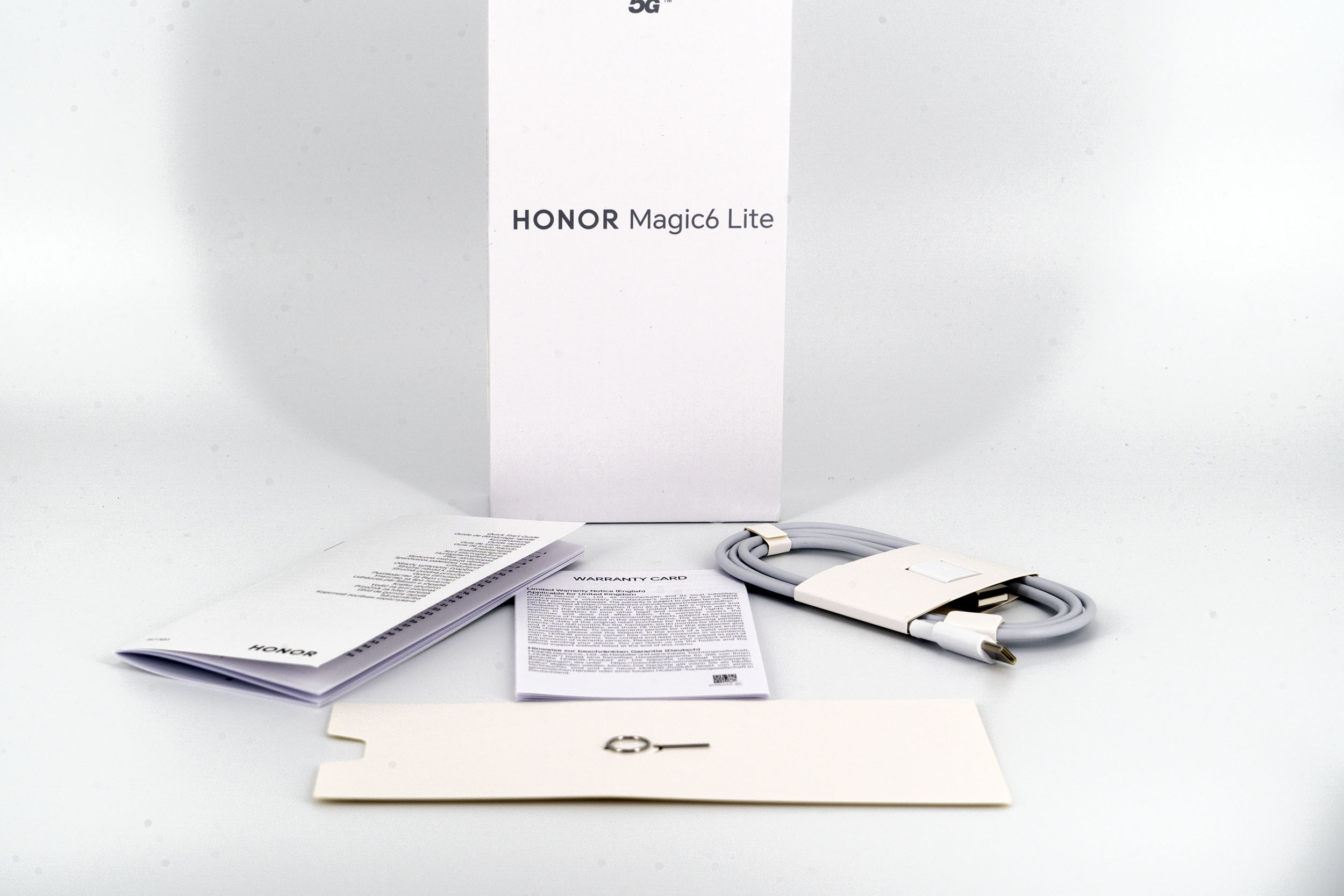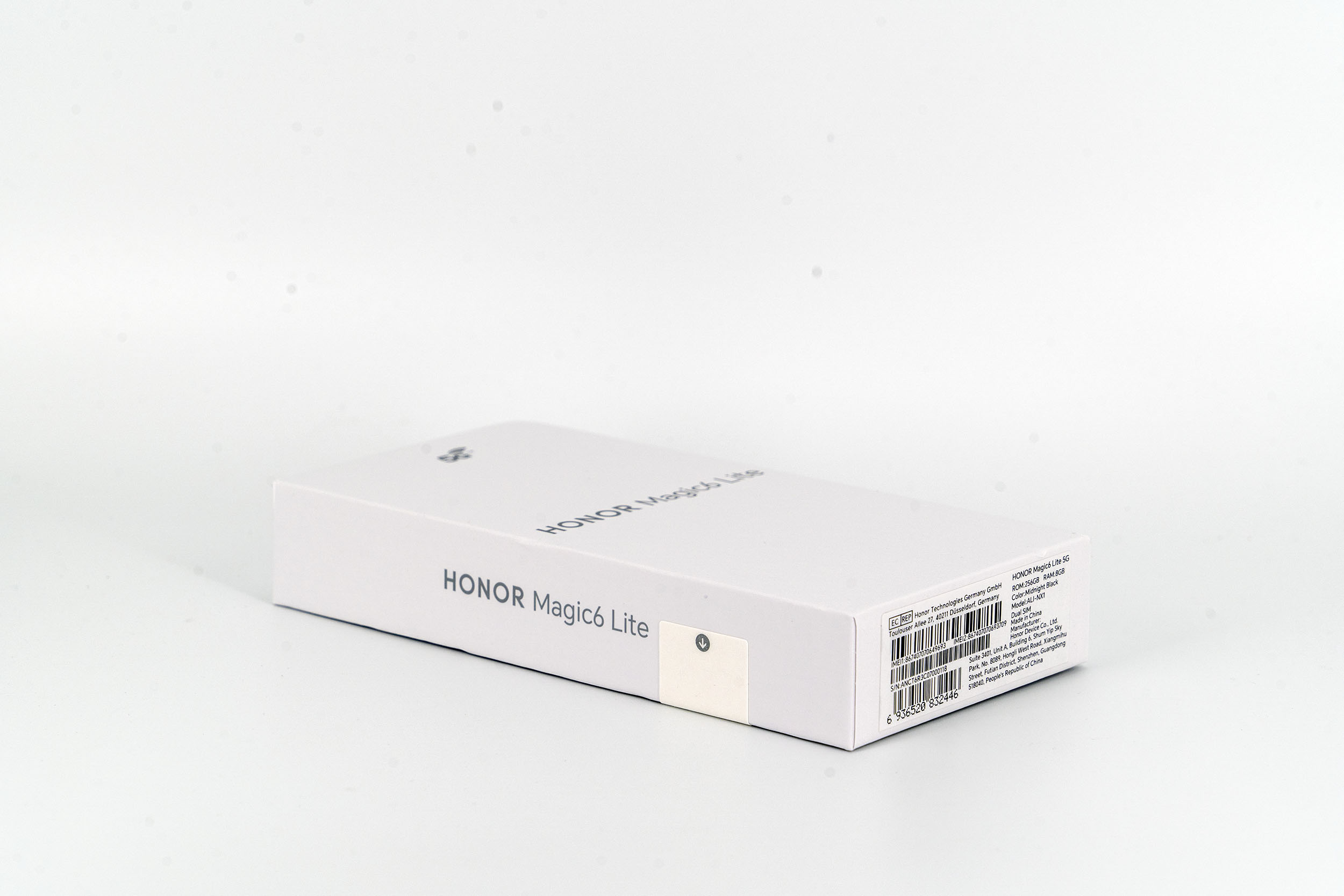 Je dis souvent que la boite joue un rôle important dans la perception d'un téléphone parce que c'est le premier contact avec son utilisateur final. La boite du Honor Magic6 Lite ne reflète malheureusement pas le côté premium du téléphone car la boite est tout ce qu'il y a de plus neutre avec une boite compacte blanche sans aucune illustration du smartphone. Ce n'est pas un problème évidemment, c'est juste un peu étonnant.