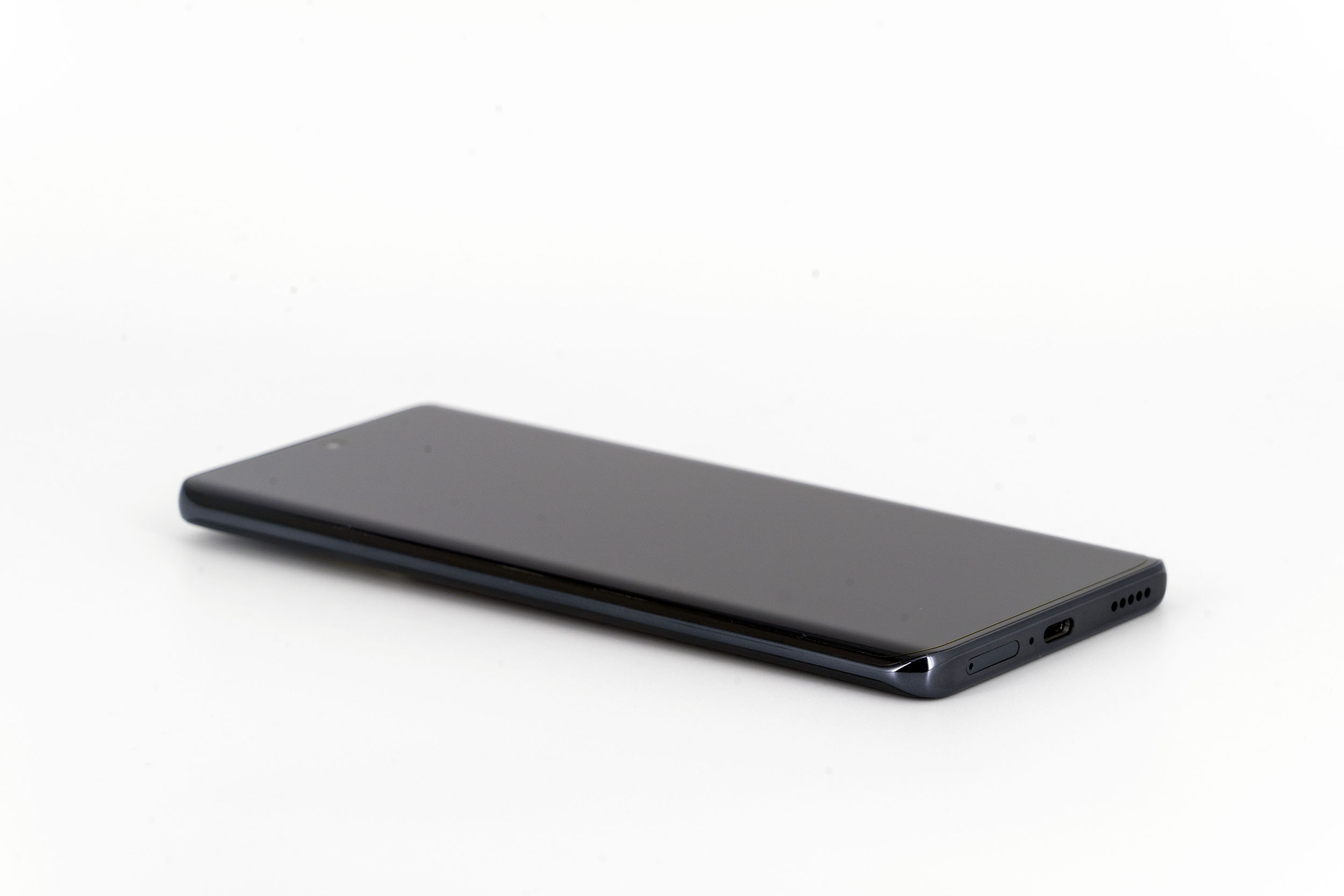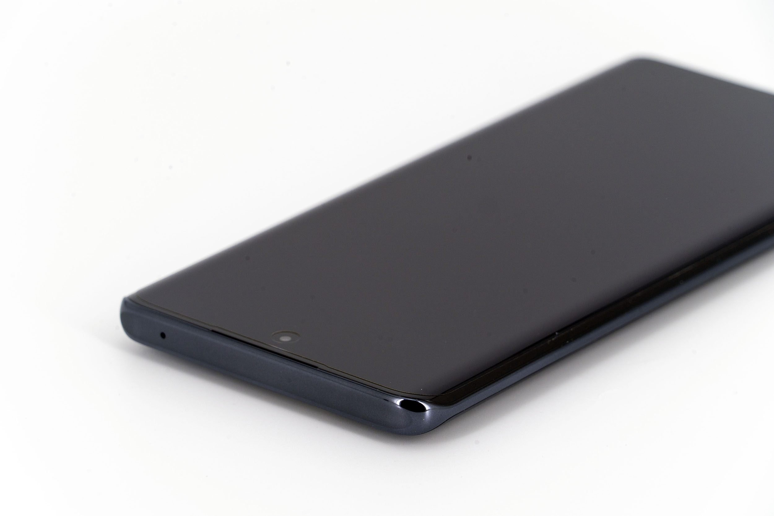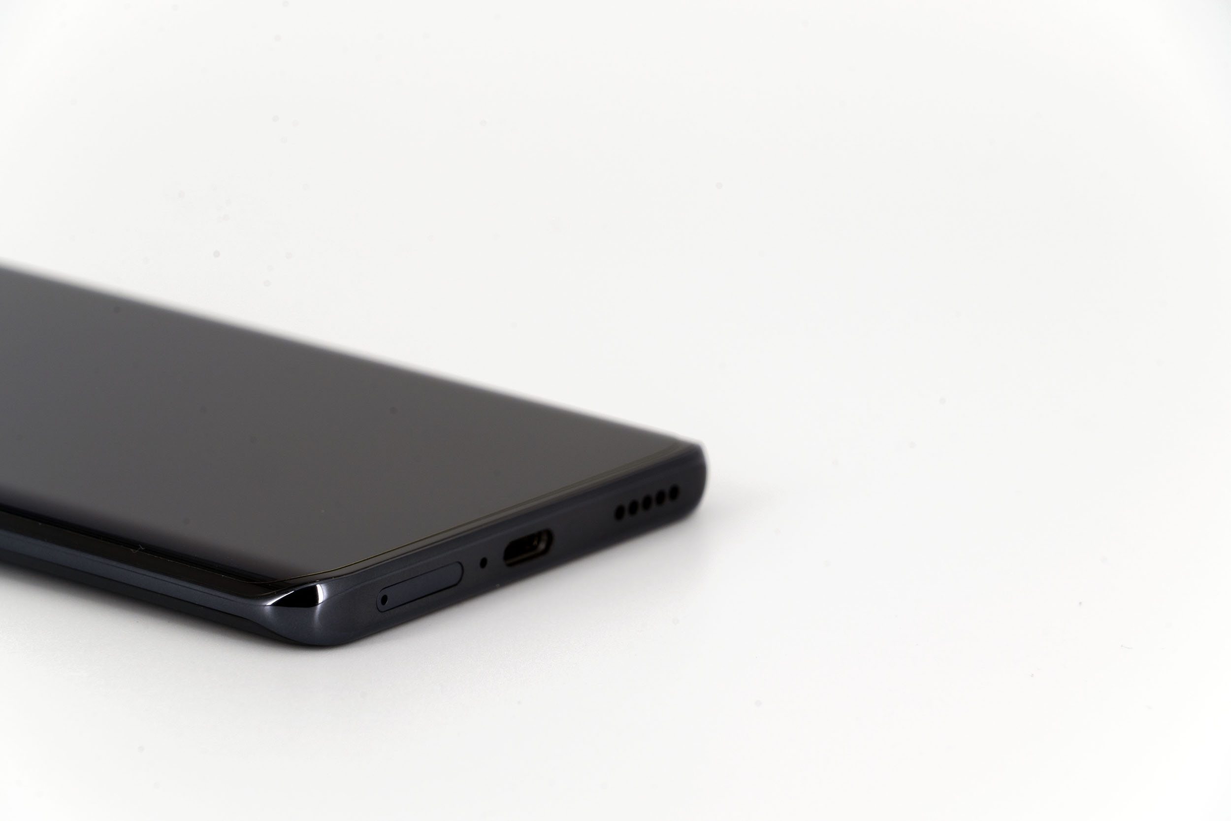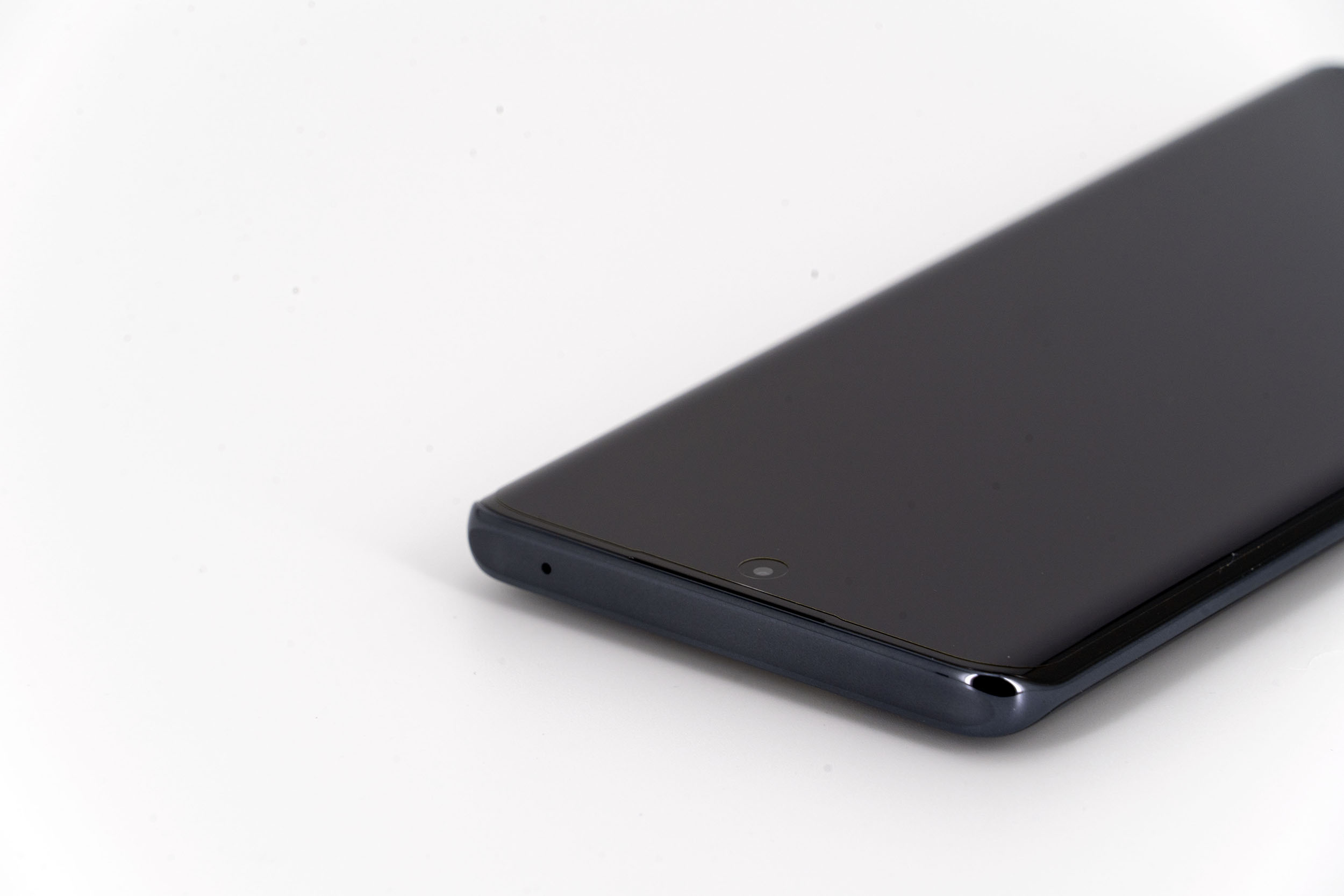La tranche supérieure du téléphone est presque parfaitement lisse, il n'y qu'un petit capteur de son pour interrompre une surface continue. Le contour du téléphone est composé de deux couleurs, un noir lié à la courbure de l'écran et le gris anthracite qui enveloppe le reste du téléphone.