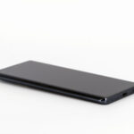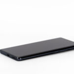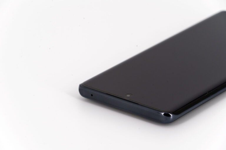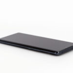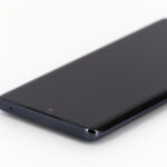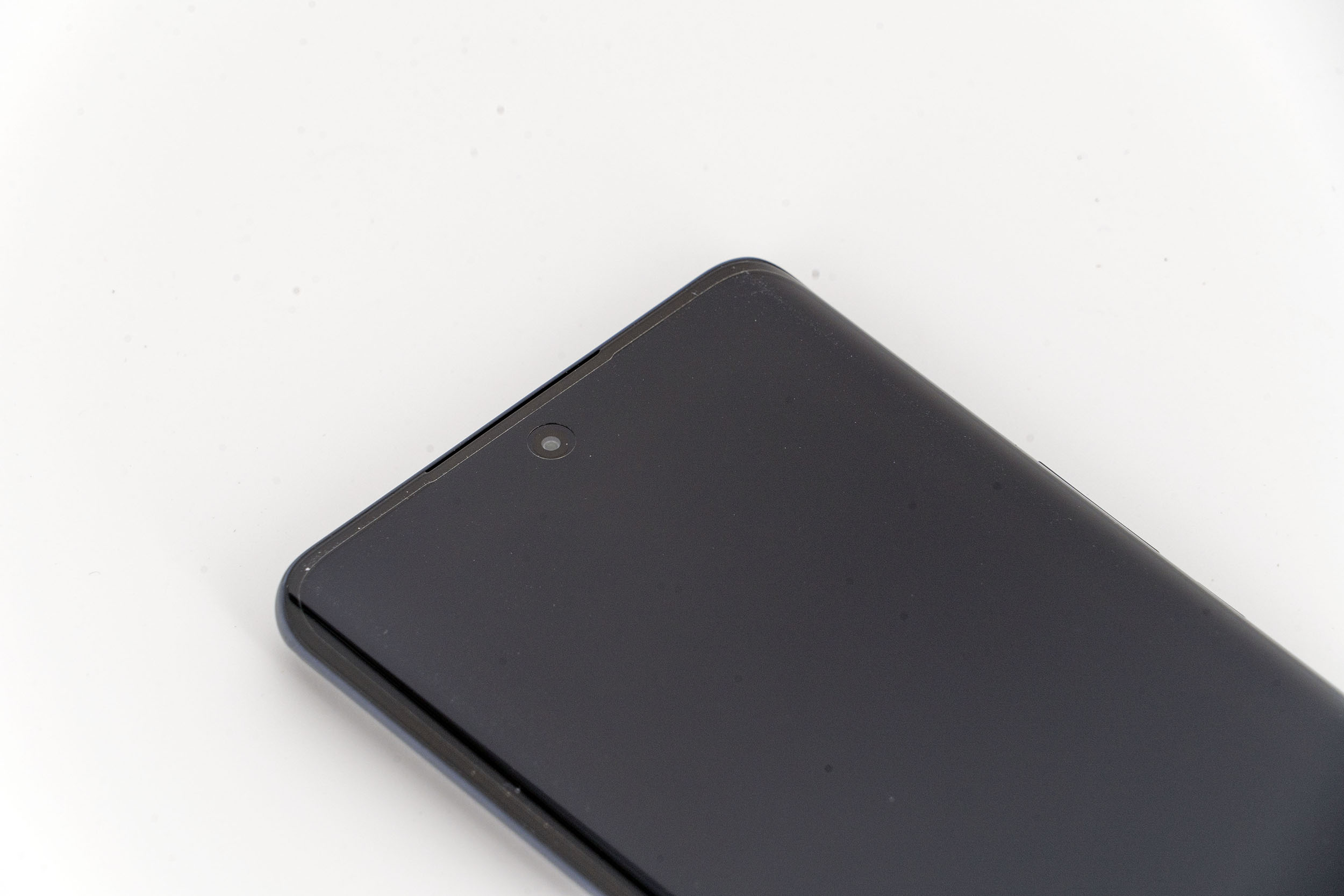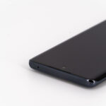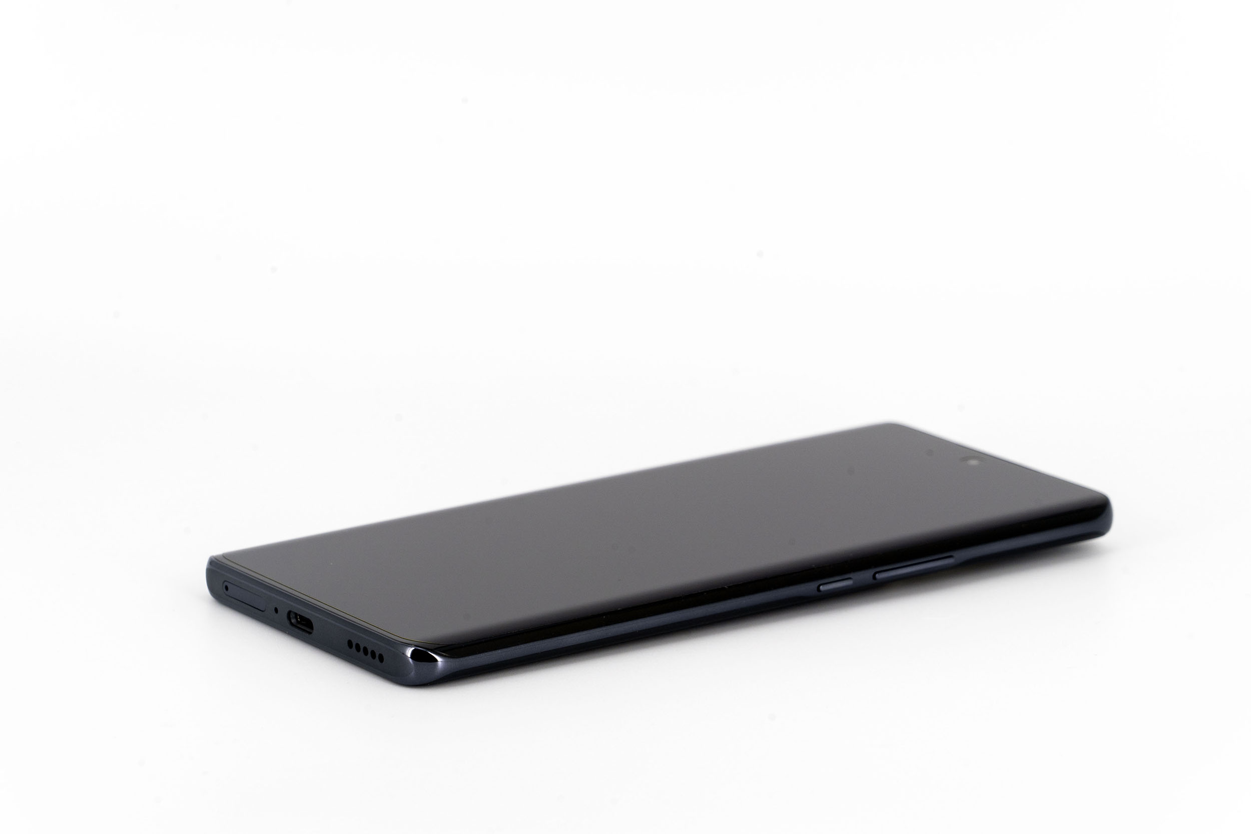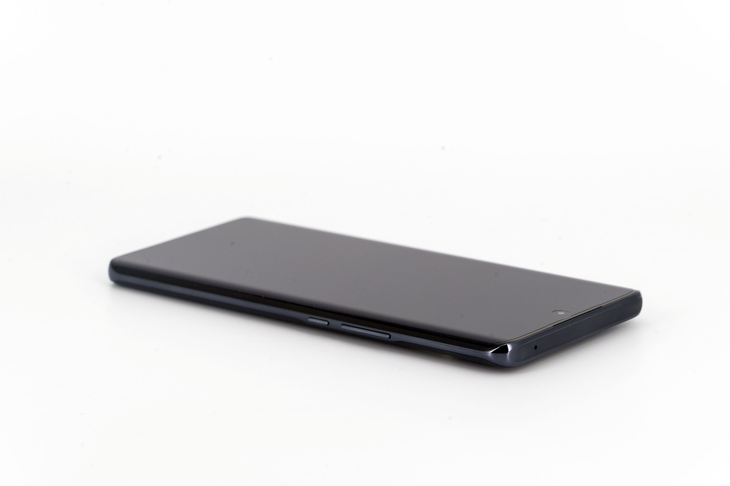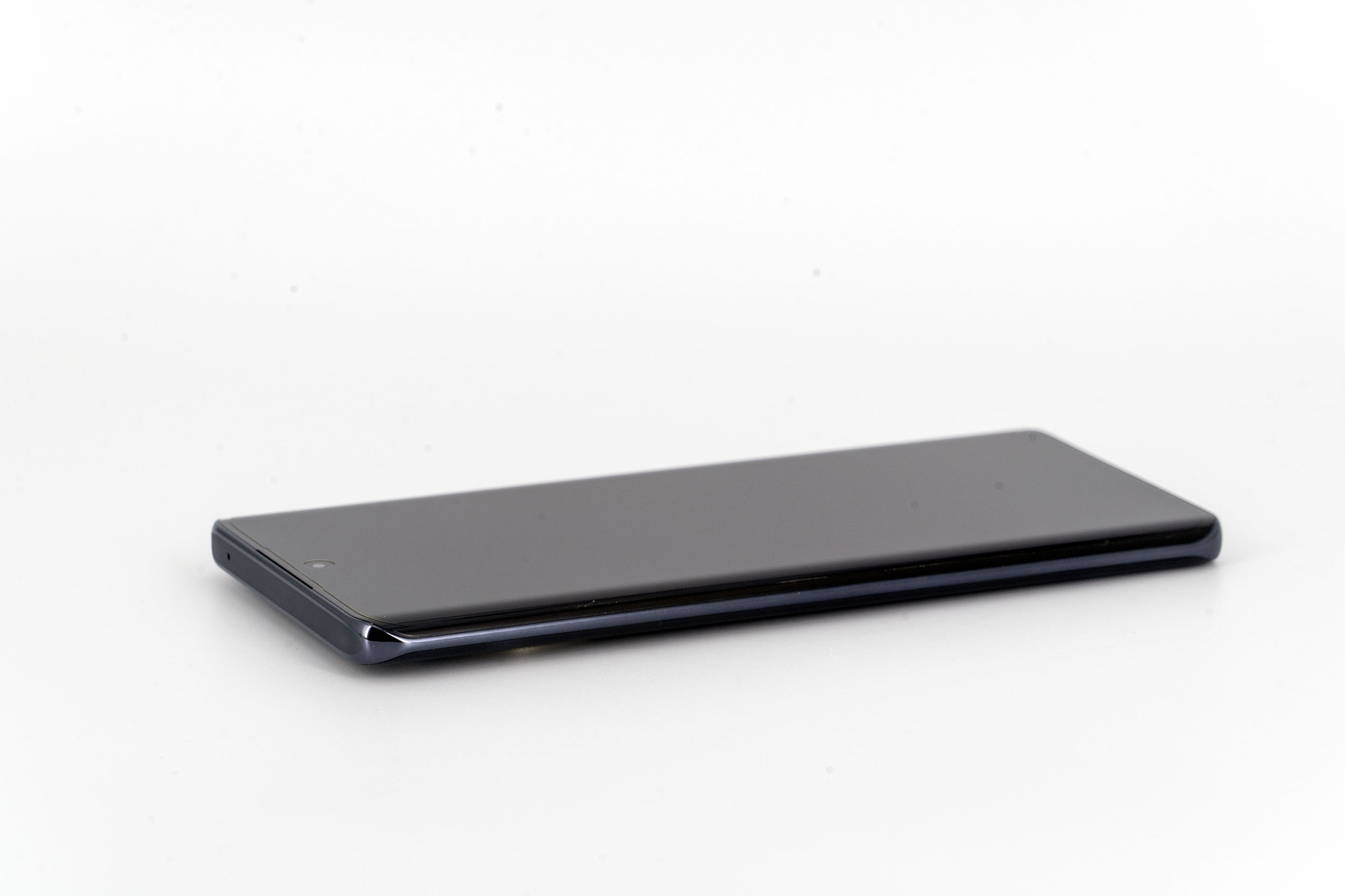 La tranche supérieure du téléphone est presque parfaitement lisse, il n'y qu'un petit capteur de son pour interrompre une surface continue. Le contour du téléphone est composé de deux couleurs, un noir lié à la courbure de l'écran et le gris anthracite qui enveloppe le reste du téléphone.