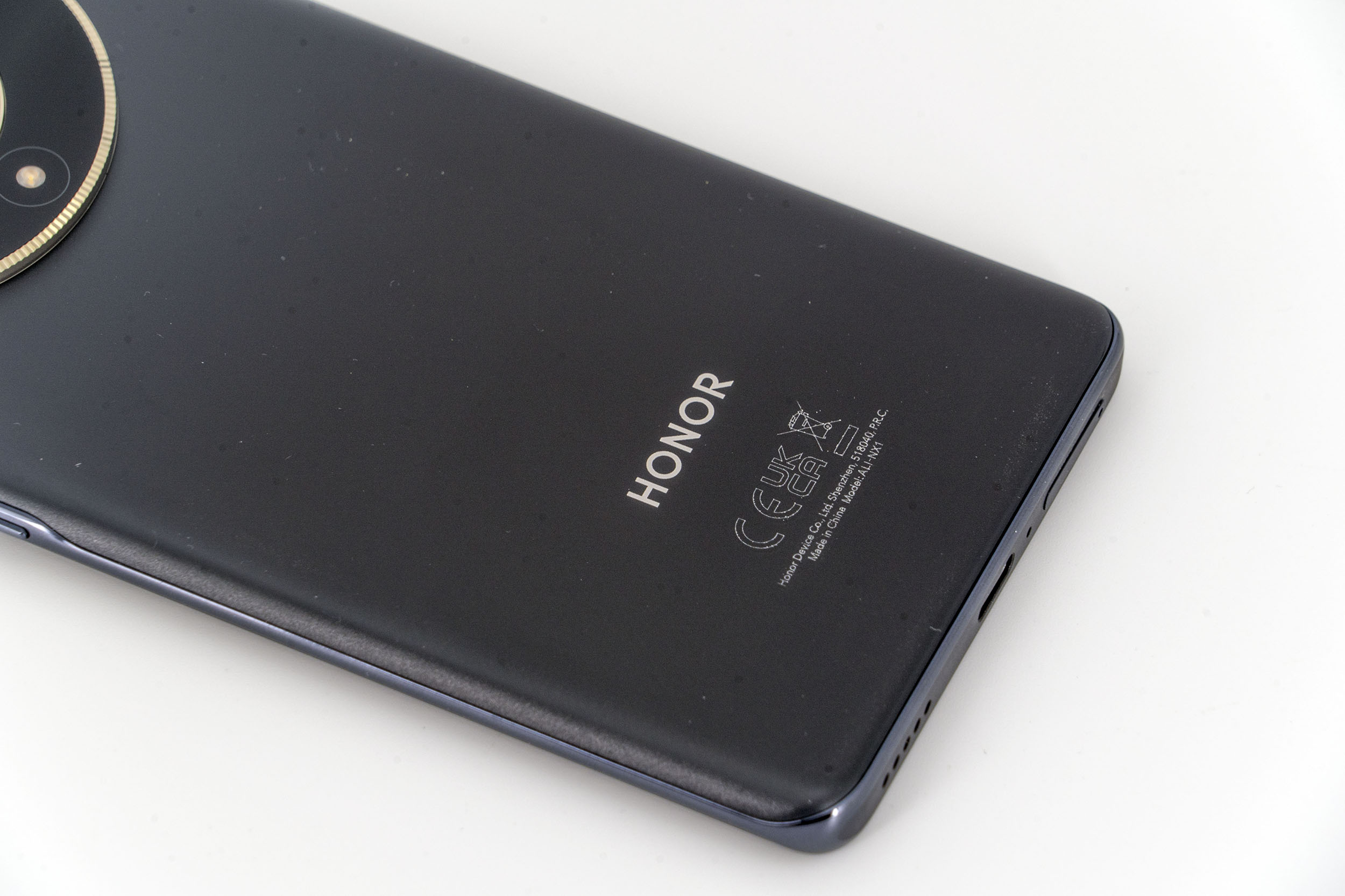 La marque Honor est assez discrète, la mention CE et le logo de la poubelle sont d'ailleurs plus grands que le logo. Ces indications sont également gravées en relief dans le téléphone, c'est même assez curieux, j'aurais plutôt imaginé ça pour le logo.