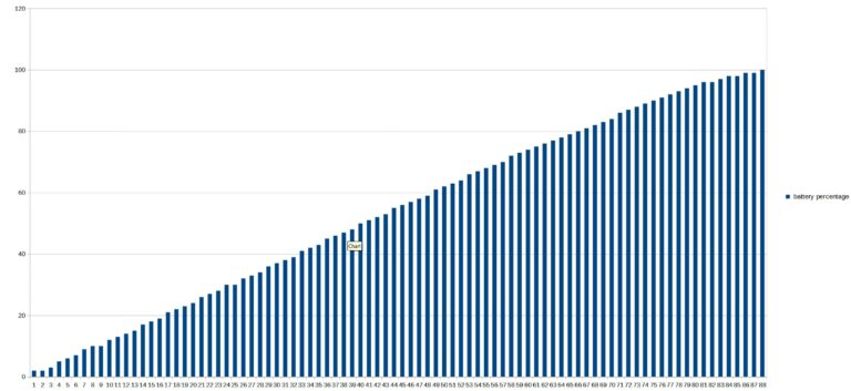 Il faut 17 minutes pour atteindre les 20%, 34 minutes pour atteindre les 40%, 49 minutes pour atteindre les 60% et 67 minutes pour atteindre les 80%. Les 20 derniers pourcents sont atteints après environ 20 minutes de plus.