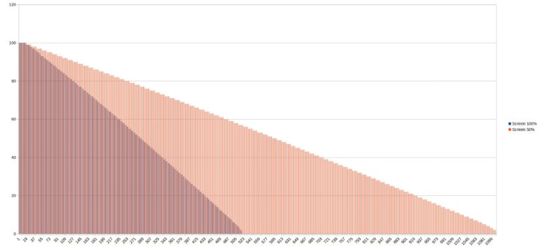 Pour tester l'autonomie des batteries j'ai développé une application qui mesure le niveau de batterie minute par minute jusqu'à ce que la batterie soit vide. Cette application consomme environ une dizaine de pourcent des ressources du téléphone et je fais un test avec une luminosité d'écran à 100% et un autre avec une luminosité à 50%. Ce test vise à reproduire une utilisation contemplative d'un téléphone (ex: surfer sur internet, lire des articles, passer du temps sur les réseaux sociaux). Ces résultats ne sont pas valables pour une utilisation intensive type gaming/streaming. [battery]