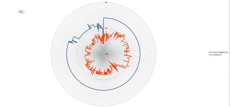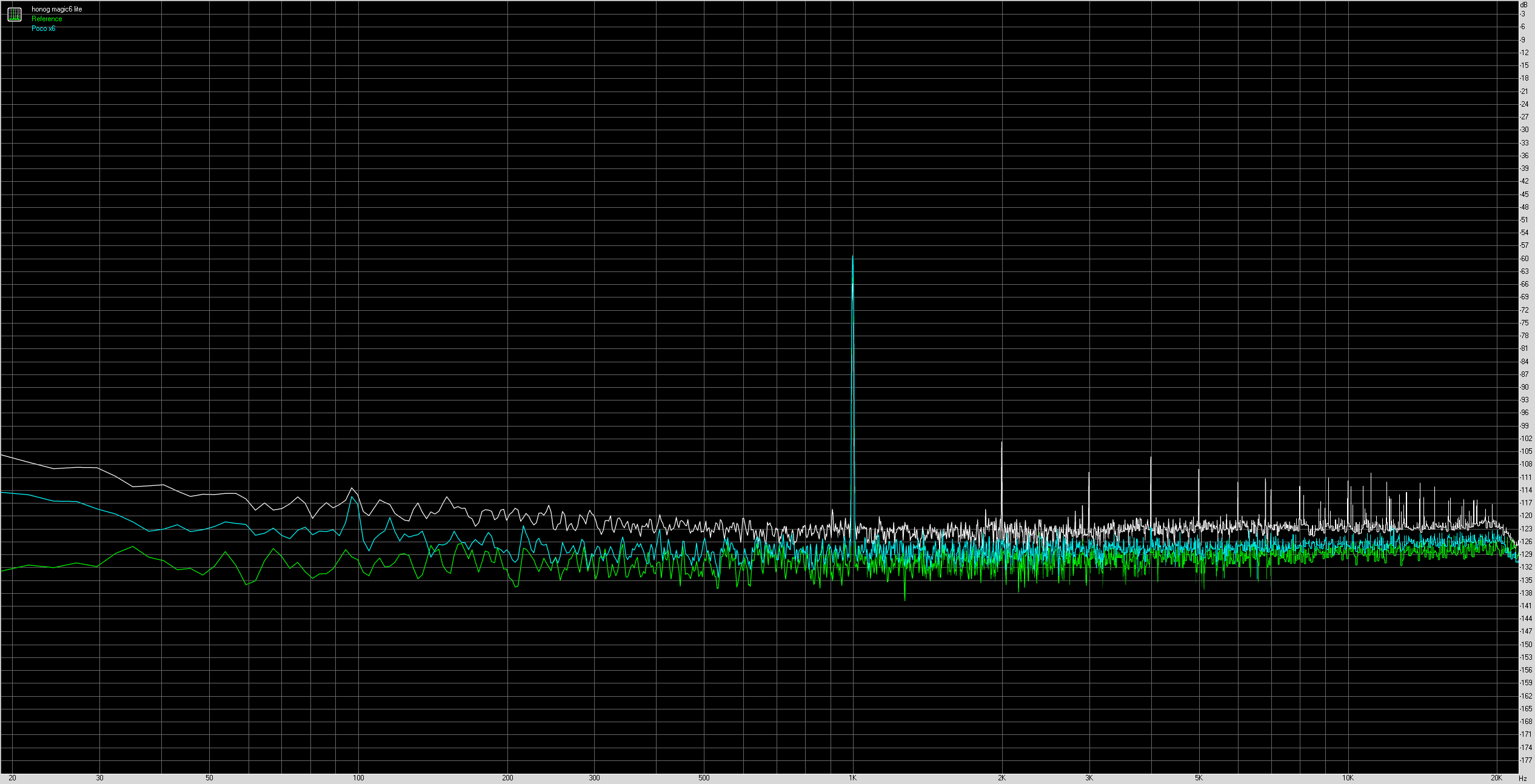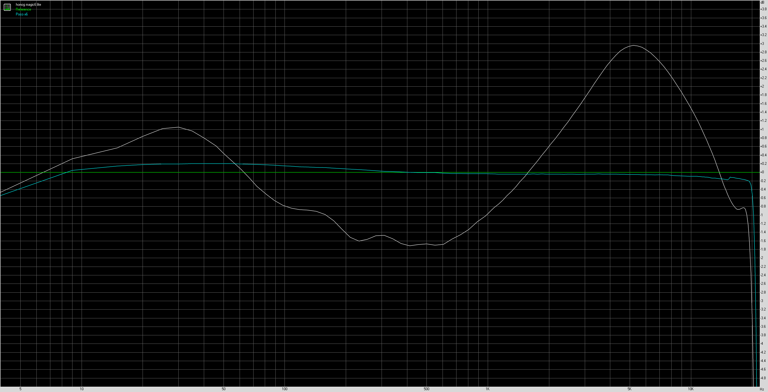 Je teste le POCO X6 en même temps que ce téléphone, j'en ai donc profité pour les mettre face à face pour ce test audio. Le Honor Magic6 Lite est capable de reproduire toutes les fréquences mais la qualité de reproduction est moins bonne que celle du POCO X6. Sur le graphique ci-dessus on voit que la courbe du Honor s'écarte beaucoup plus de la norme que celle du POCO. L'écart parait énorme mais il faut regarder l'échelle, l'écart en chiffre absolu n'est pas gigantesque mais il existe.