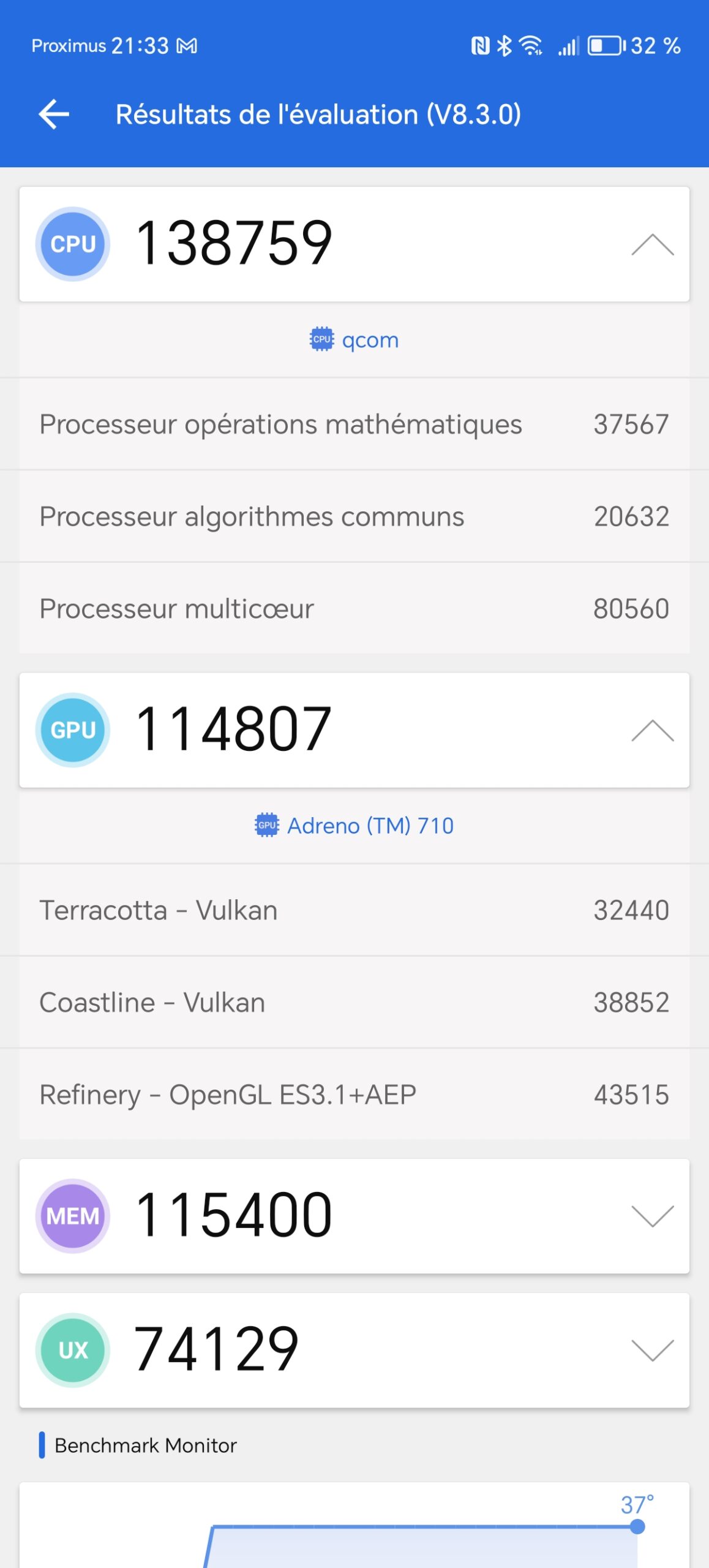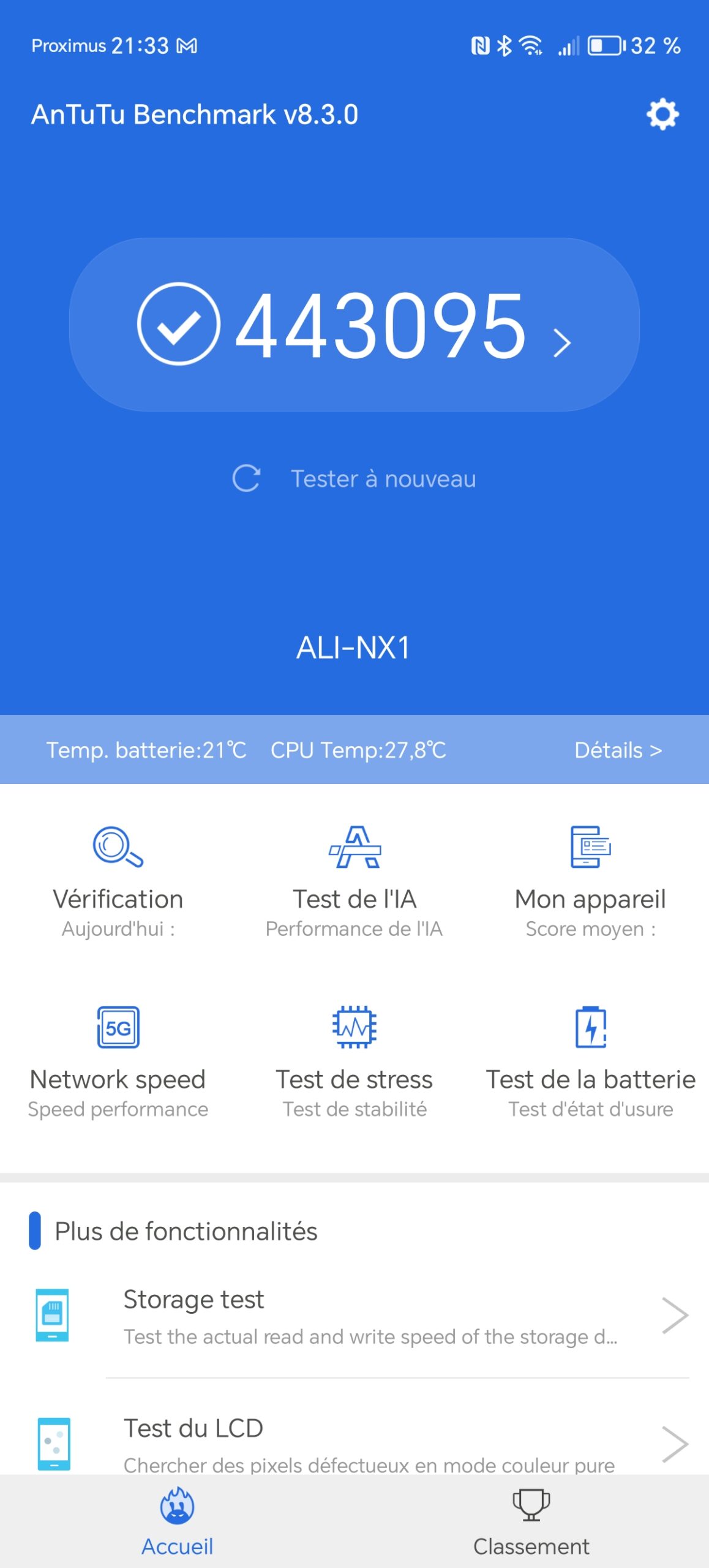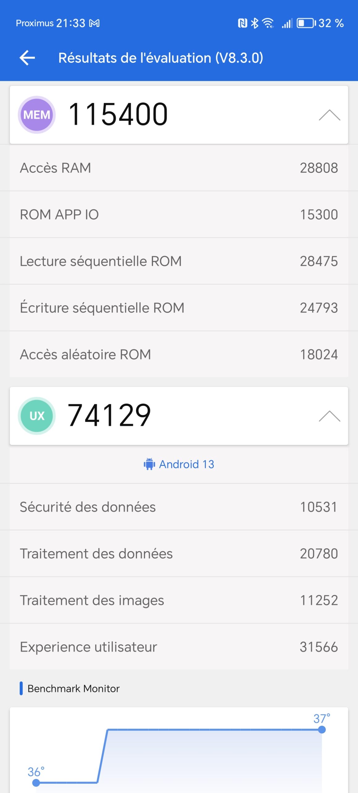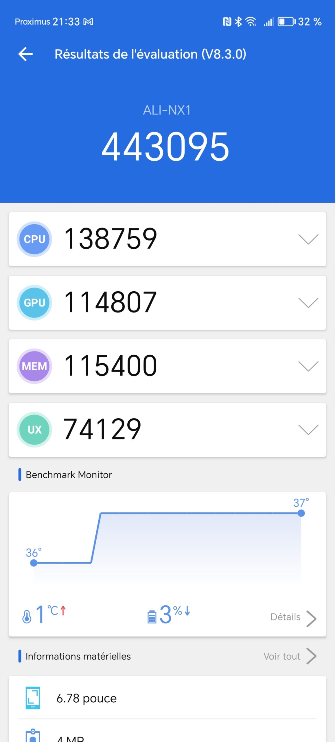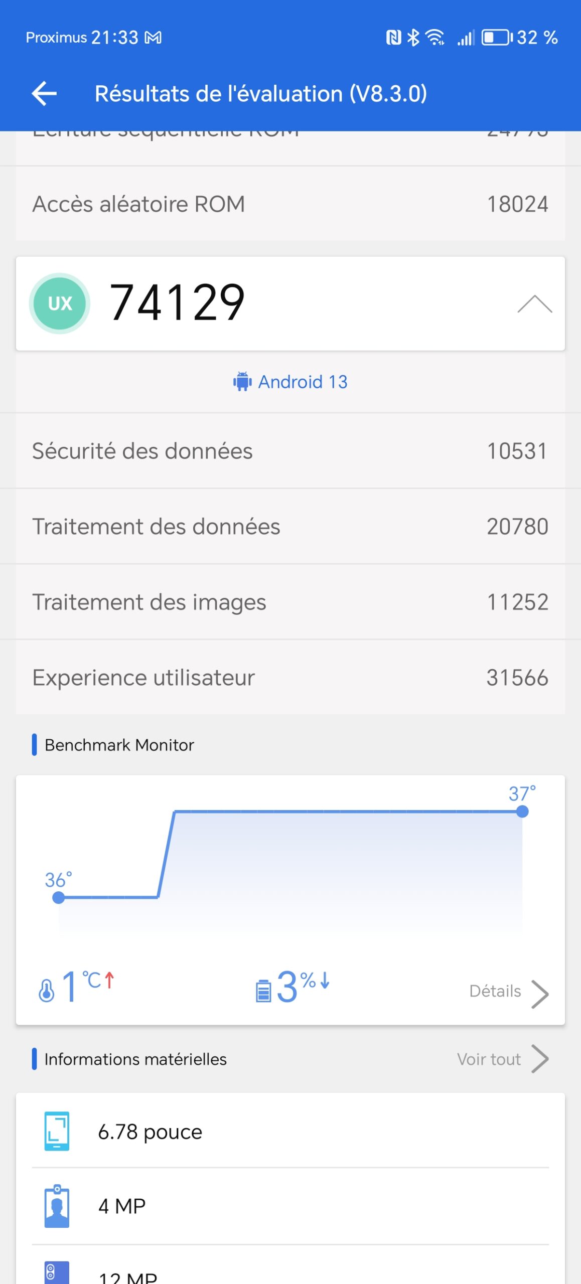 J'ai obtenu un score de 443095 points avec Antutu v8, ce score situe le Honor Magic6 Lite à un niveau de performance similaire au Redmi Note 12 Pro et c'est largement suffisant pour la grande majorité des utilisateurs. Ce niveau de performance permet d'obtenir un téléphone parfaitement fluide pour une utilisation quotidienne, la plupart des jeux et applications fonctionneront sans problèmes. Ceux qui voudrait jouer avec le niveau maximal de détails devront sans doute s'orienter vers un téléphone un peu plus performant comme par exemple le Poco X6.La température du téléphone a gagné un degré sur la durée du test, c'est une bonne indication sur la capacité du téléphone à dissiper la chaleur. Le test de charge associé au test de batterie confirmera sans doute ce premier aperçu.