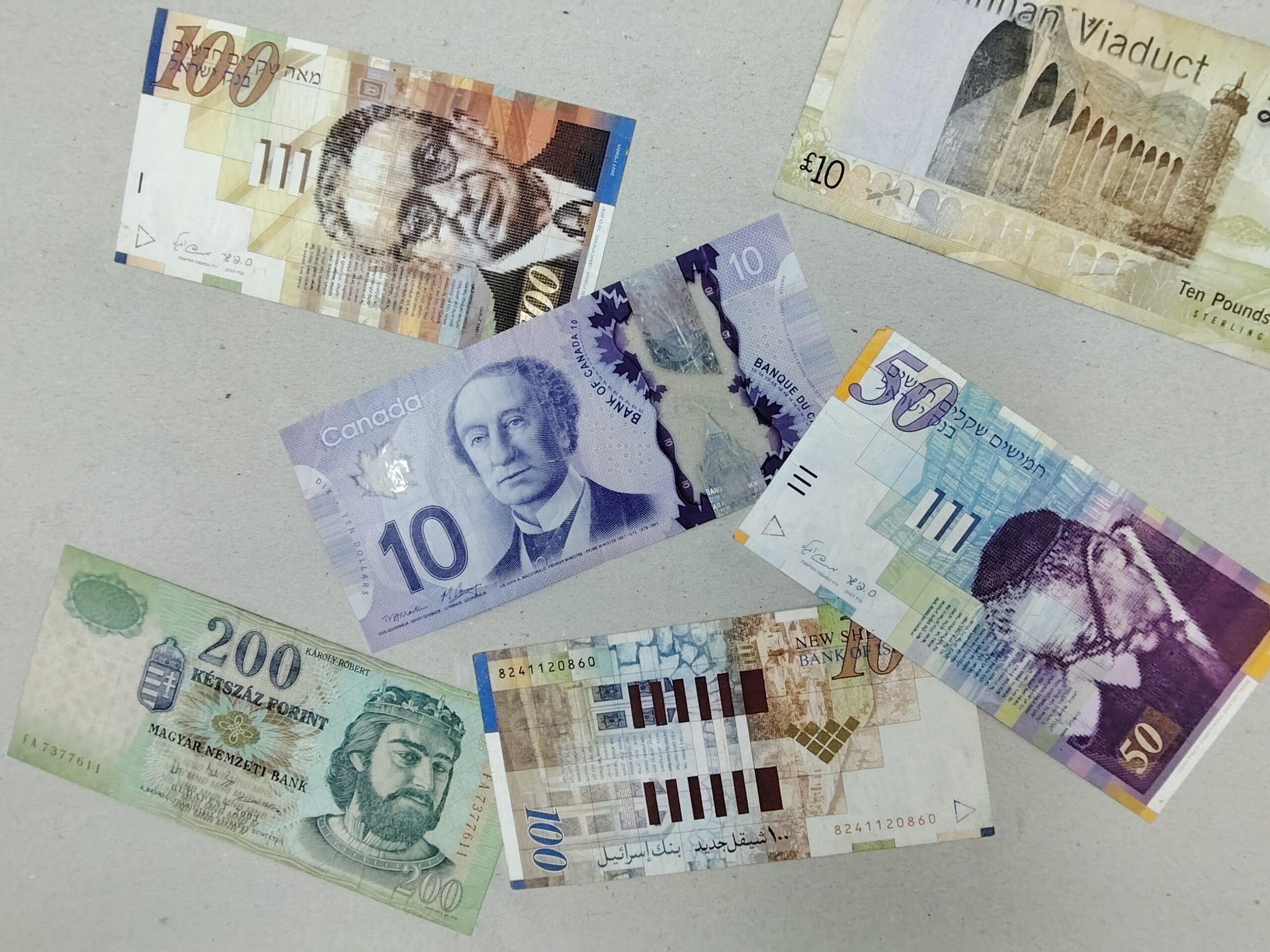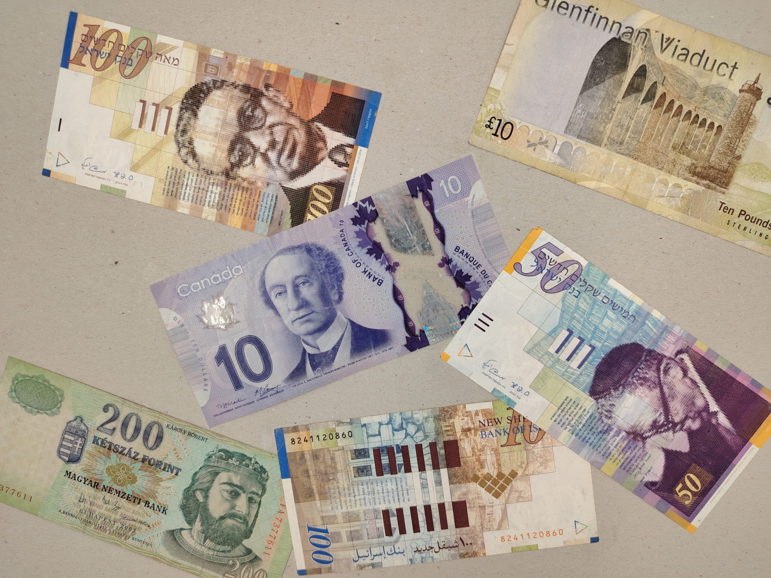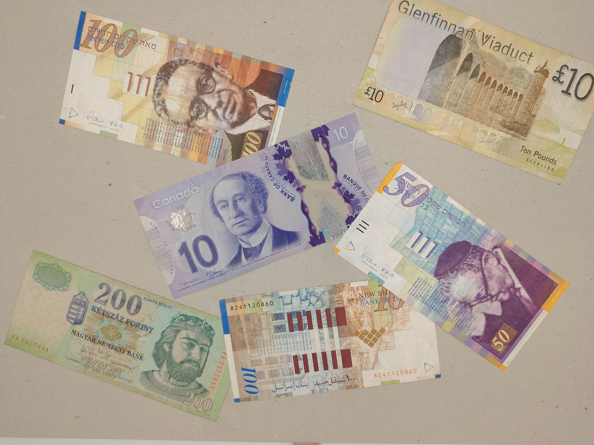 Ce test photo permet d'évaluer la netteté des détails et c'est plutôt réussi parce que le texte du billet Canadien est parfaitement lisible même si je zoome au delà de 100%. Le niveau de détail se dégrade un peu en périphérie mais c'est à peine visible, les billets israéliens et hongrois fourmillent de détails.