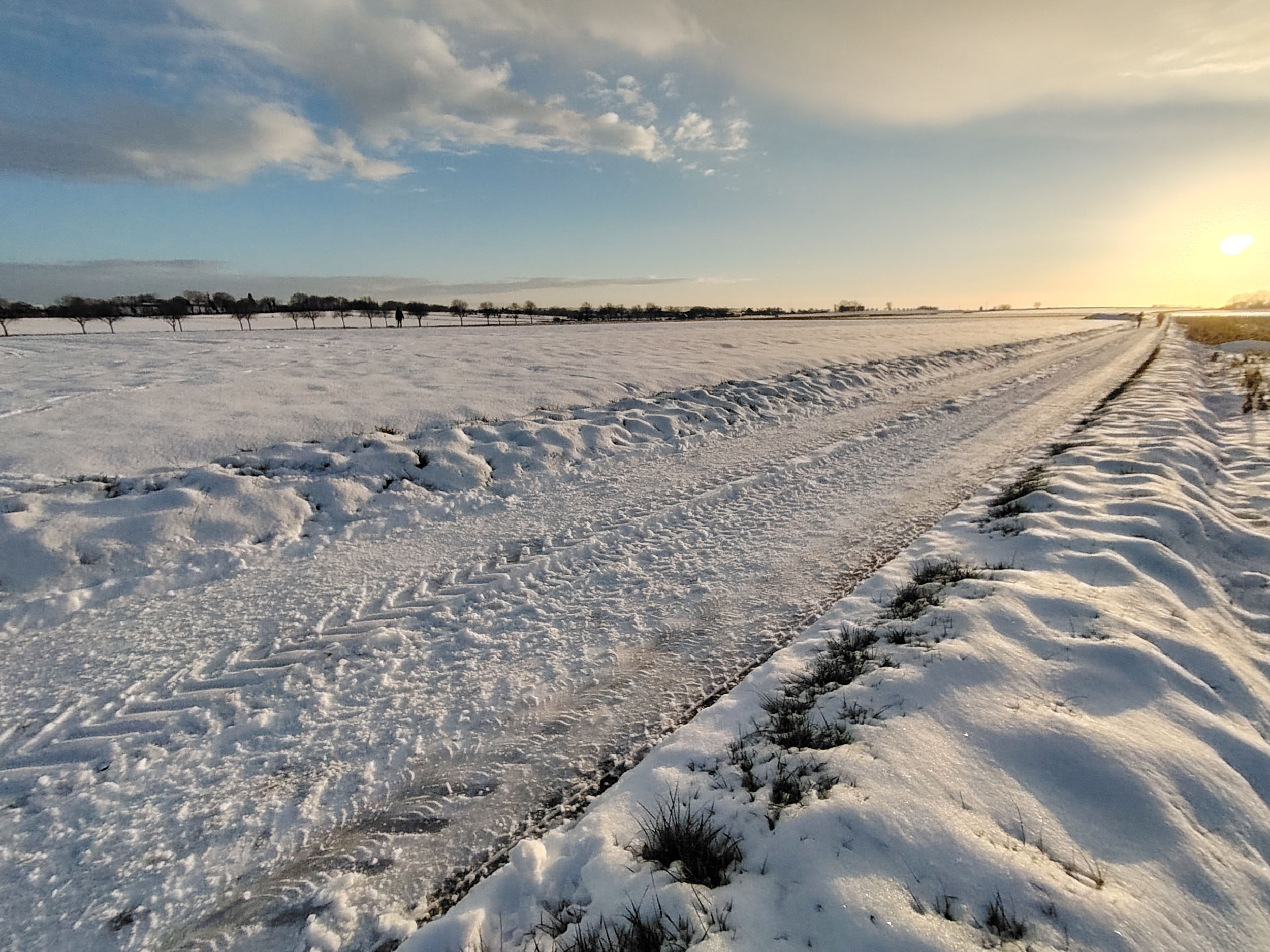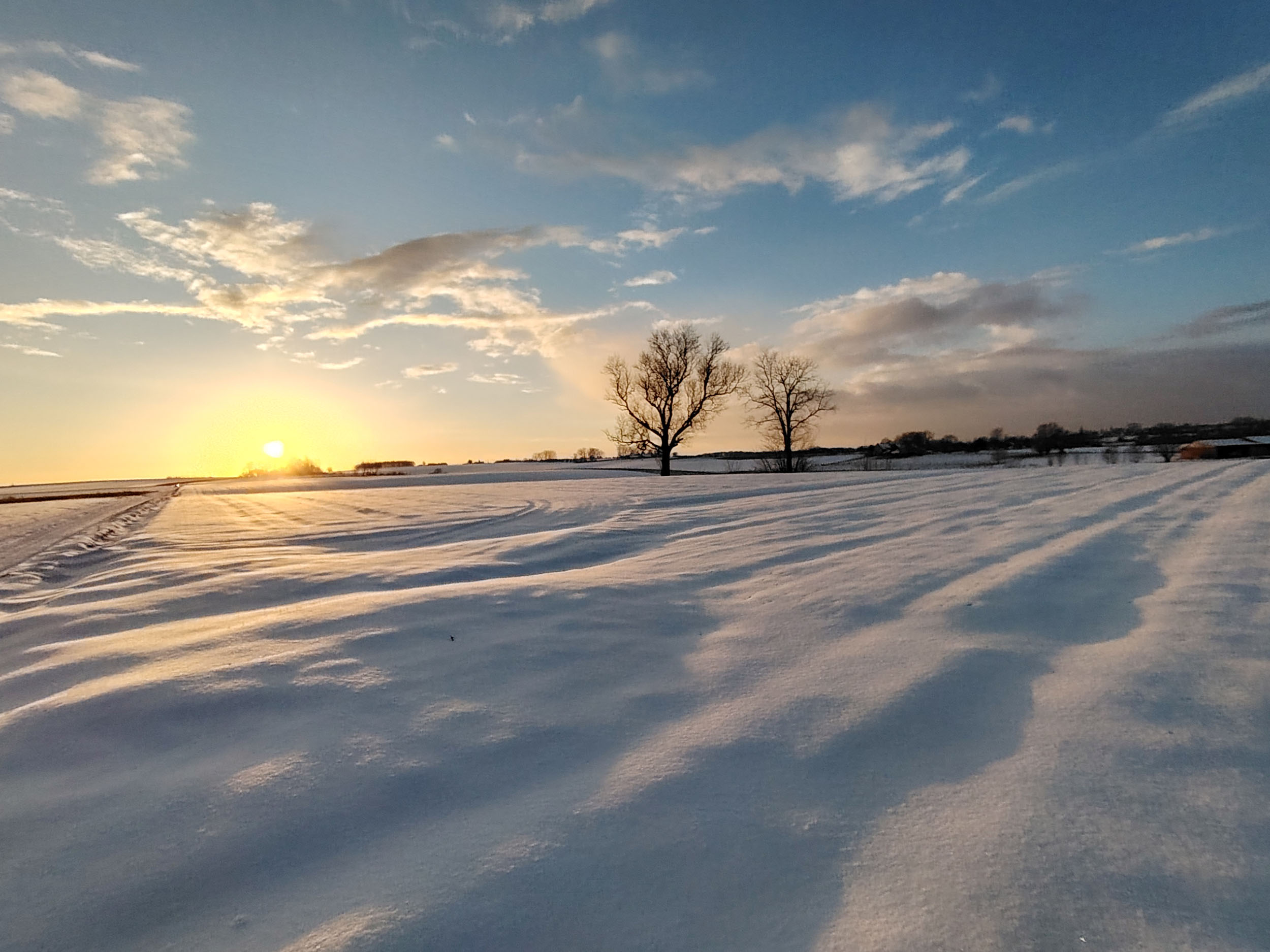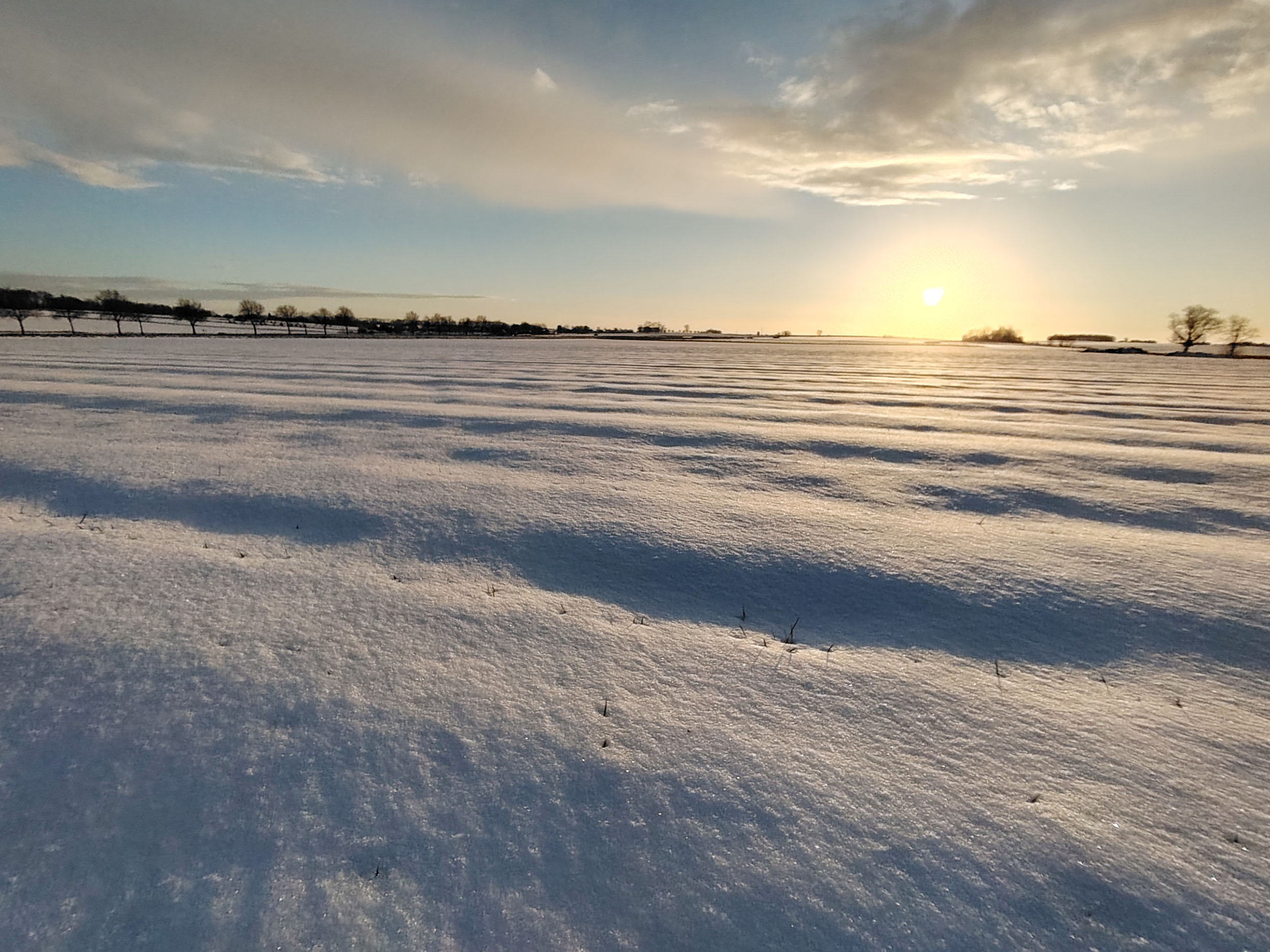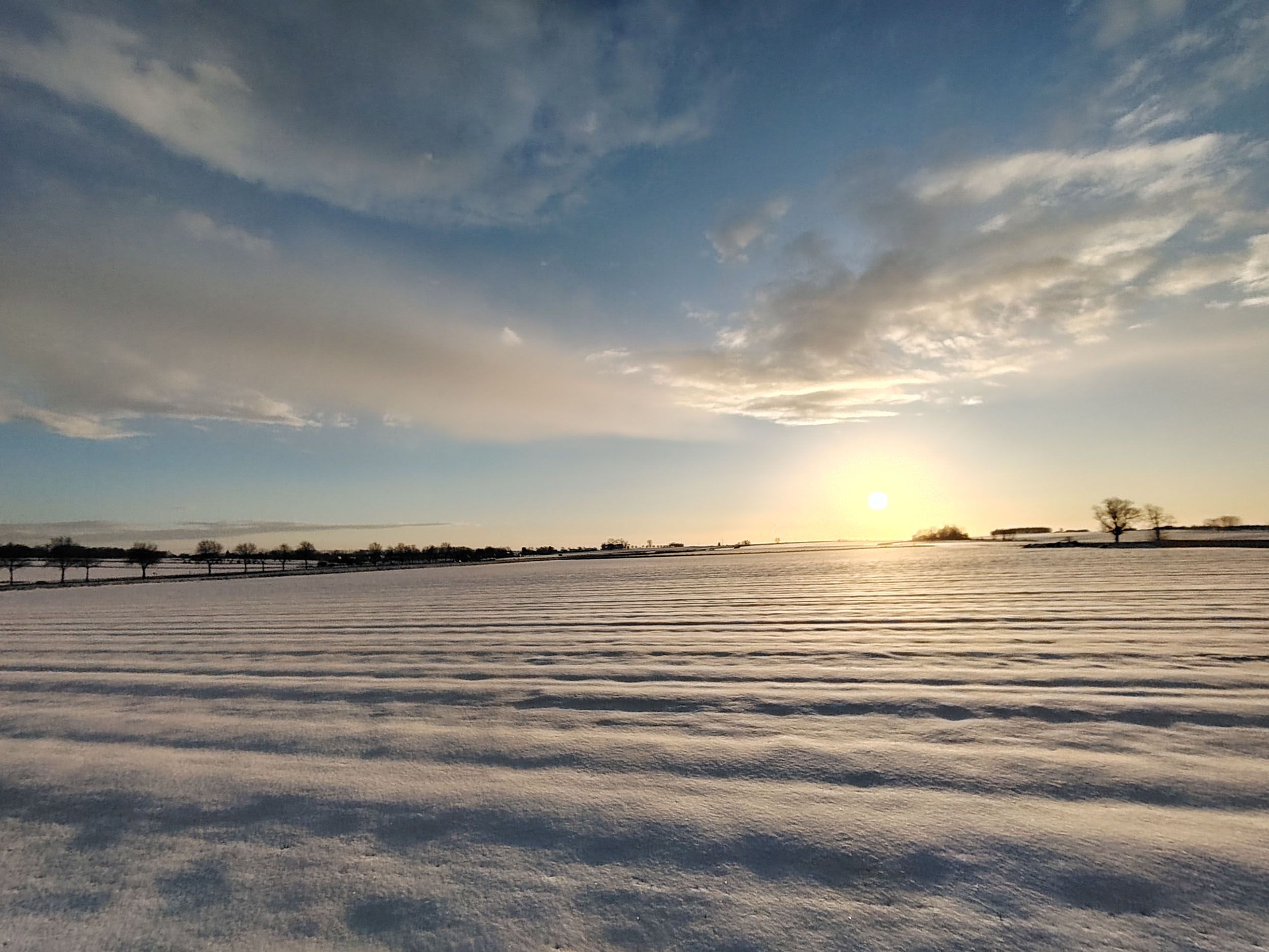 Pas facile de tester la qualité photo d'un téléphone quand la météo rend les déplacements en voiture plus difficile. Je n'ai pas pu faire des photos à l'endroit habituel mais ce n'est pas très grave finalement, les paysages sous la neige au coucher du soleil étaient tout aussi intéressants. Je trouve que cette photo est assez idyllique avec son ambiance chaleureuse et ses couleurs douces. En réalité, l'ambiance est moins chaude et je ne parle pas de la température. Si vous observez la neige, elle prend une coloration presque violette par endroit alors qu'elle devrait plutôt être orangée. Le soleil apparait comme une gigantesque boule de feu, c'est très joli mais en réalité le soleil n'occupe qu'une petite partie du ciel. Ceci montre que le téléphone n'a pas une plage dynamique suffisante pour couvrir toutes les différences de luminosité. L'utilisation du HDR permet de rémedier à ce problème, il y a quelques exemples dans la galerie photo ci-dessous.