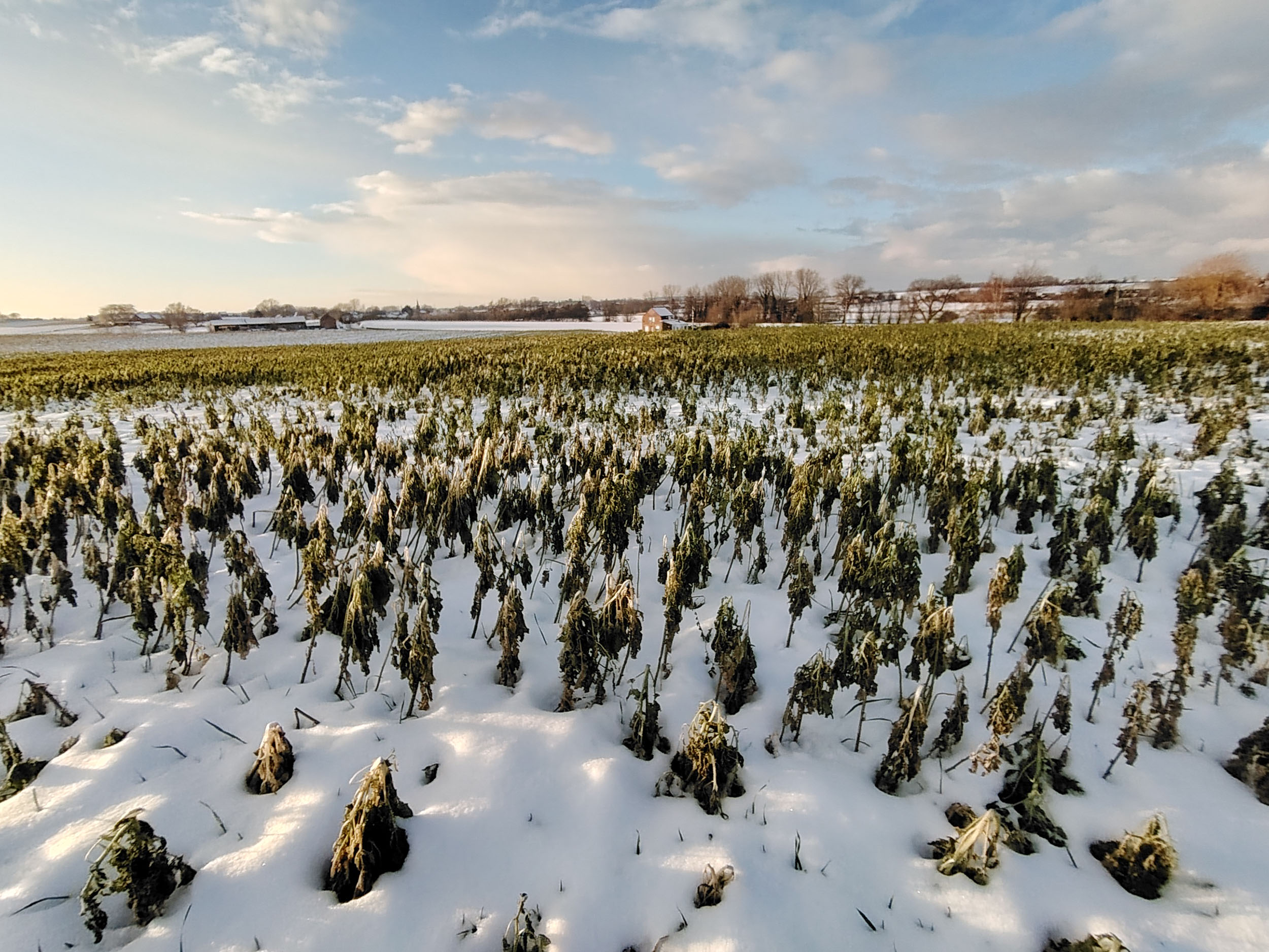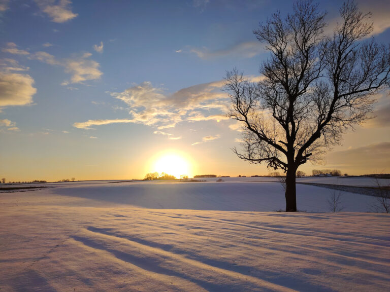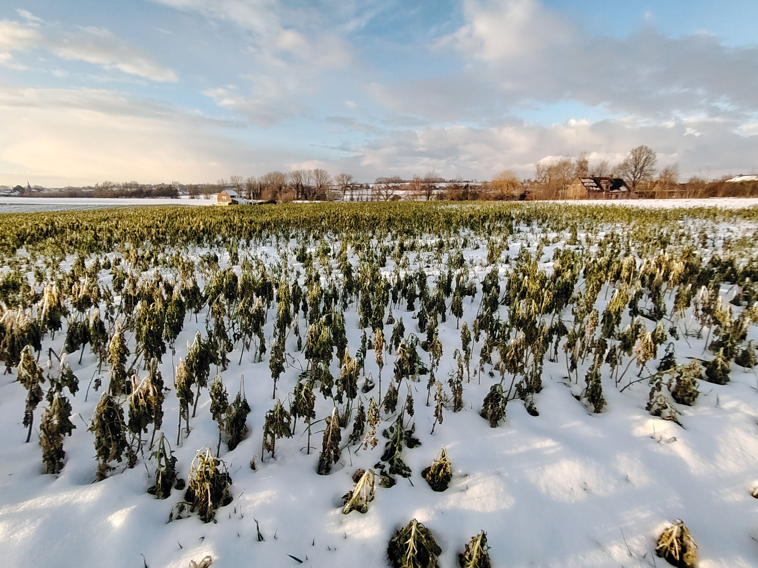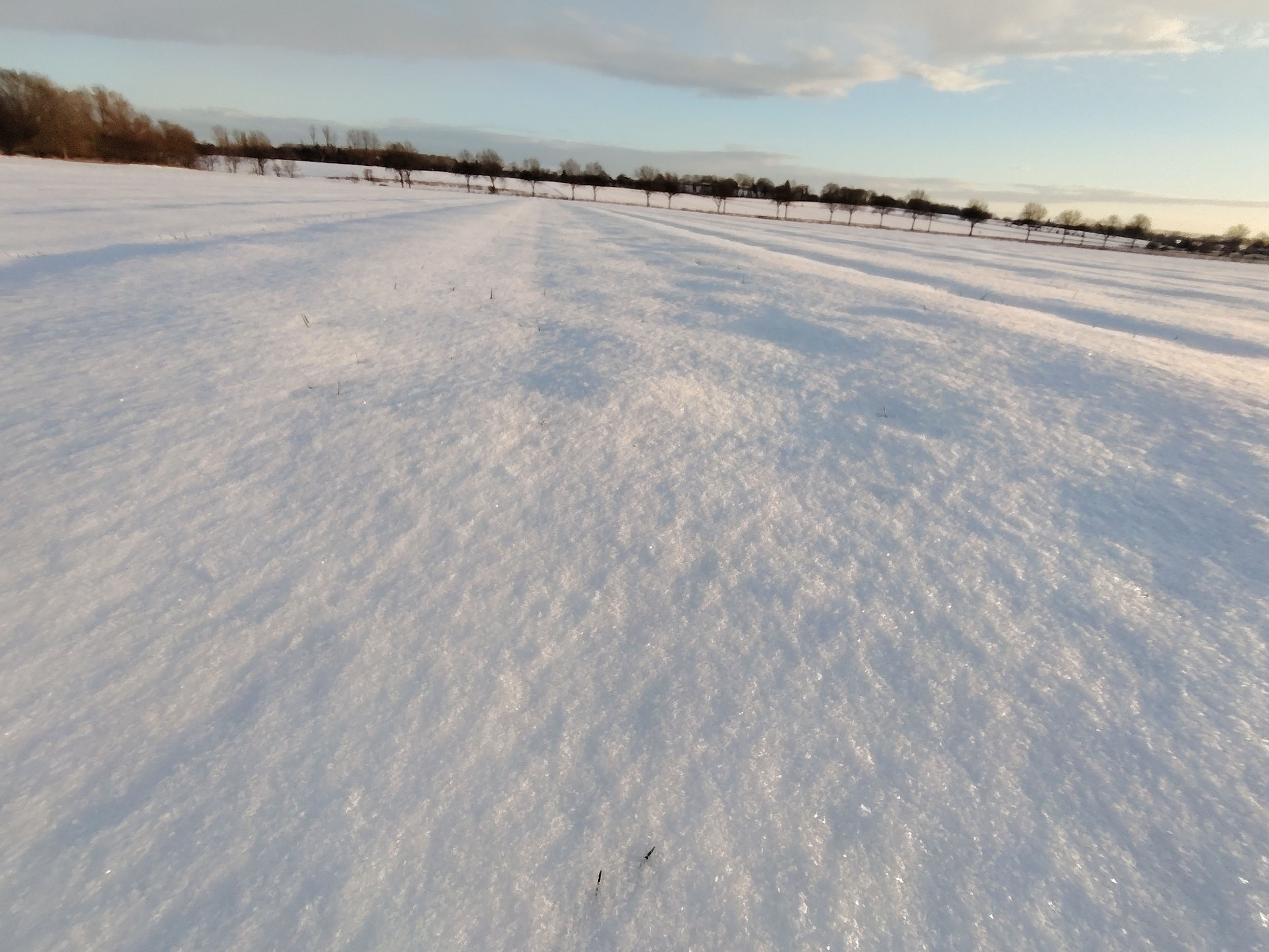 Pas facile de tester la qualité photo d'un téléphone quand la météo rend les déplacements en voiture plus difficile. Je n'ai pas pu faire des photos à l'endroit habituel mais ce n'est pas très grave finalement, les paysages sous la neige au coucher du soleil étaient tout aussi intéressants. Je trouve que cette photo est assez idyllique avec son ambiance chaleureuse et ses couleurs douces. En réalité, l'ambiance est moins chaude et je ne parle pas de la température. Si vous observez la neige, elle prend une coloration presque violette par endroit alors qu'elle devrait plutôt être orangée. Le soleil apparait comme une gigantesque boule de feu, c'est très joli mais en réalité le soleil n'occupe qu'une petite partie du ciel. Ceci montre que le téléphone n'a pas une plage dynamique suffisante pour couvrir toutes les différences de luminosité. L'utilisation du HDR permet de rémedier à ce problème, il y a quelques exemples dans la galerie photo ci-dessous.