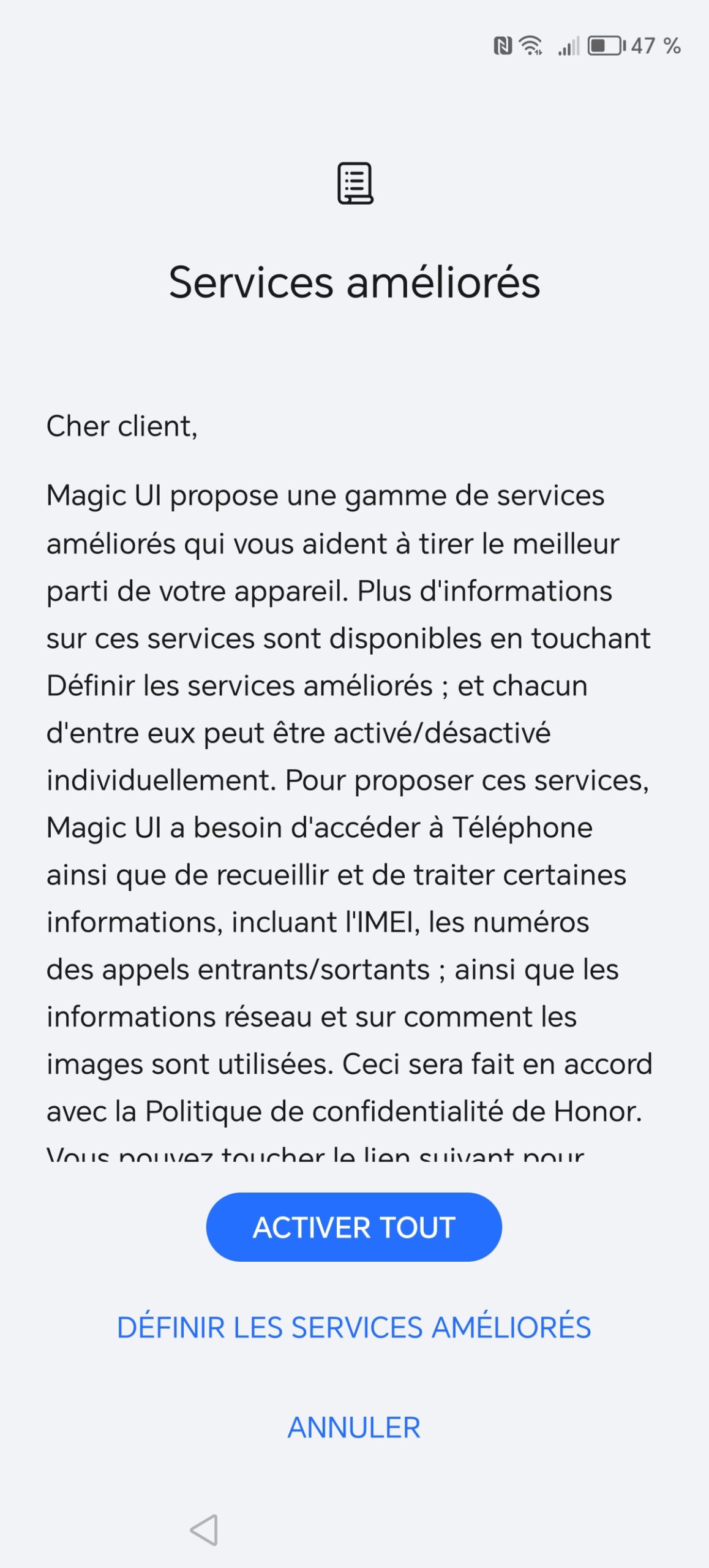 Je trouve que l'interface graphique est plus soignée que l'interface de base d'Android mais ça c'est une question de gout. Tout est plus espacé que l'interface de base. Les écrans sont pour la plupart assez similaire mais on retrouve la touche "Honor" un peu partout. Les paramètres sont organisés de façon un peu différente et parfois certains menus ont une hiérarchie assez profonde mais à priori, la grande majorité des utilisateurs n'ira jamais jusque là.