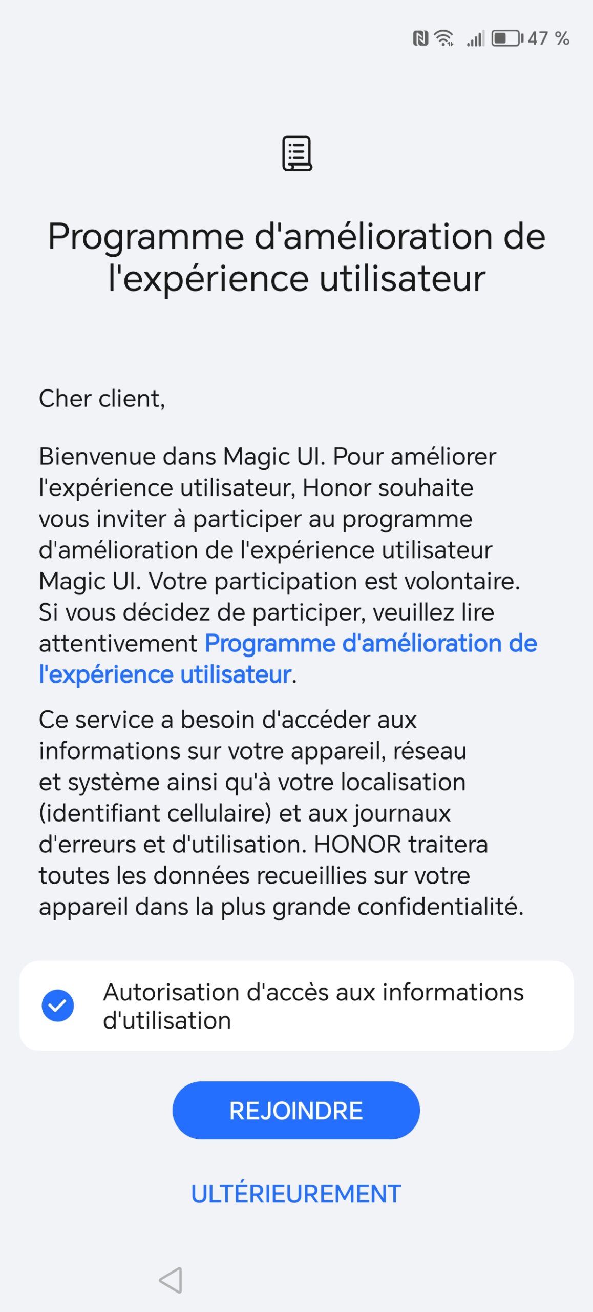 La configuration initiale du téléphone reprend dans les grandes lignes la configuration d'Android et elle est presque totalement similaire à ce que j'ai vu sur le Honor 90 Lite mais il y a une chose qui a changé et pas forcément dans la bonne direction. Honor va essayer de vous inciter à créer un compte Honor et bien que je comprenne leur intention, éviter de s'inscrire est plus compliqué. La création d'un compte Honor n'est pas nécessaire au fonctionnement du téléphone et comme j'utilise un compte Google pour toutes mes données, je n'ai pas besoin ni envie de créer un compte supplémentaire. Xiaomi faisait la même chose il y a 2 ans mais ils ont laissé tomber cette pratique, je suppose qu'il faudra attendre encore un peu pour que Honor suive le même chemin.Finition