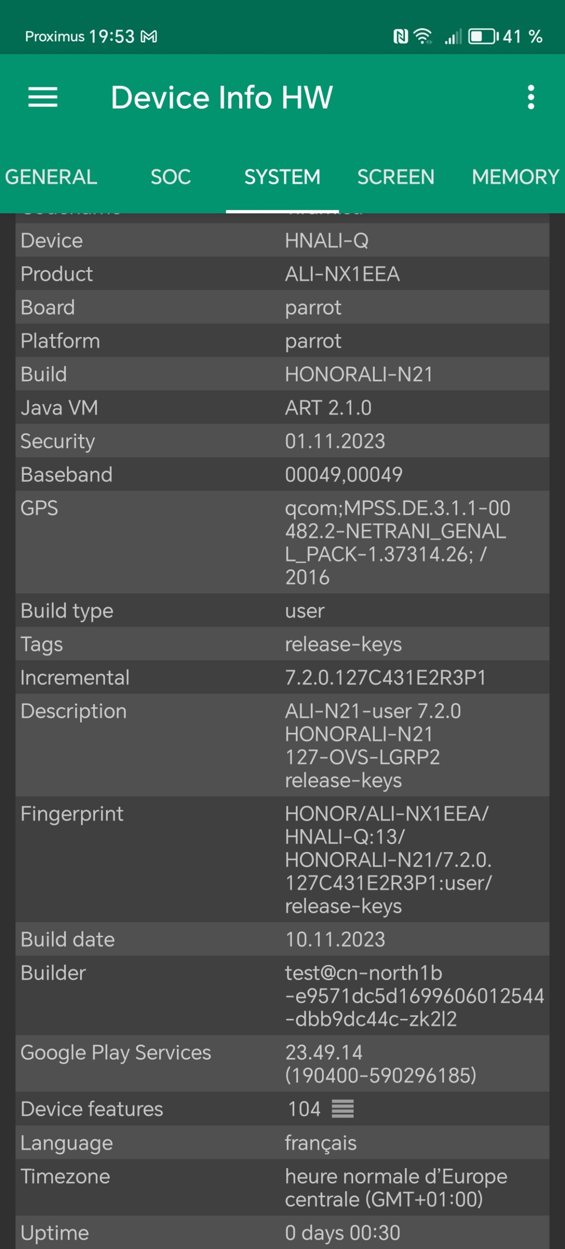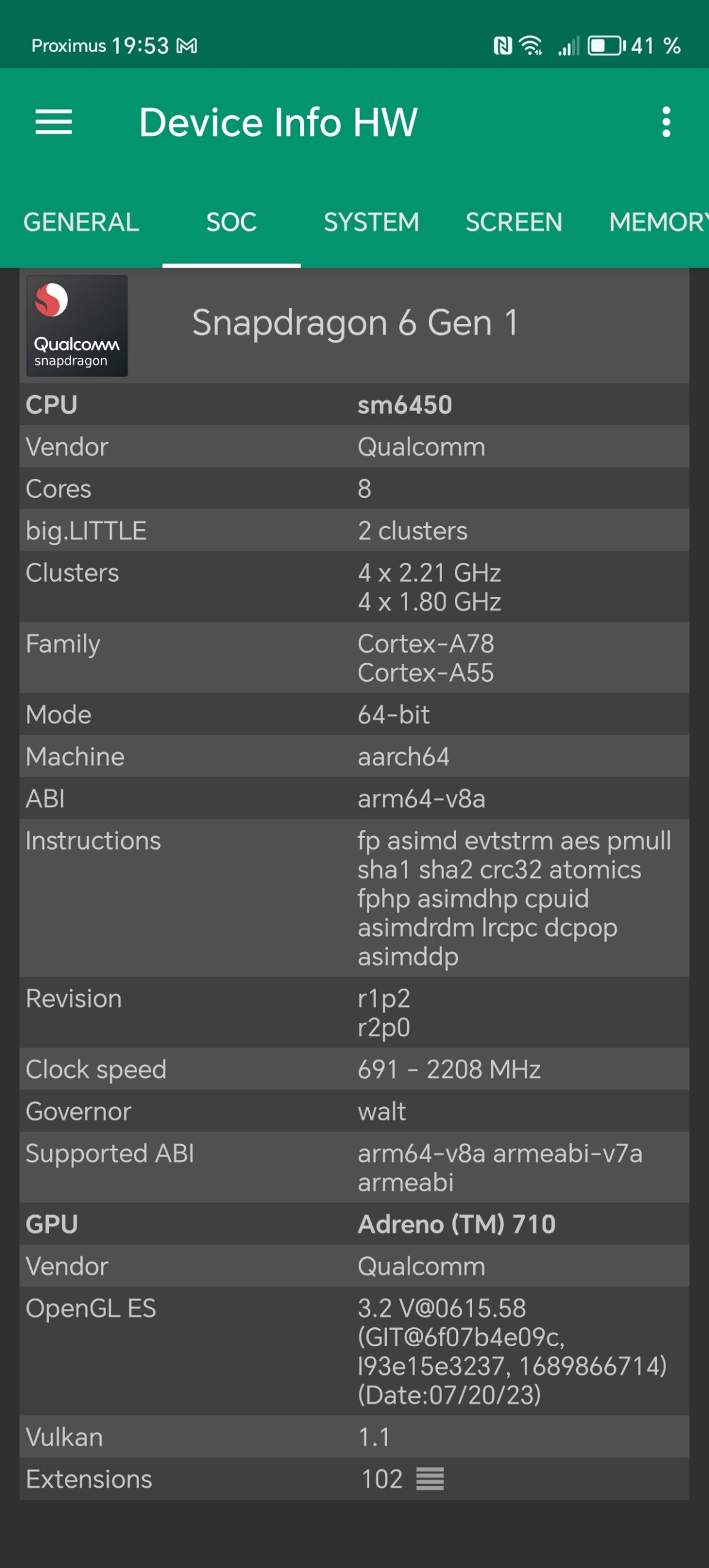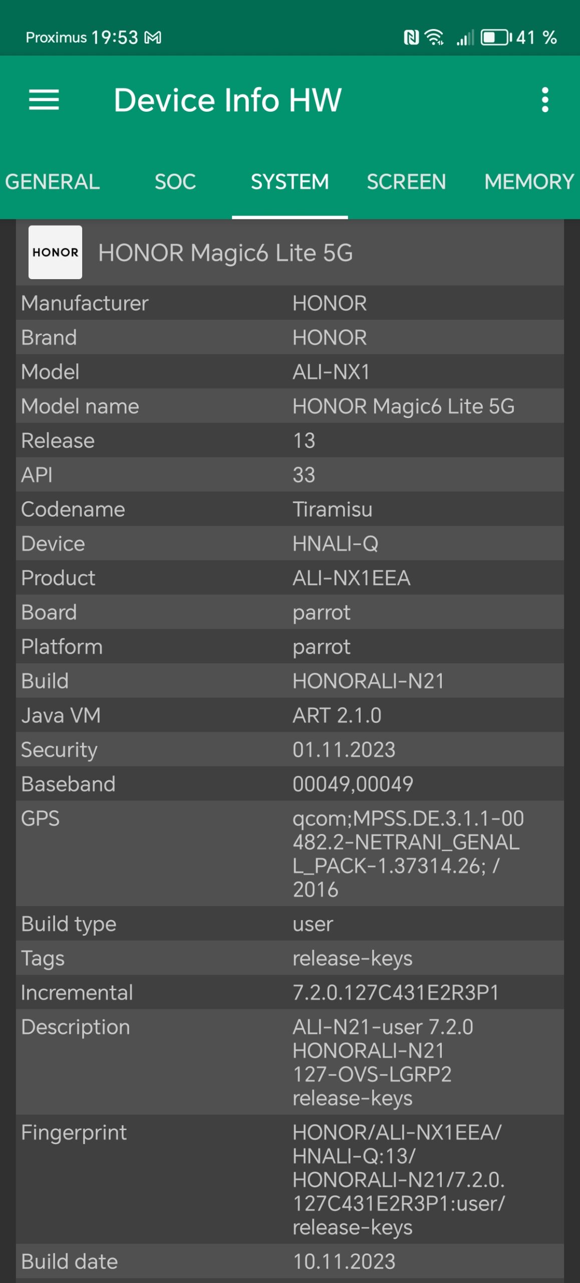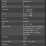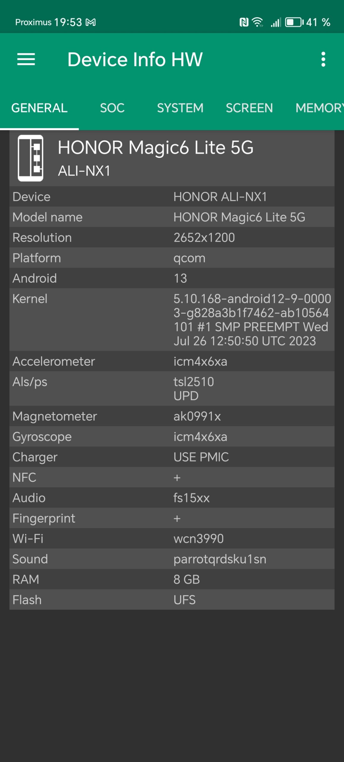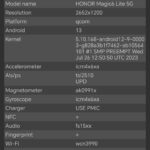 Les informations ci-dessous proviennent de l'application Device Info HW. L'application fournit des informations techniques détaillées sur le téléphone testé.Le Honor Magic6 Lite 5G que j'ai testé avait 8 Gb de mémoire vive et 256 Gb de mémoire de stockage. Ce téléphone utilise une architecture Snapdragon de chez Qualcomm sur laquelle je reviendrai dans le prochain paragraphe. J'ai fait des captures d'écran avec toutes les caractéristiques techniques ci-dessous et j'ai noté les points suivants: