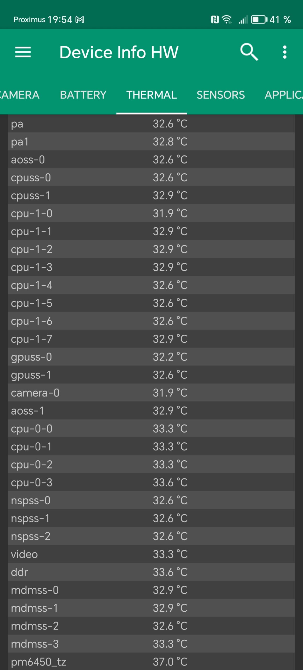 J'ai testé mon habituelle séquence en poussant d'abord le CPU au maximum, ensuite le GPU et puis le FPU pour terminer le test en poussant tous les composants à fond en même temps. Le CPU consomme un peu plus de 6 Watts lorsqu'il est utilisé tout seul, la température de la batterie reste stable et la température du CPU monte un peu au dessus de 40°C. Le GPU consomme un peu plus de 2.3 Watts, la température de la batterie reste stable et la température du CPU revient à la normale. Le FPU consomme un peu plus de 1.7 Watts et n'a pas d'incidence sur la température du téléphone.
