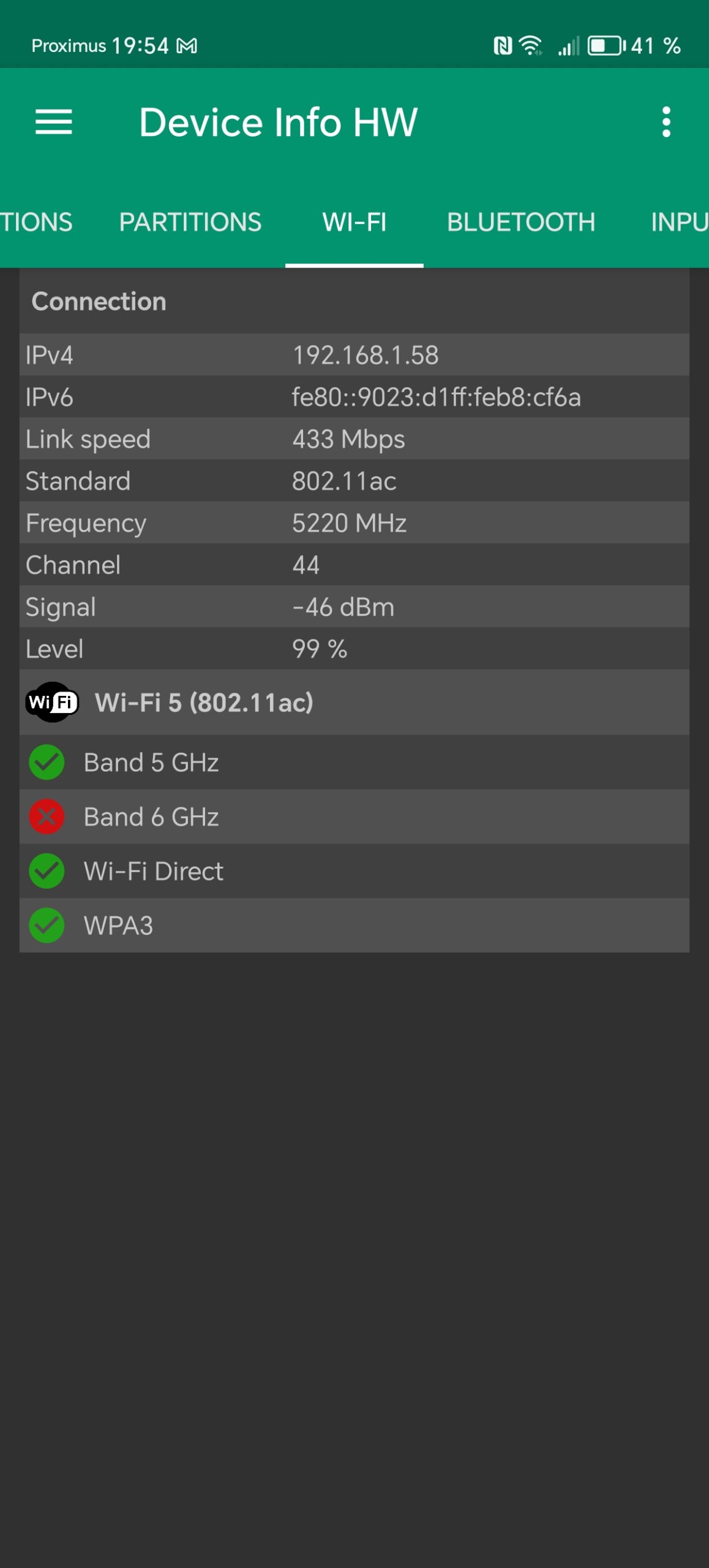 J'ai mesuré un signal moyen de -20 dBm à proximité du routeur et j'ai été assez surpris par cette mesure parce que même si ce n'est pas un mauvais signal, ce n'est pas non plus un signal extraordinaire. Je pense que c'est lié au nombre d'antennes wifi dans le téléphone. A distance par contre le signal était meilleur avec - 62 dBm.